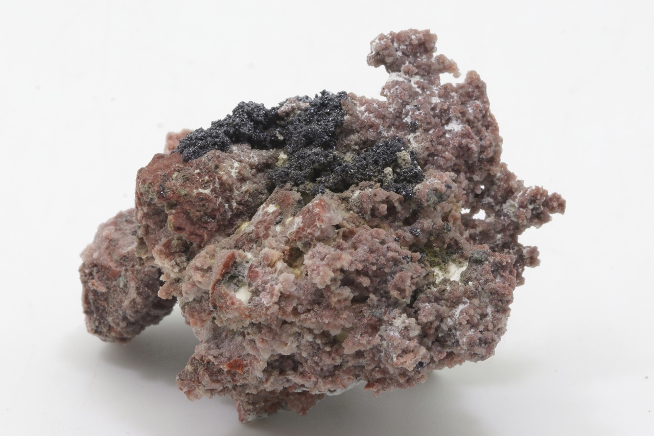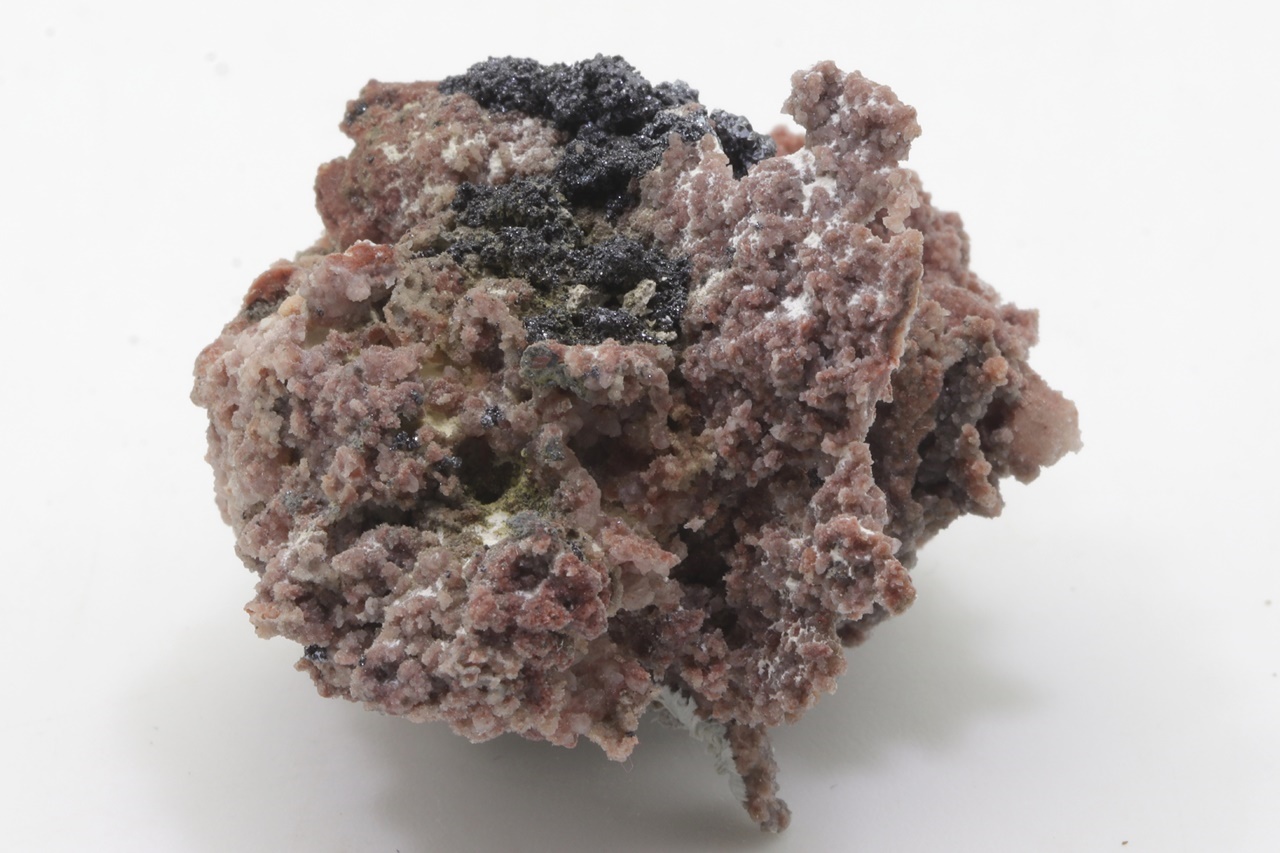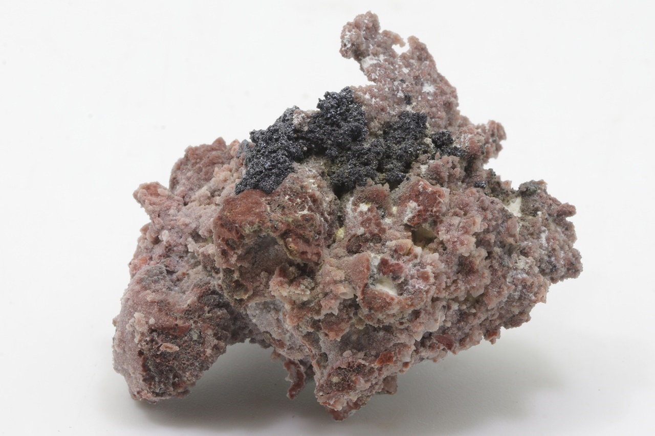 Großer Kristallcluster überzogen mit braunem Dolomit und einem Cluster von schwarzen Proustit-Kristallen.