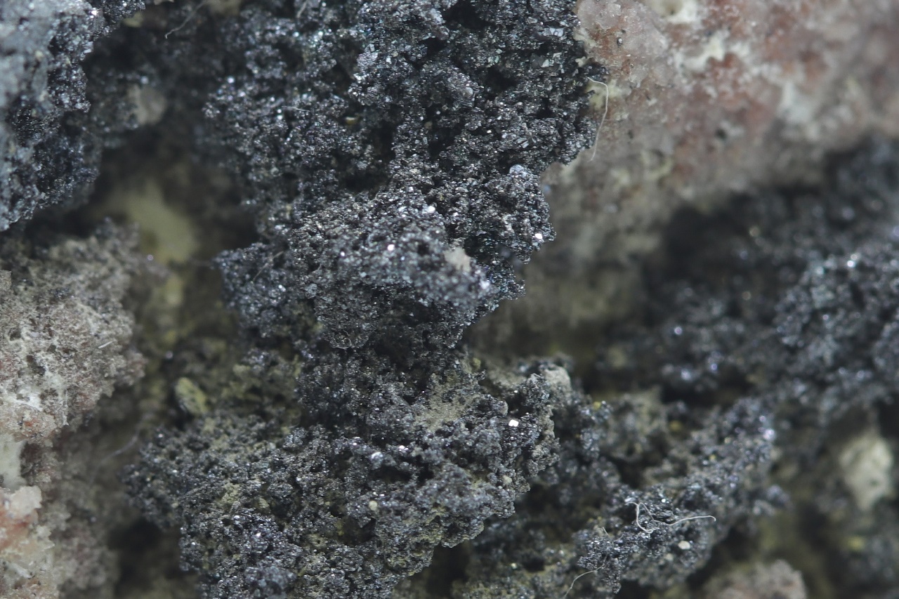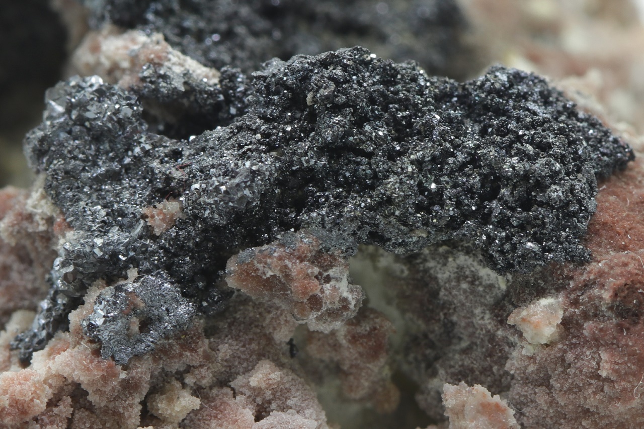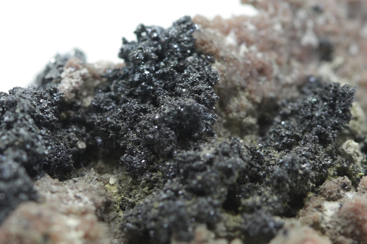Großer Kristallcluster überzogen mit braunem Dolomit und einem Cluster von schwarzen Proustit-Kristallen.