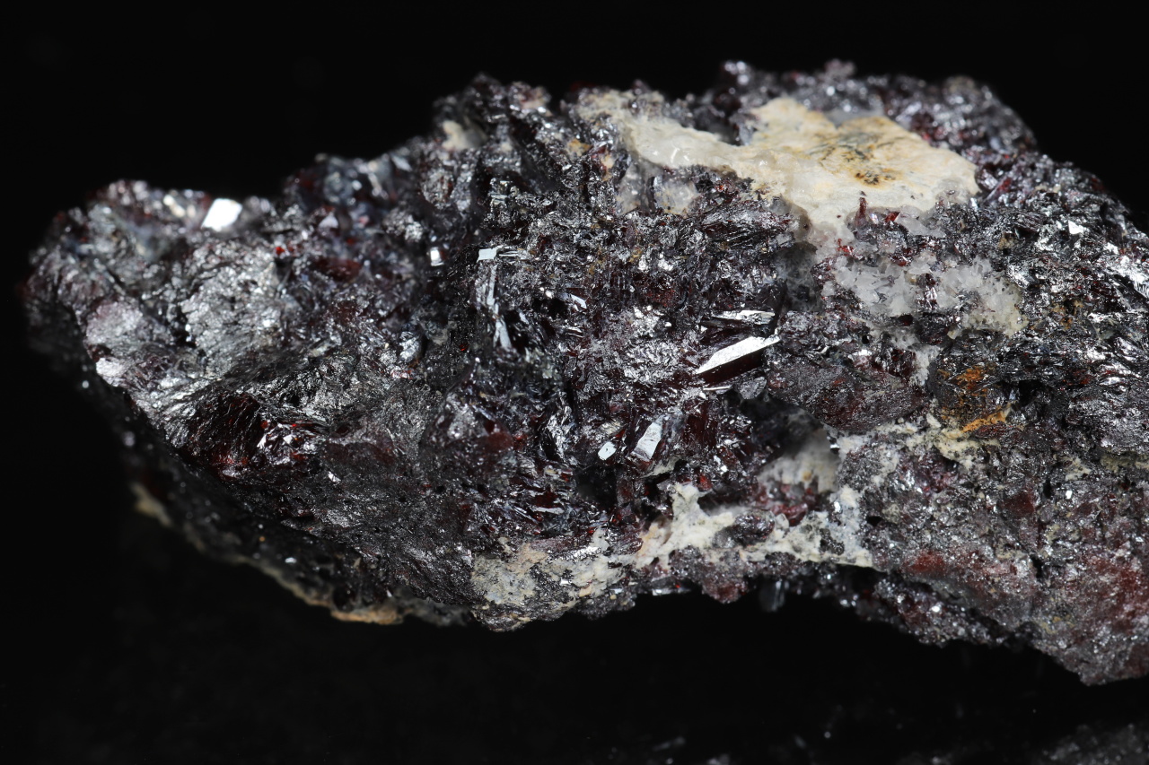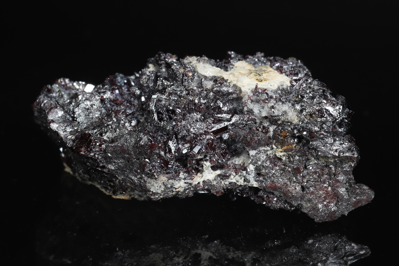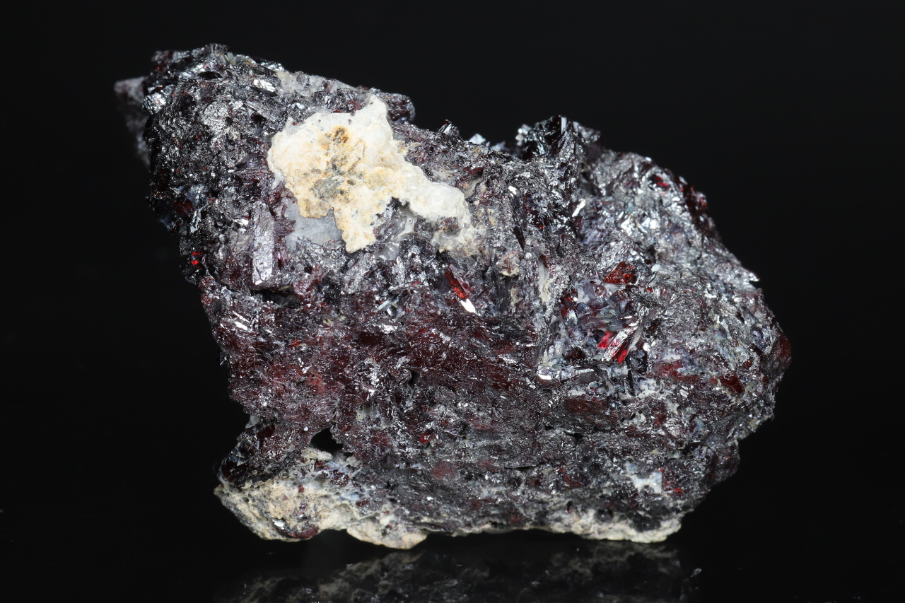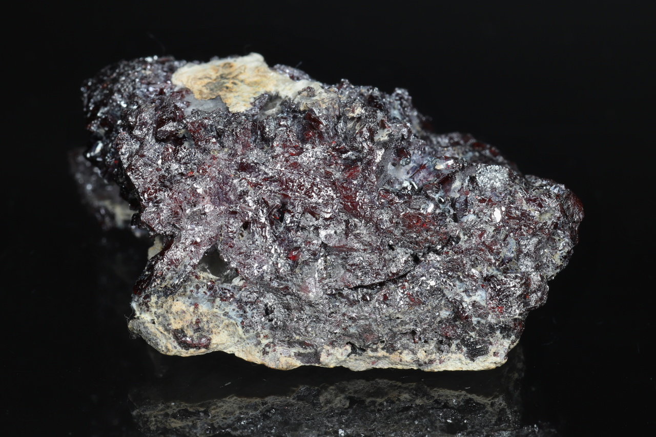 Ukázka masivního sytě červeného proustitu místy tvořícího sloupcovité krystaly. Pěkný vzorek ušlechtilé stříbrné rudy z Maroka.