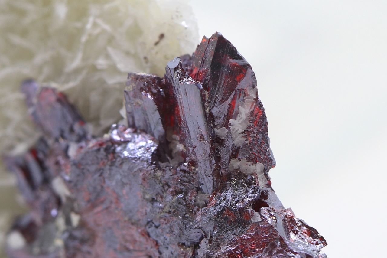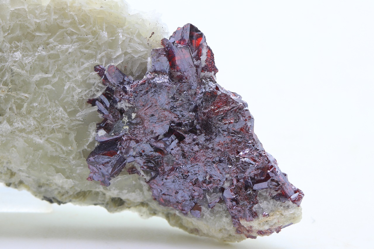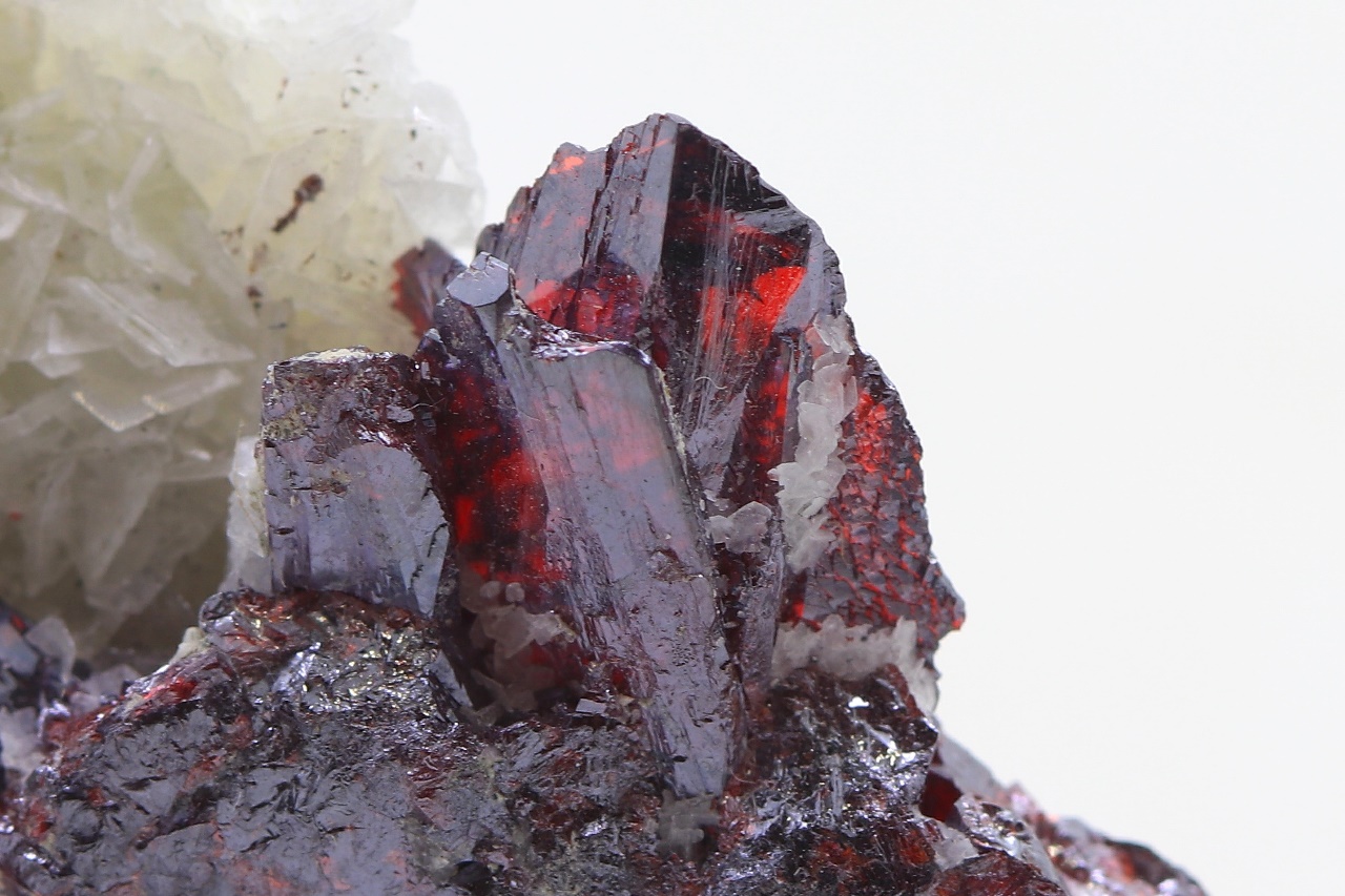 Kluster intensiv roter, durchsichtiger Proustit-Kristalle gewachsen auf weißem Calcit, zwischen denen der größte, 9 mm großer, heraussticht. Der Kristall ist auf der Rückseite abgesplittert.