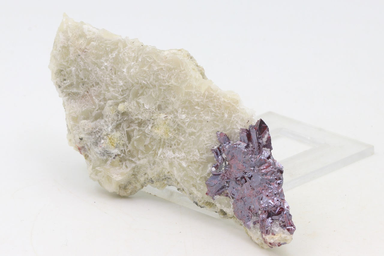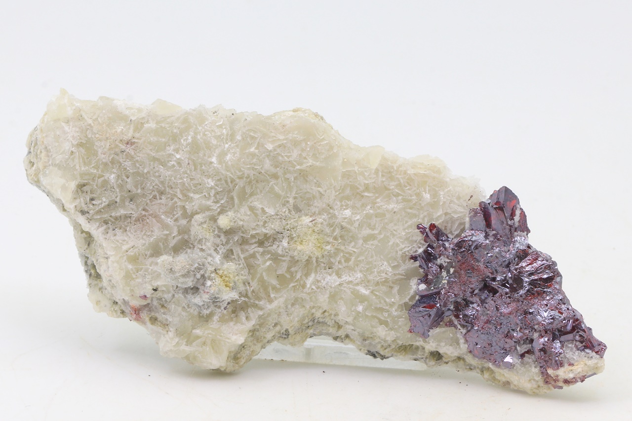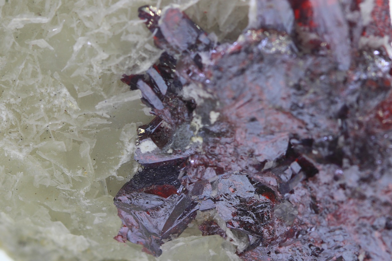Kluster intensiv roter, durchsichtiger Proustit-Kristalle gewachsen auf weißem Calcit, zwischen denen der größte, 9 mm großer, heraussticht. Der Kristall ist auf der Rückseite abgesplittert.