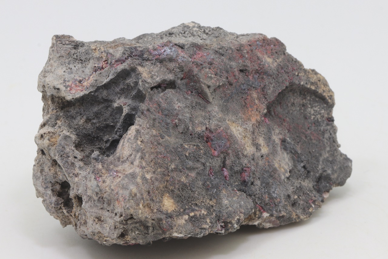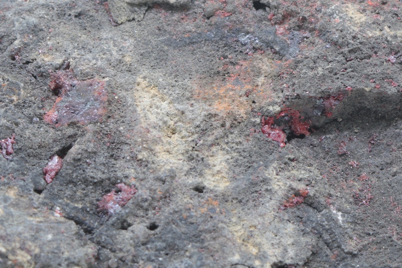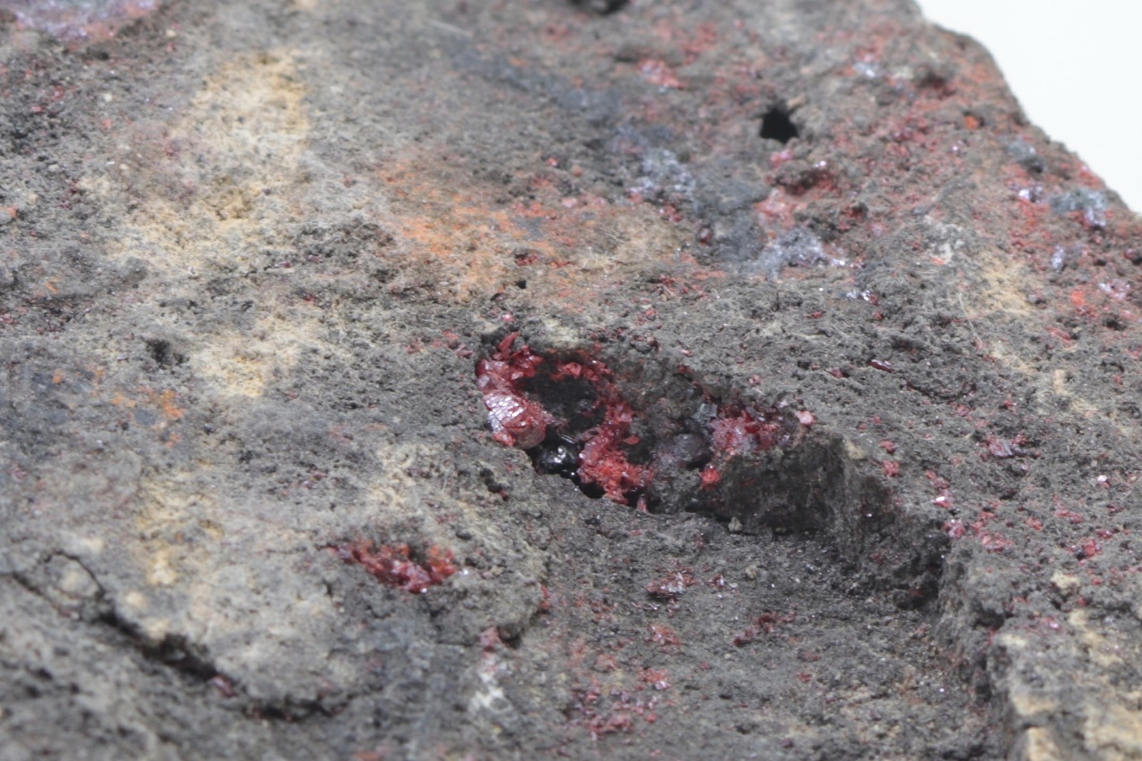 Krystalle von intensiv rotem Proustit in Aggregatform, gewachsen in Hohlräumen des schwarzen massiven Arsens.