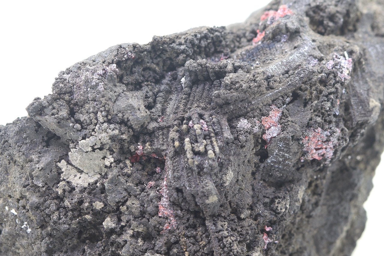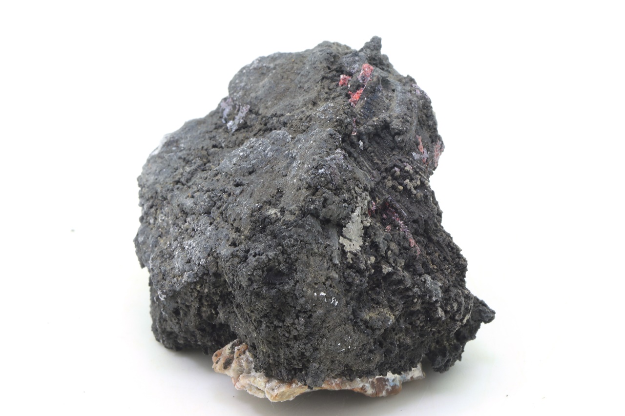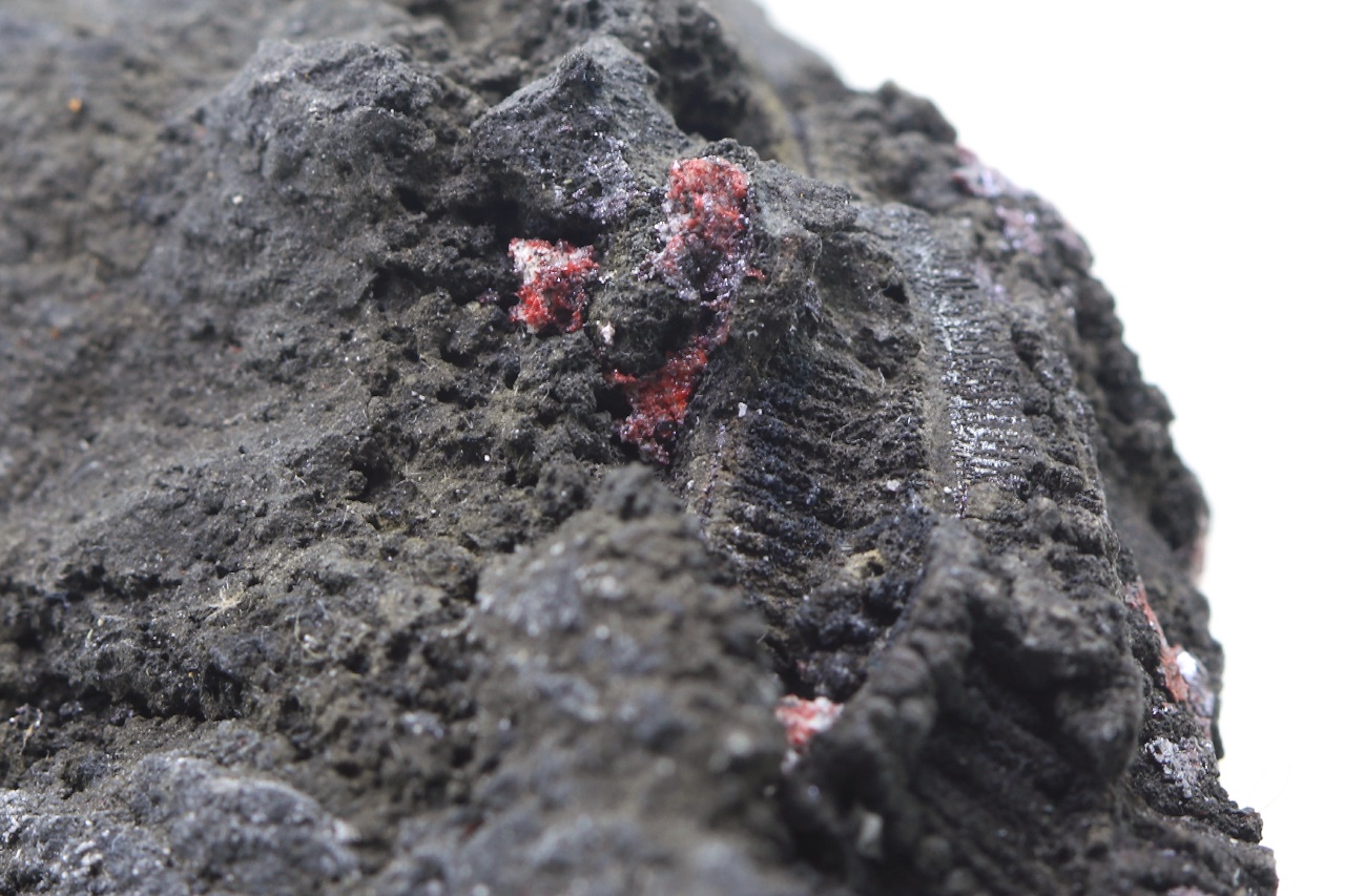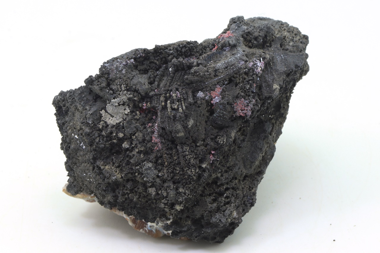 Schwarzer massiver Arsen mit stellenweise sichtbaren Perimorphosen nach dendritischem Silber mit rotem Proustit .