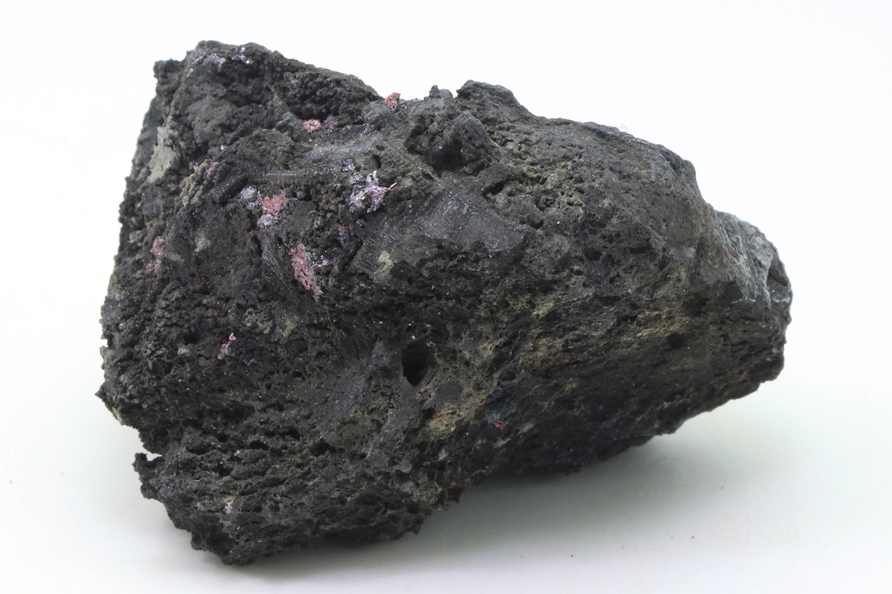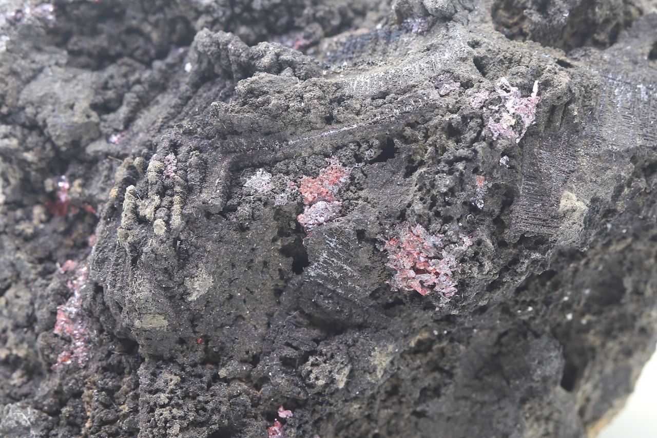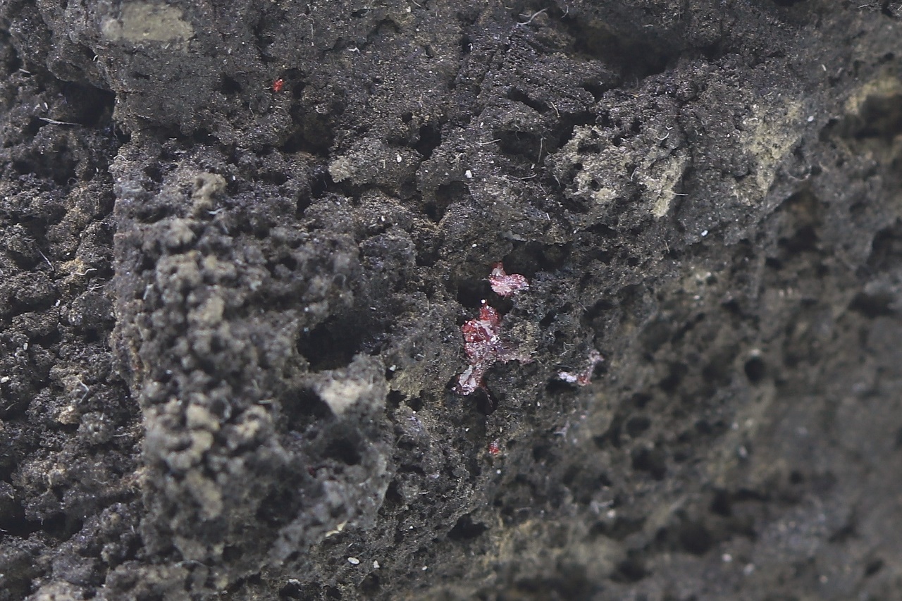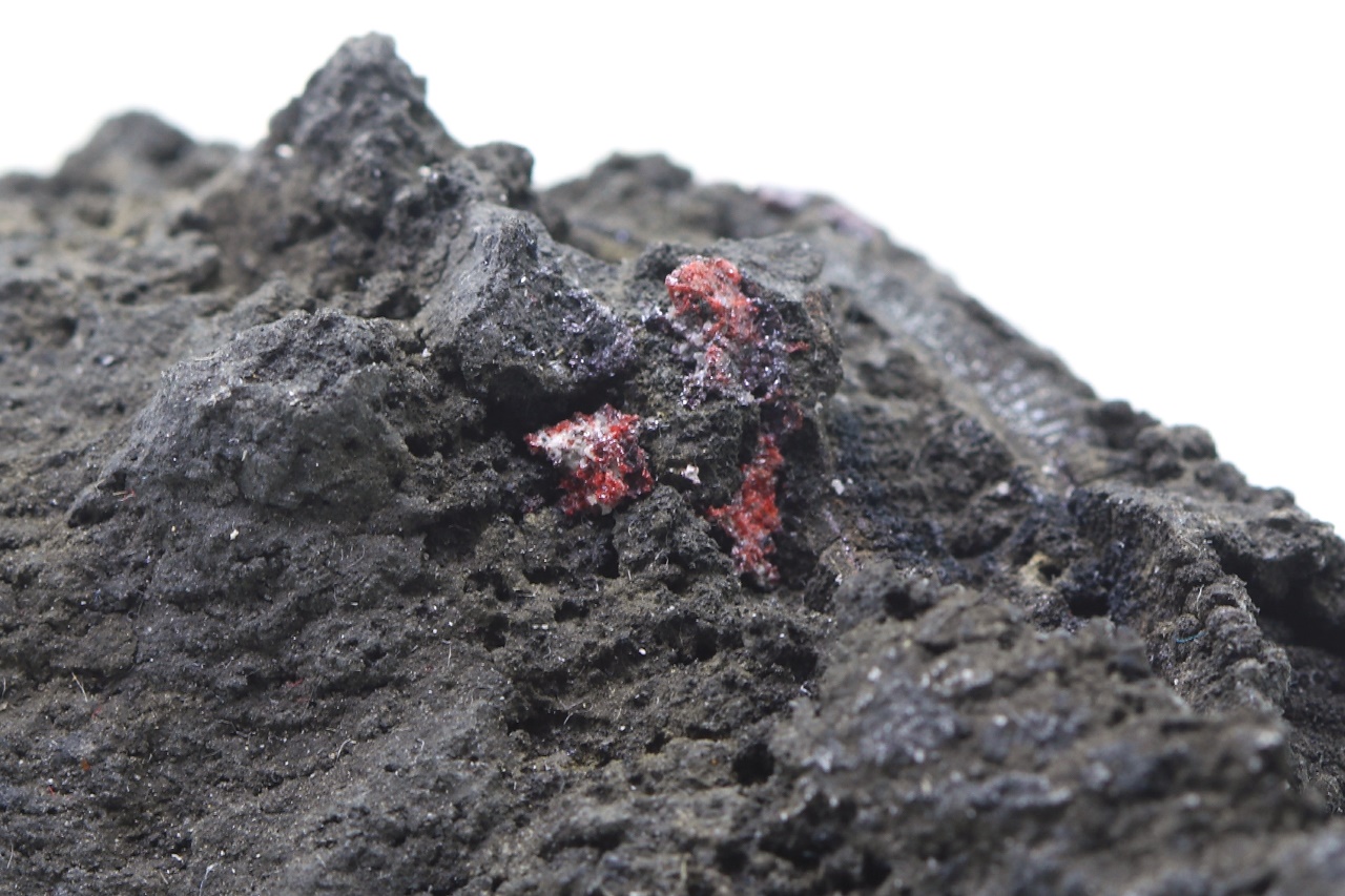 Schwarzer massiver Arsen mit stellenweise sichtbaren Perimorphosen nach dendritischem Silber mit rotem Proustit .