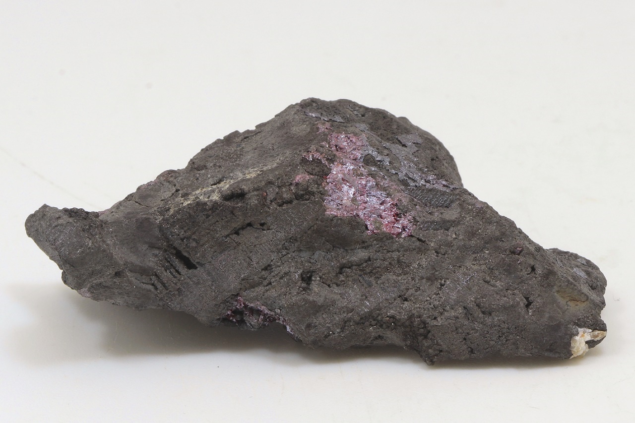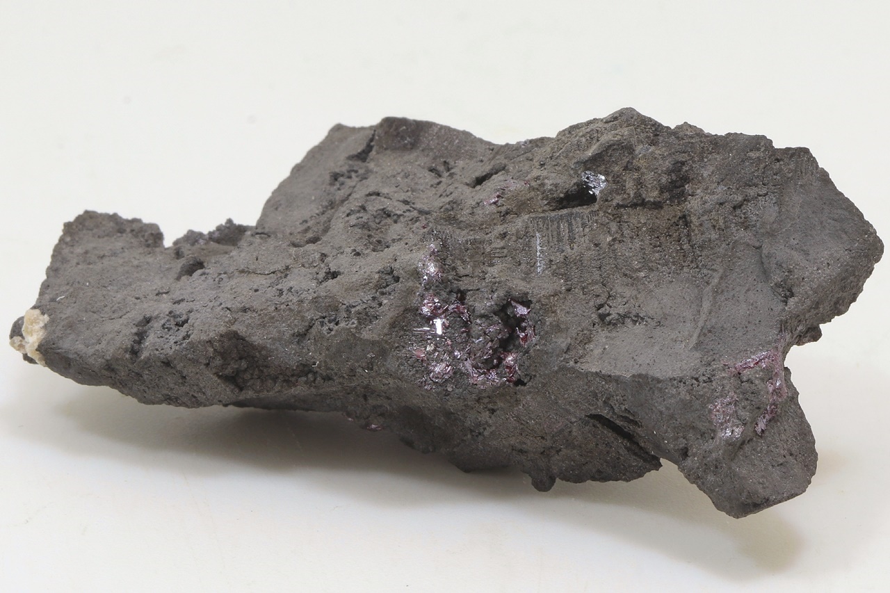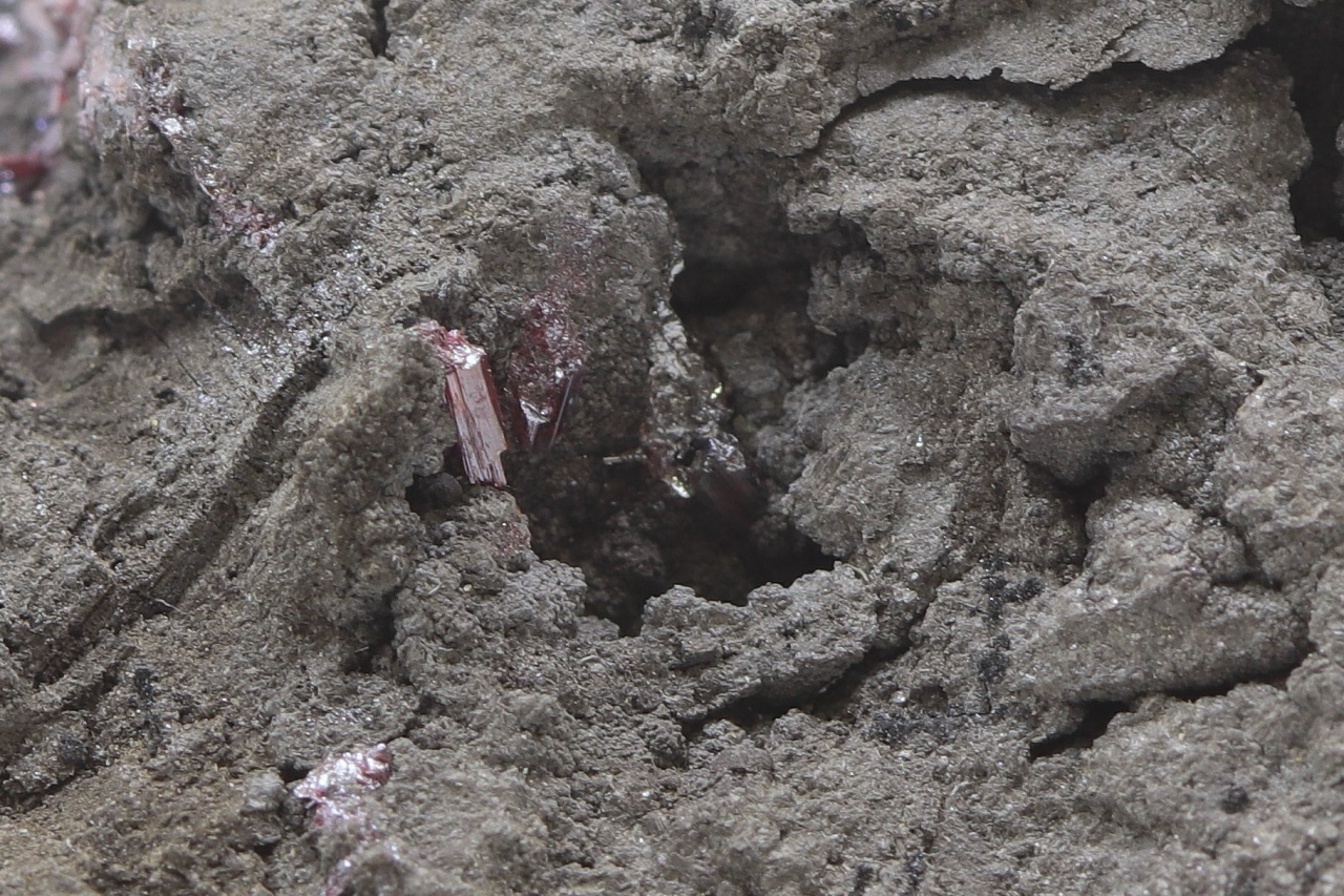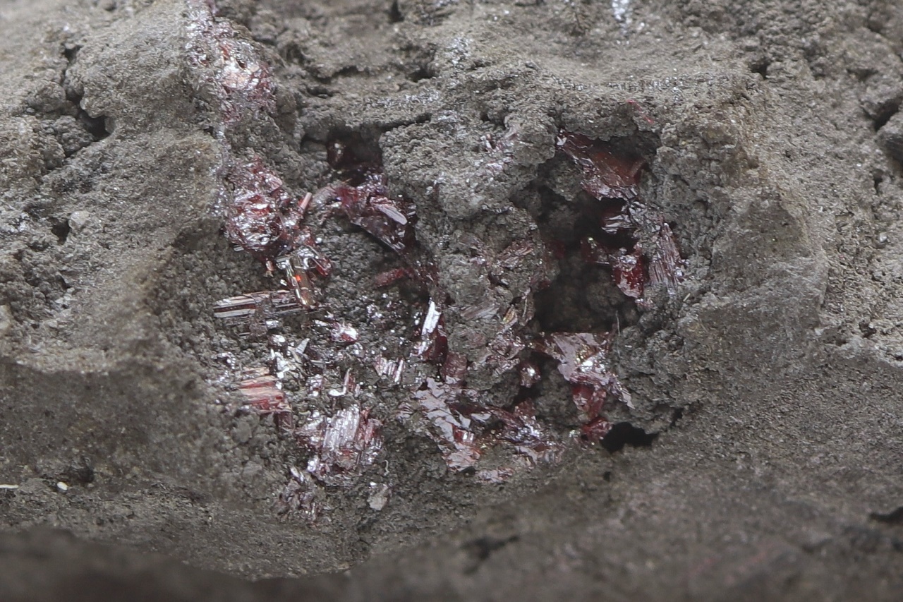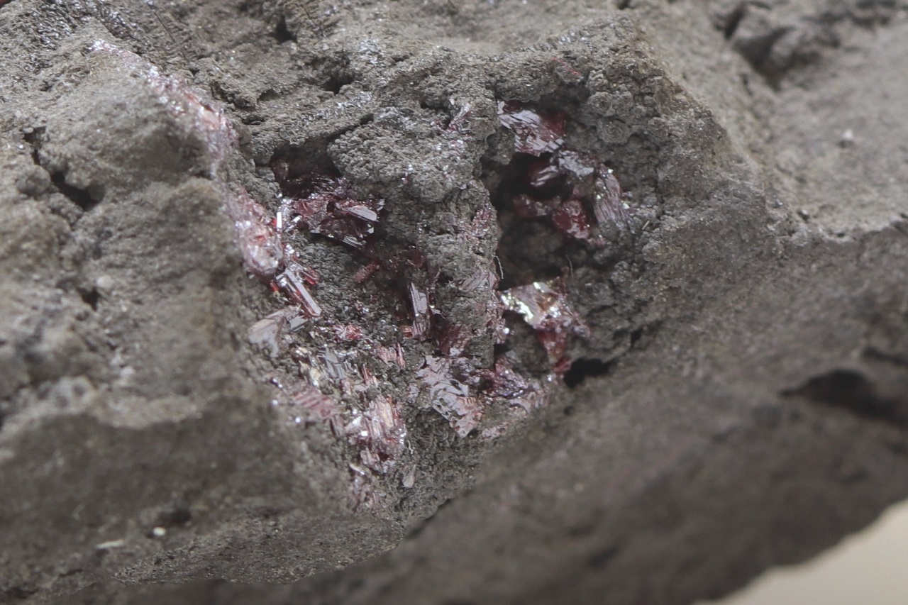 Kristalle von dunkelrotem Proustit, bis zu 2 mm groß, gewachsen in Hohlräumen von schwarzem Proustit.