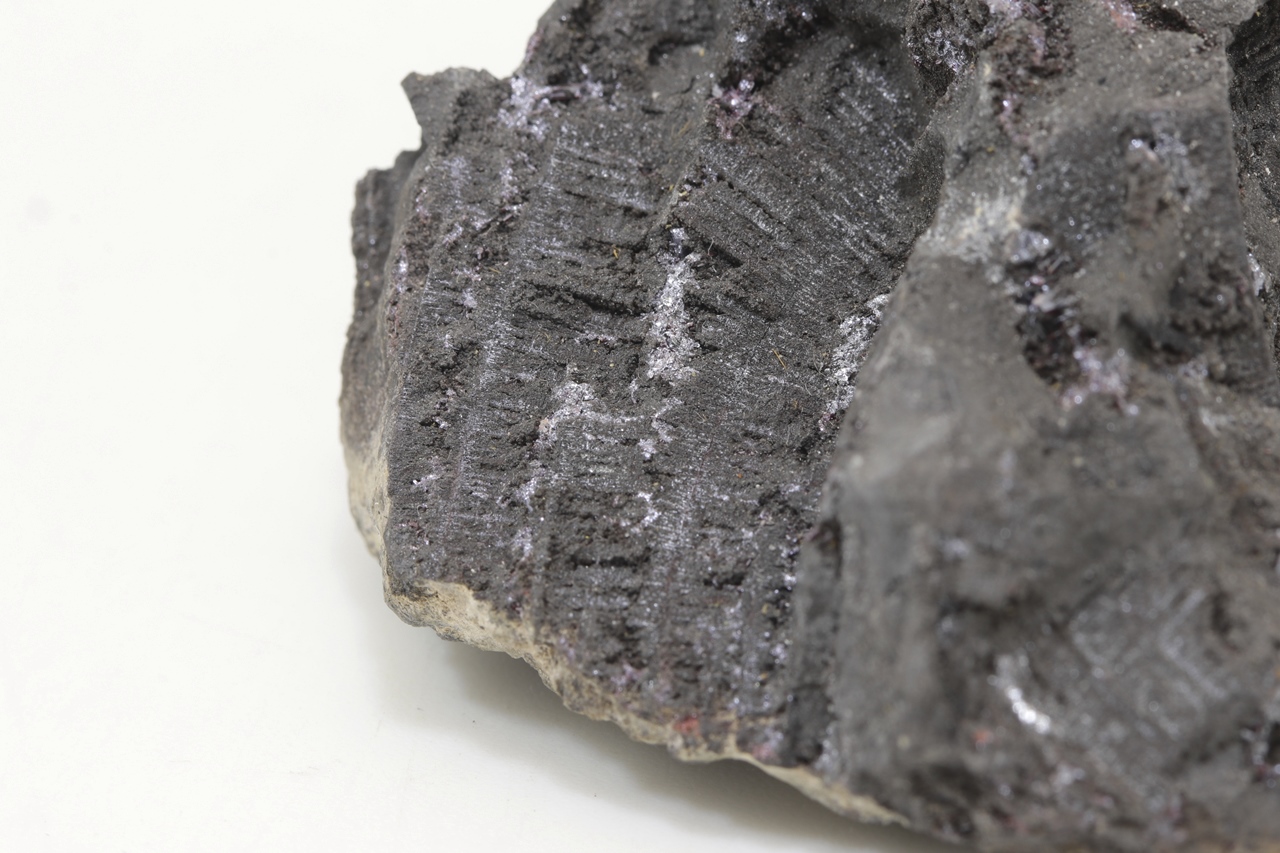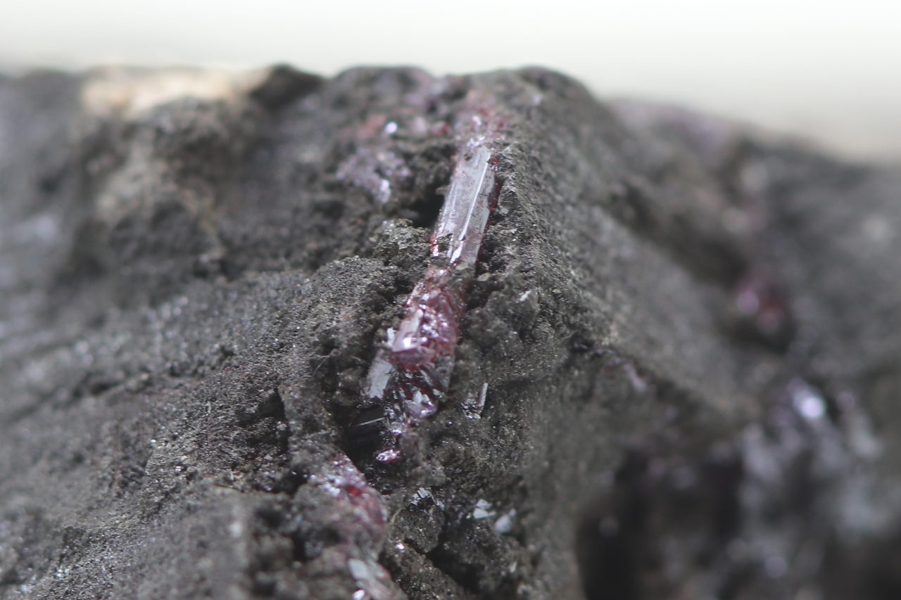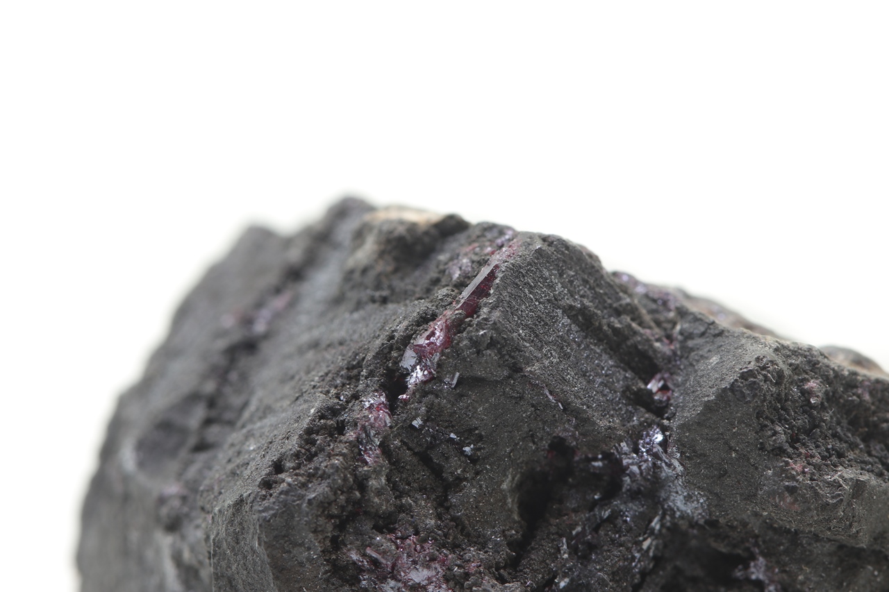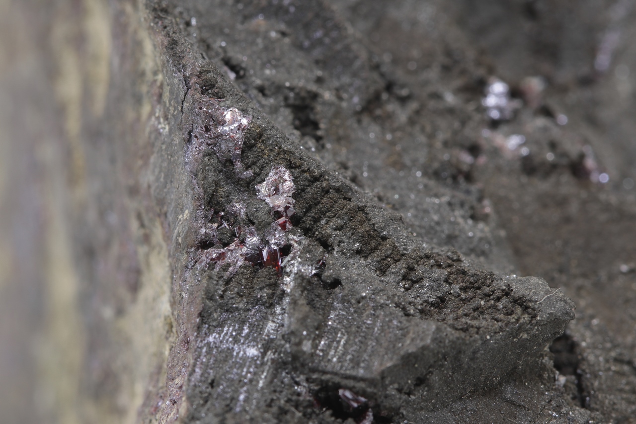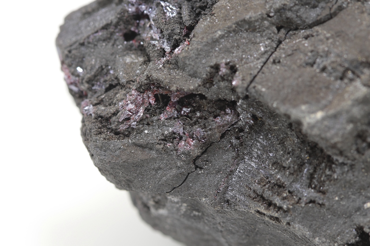 Ein repräsentatives Muster des massiven Arsens aus der Grube Svornost in Jáchymov, das oft Strukturen nach der Auslaugung von dendritischem Silber aufweist. Auf diesem Arsen haben sekundär kleine Kristalle von dunkelrotem Proustit kristallisiert.