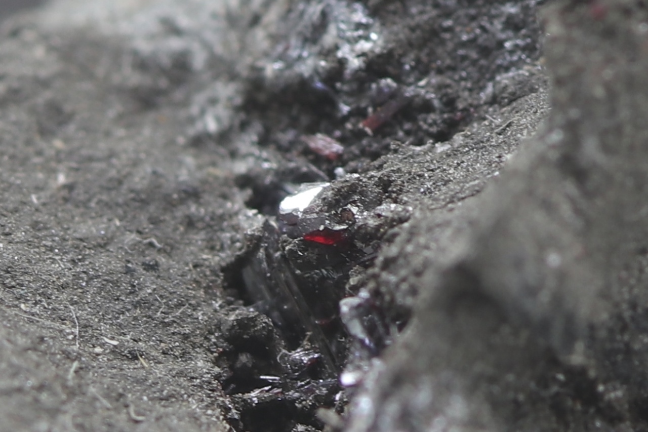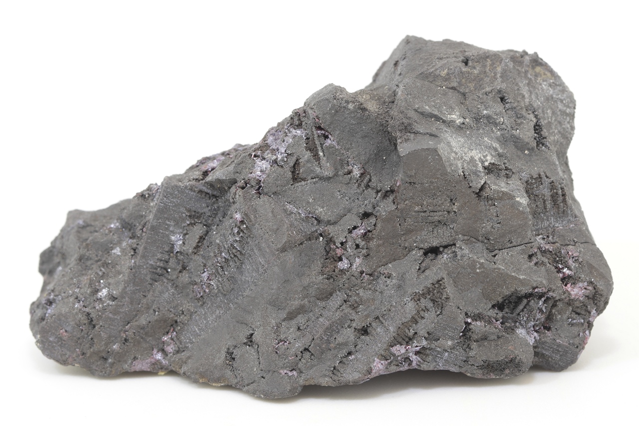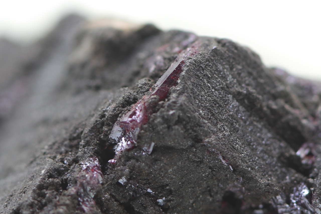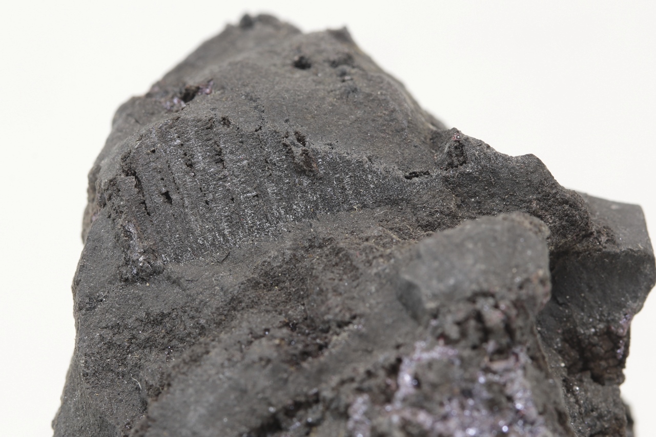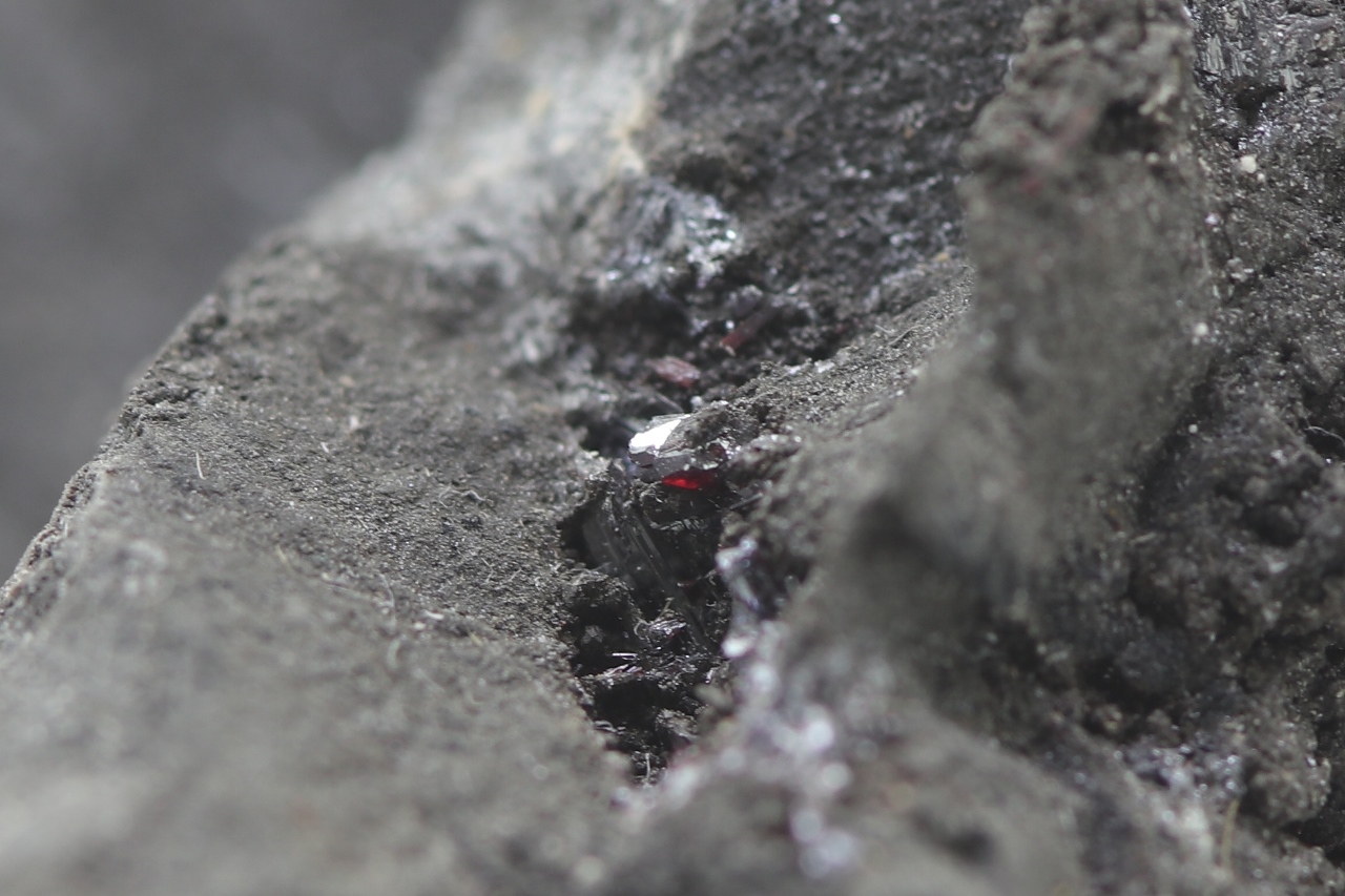 Ein repräsentatives Muster des massiven Arsens aus der Grube Svornost in Jáchymov, das oft Strukturen nach der Auslaugung von dendritischem Silber aufweist. Auf diesem Arsen haben sekundär kleine Kristalle von dunkelrotem Proustit kristallisiert.
