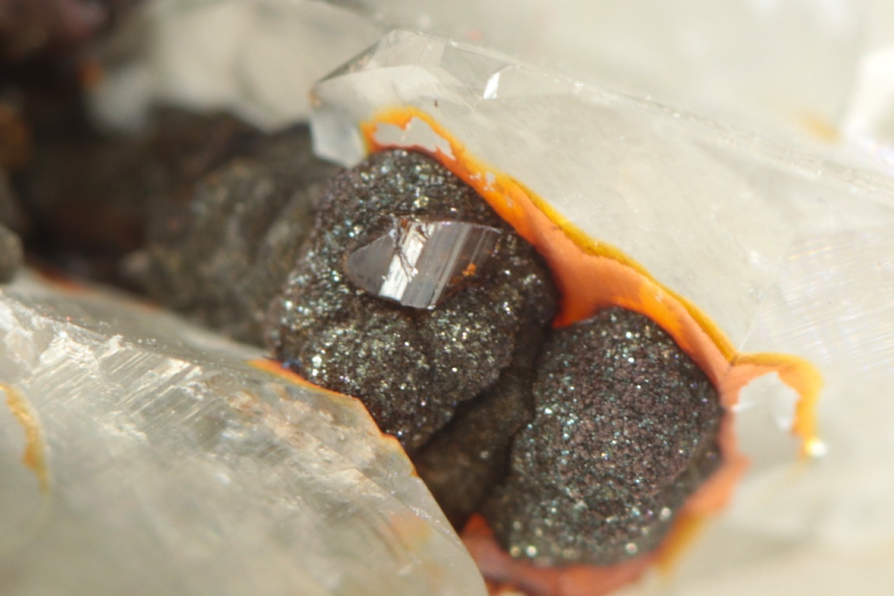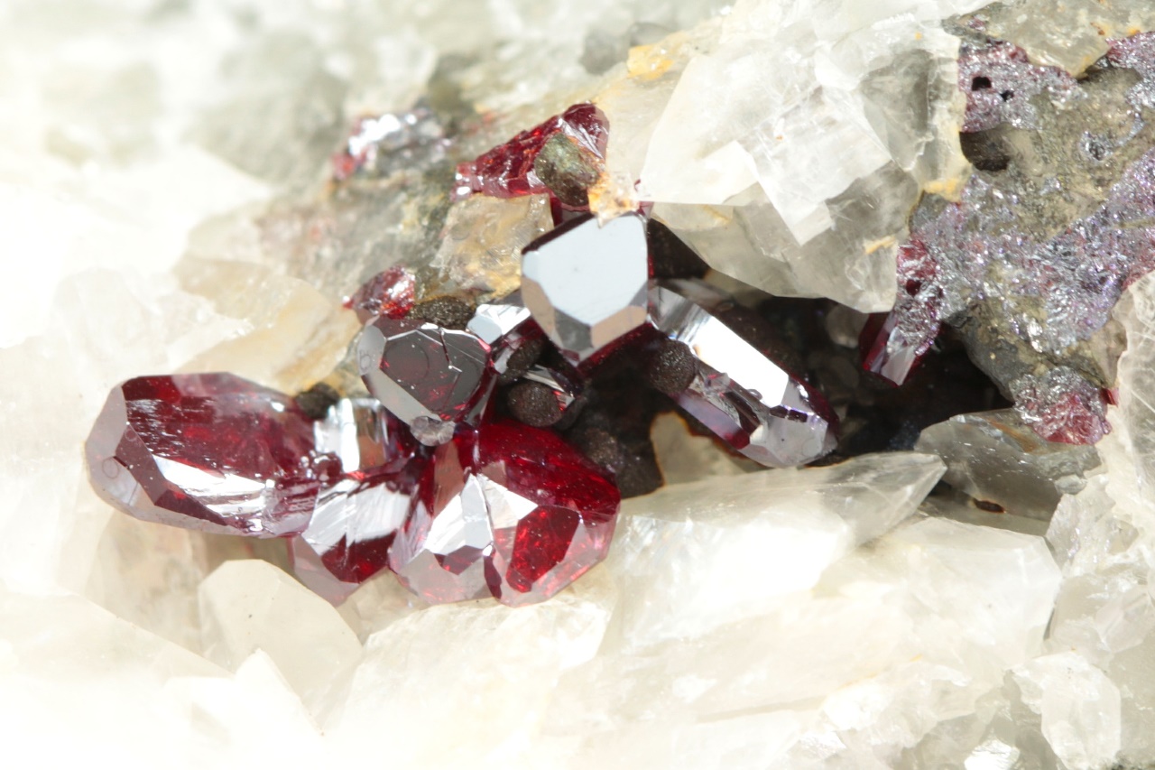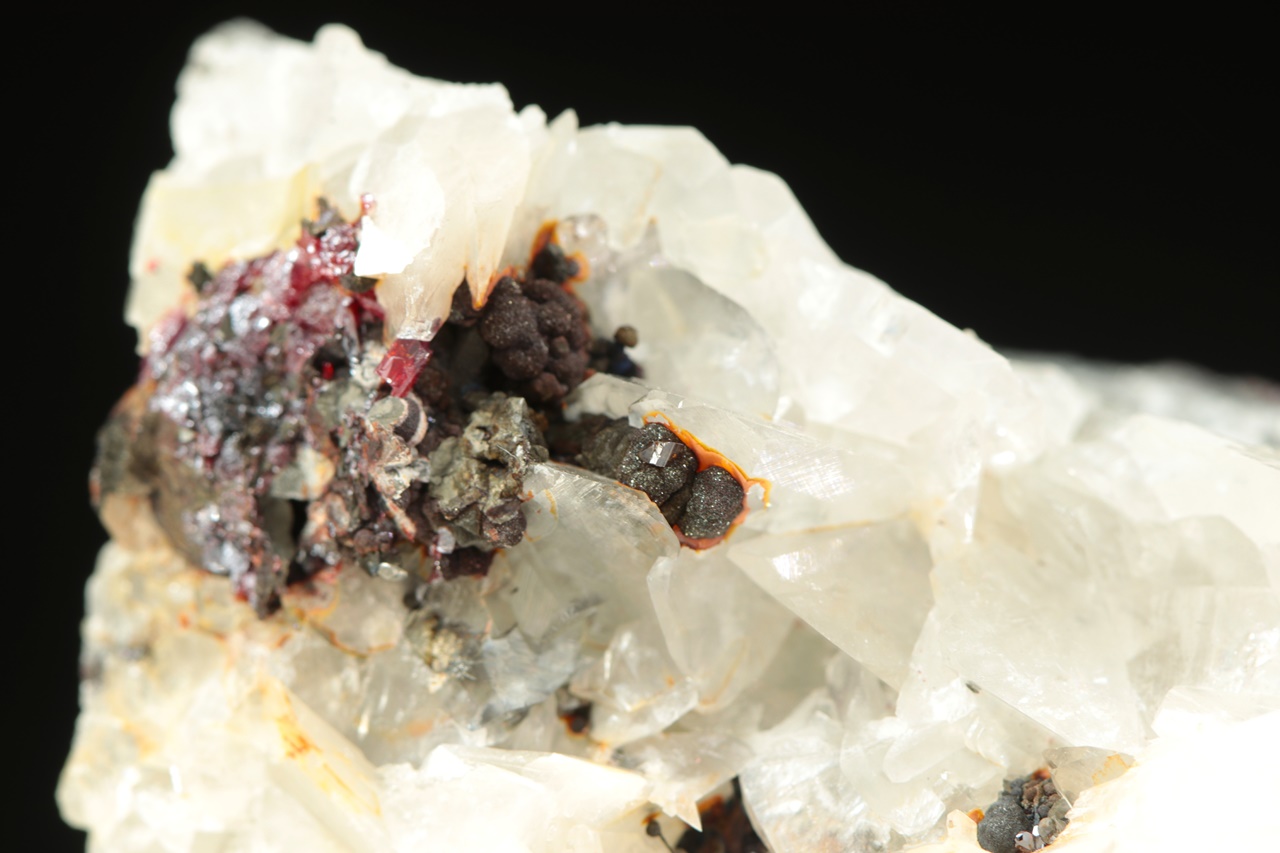 Krystalle des intensiv rot gefärbten Proustit bis zu 4 mm Größe mit zwei orangefarbenen Kristallen des seltenen Xantokon (der größere Kristall ist 1,5 mm groß) und Pseudomorphosen von Pyrit nach Argentopyrit.
