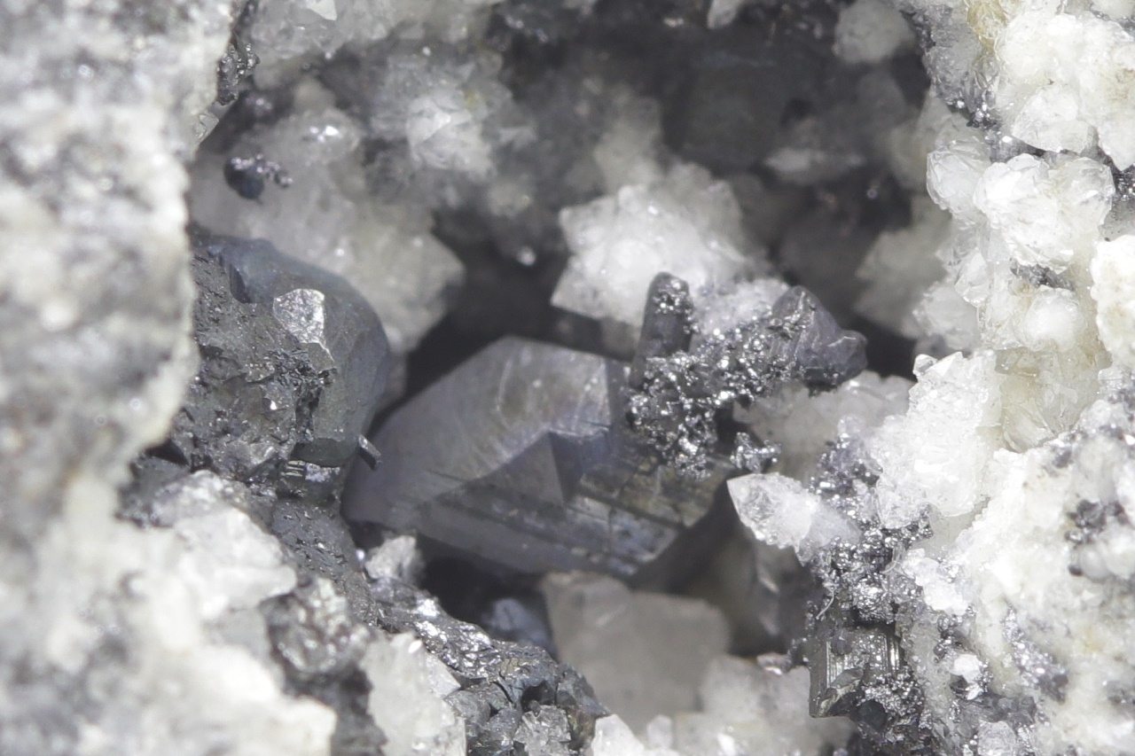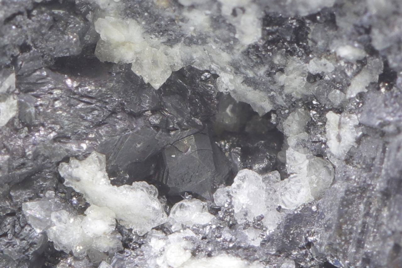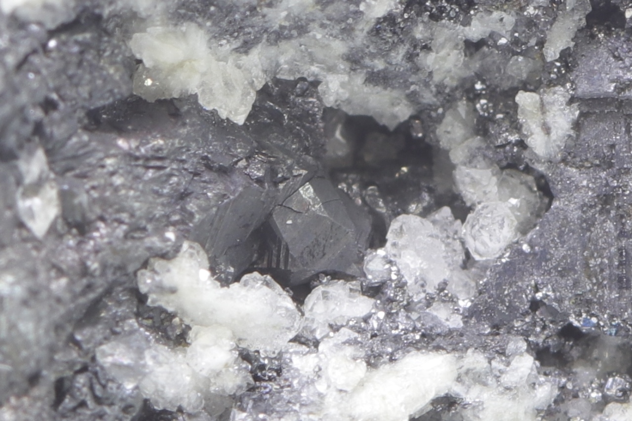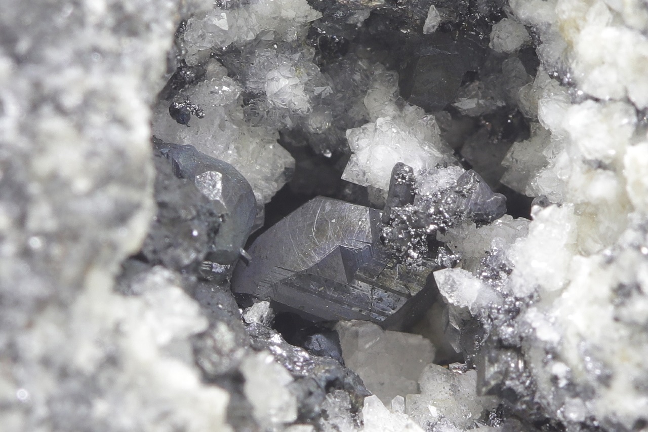 Vzorek příbramské žíloviny s do dutin narostlým Pyrargyritem (až 3 mm velkým), na kterém jsou narostlé menší lesklé krystaly Stefanitu.