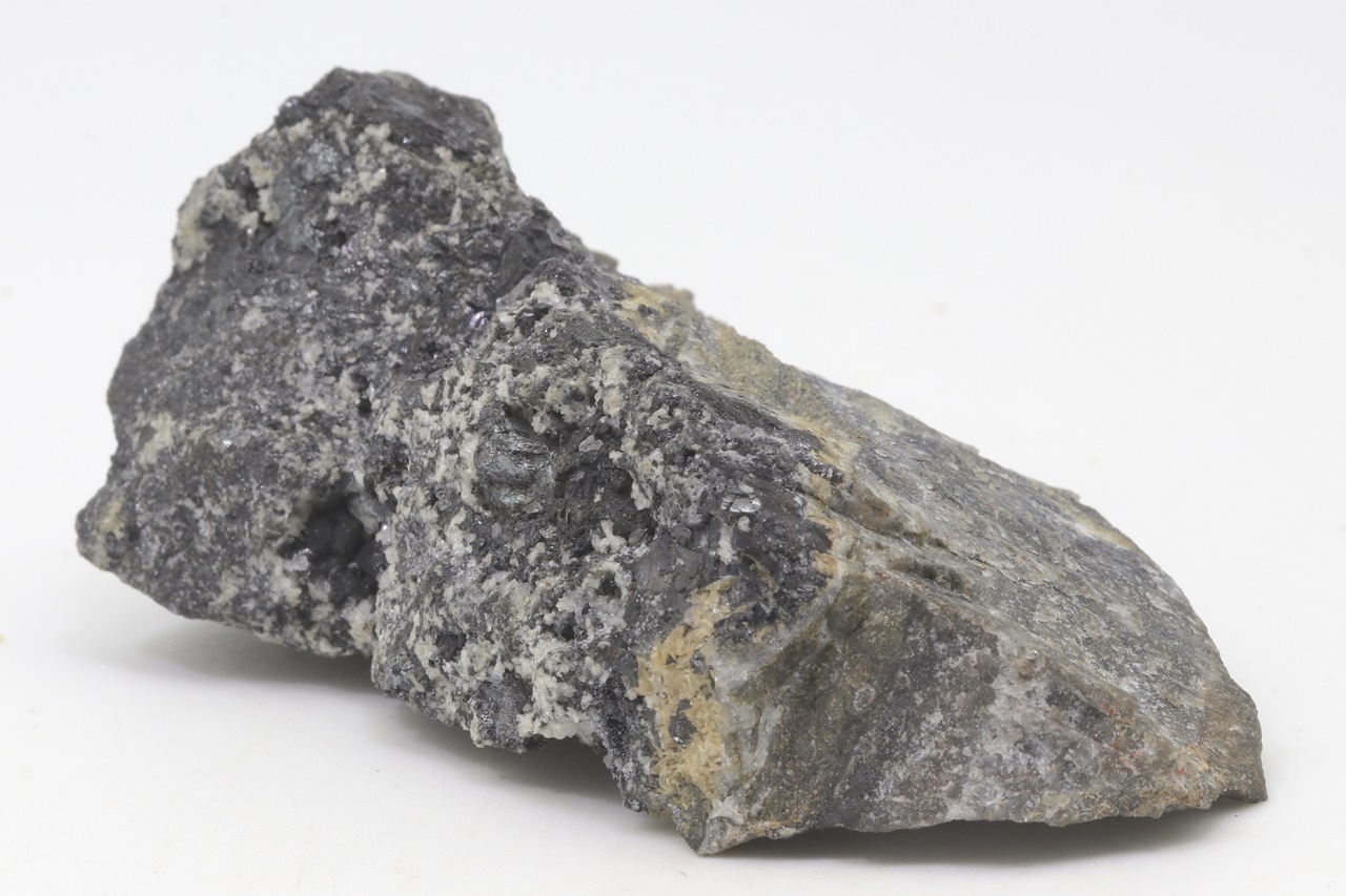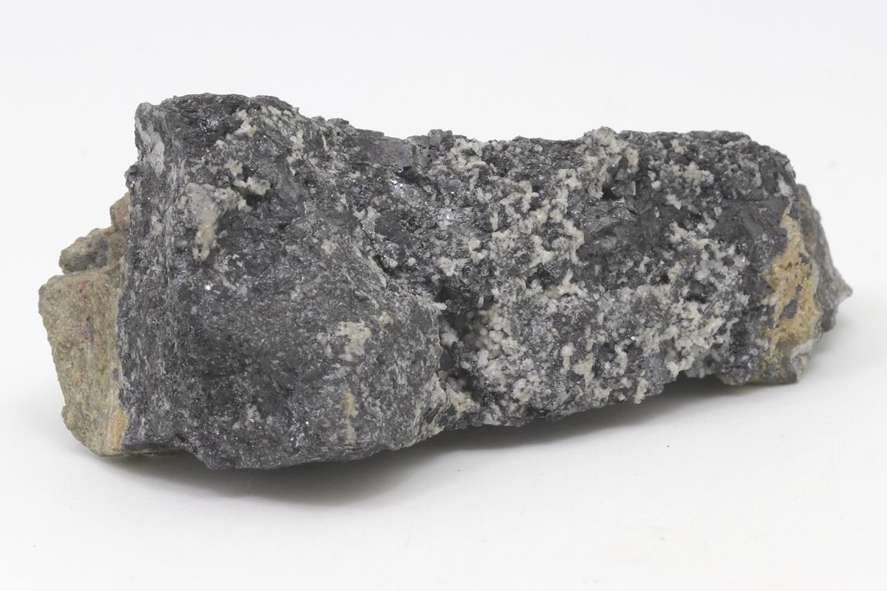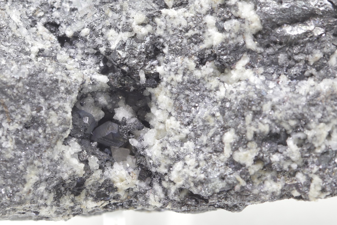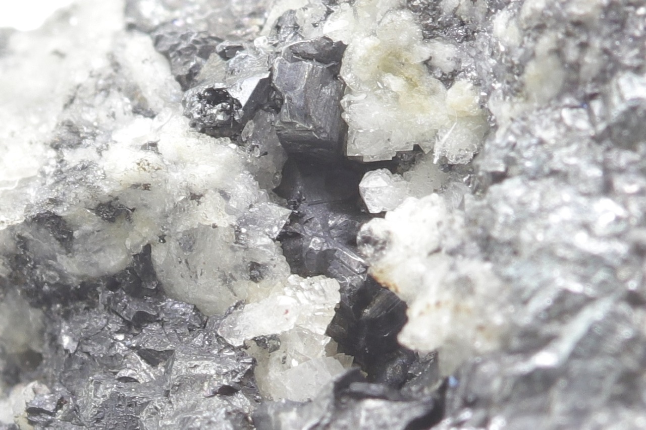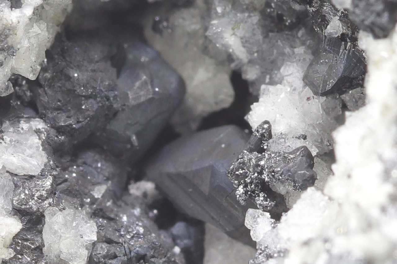 Vzorek příbramské žíloviny s do dutin narostlým Pyrargyritem (až 3 mm velkým), na kterém jsou narostlé menší lesklé krystaly Stefanitu.