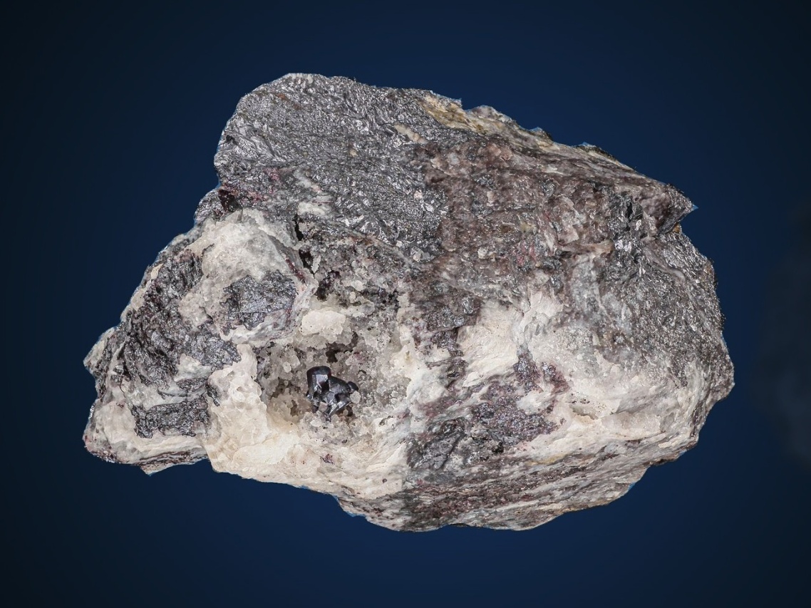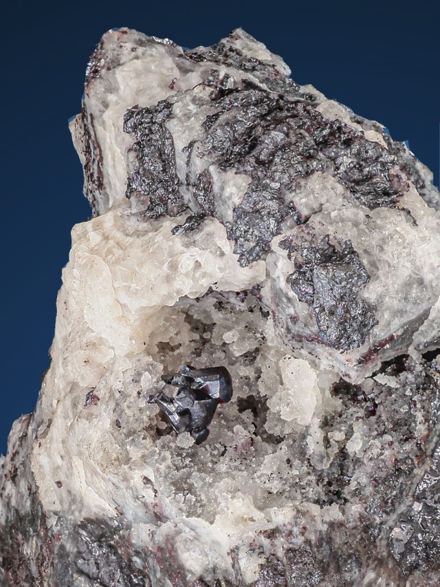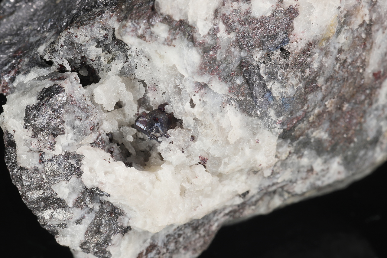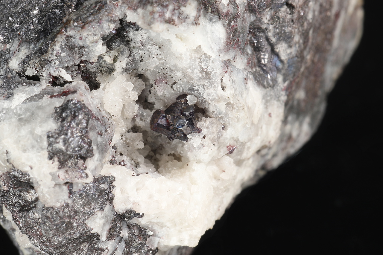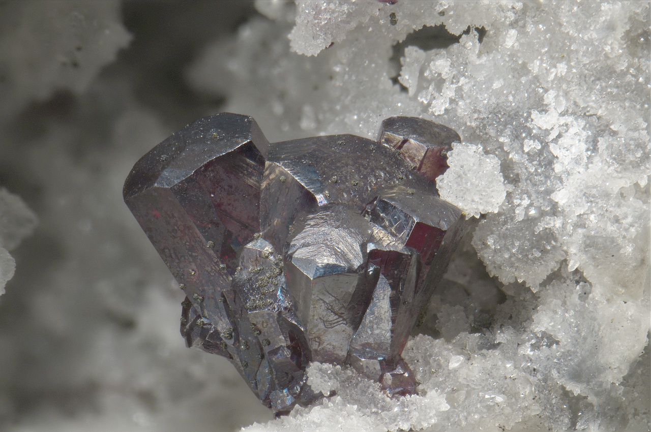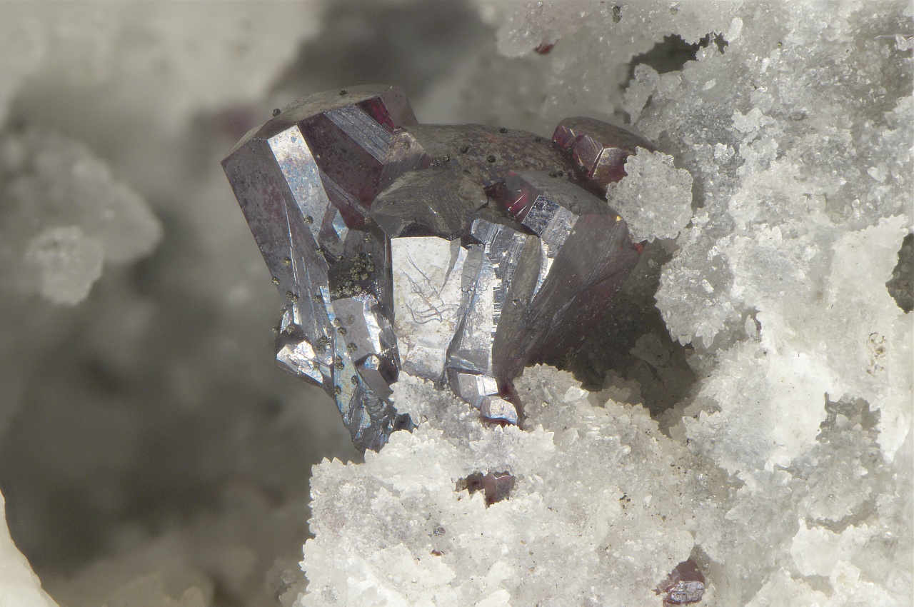 Sehr schöne 5 mm große Verwachsung unbeschädigter Pyrargyrit-Kristalle in einer Quarzhöhle in der Gangart mit weiteren Sulfiden. Historisches Muster aus den Gruben auf den Březové hory in Příbram.