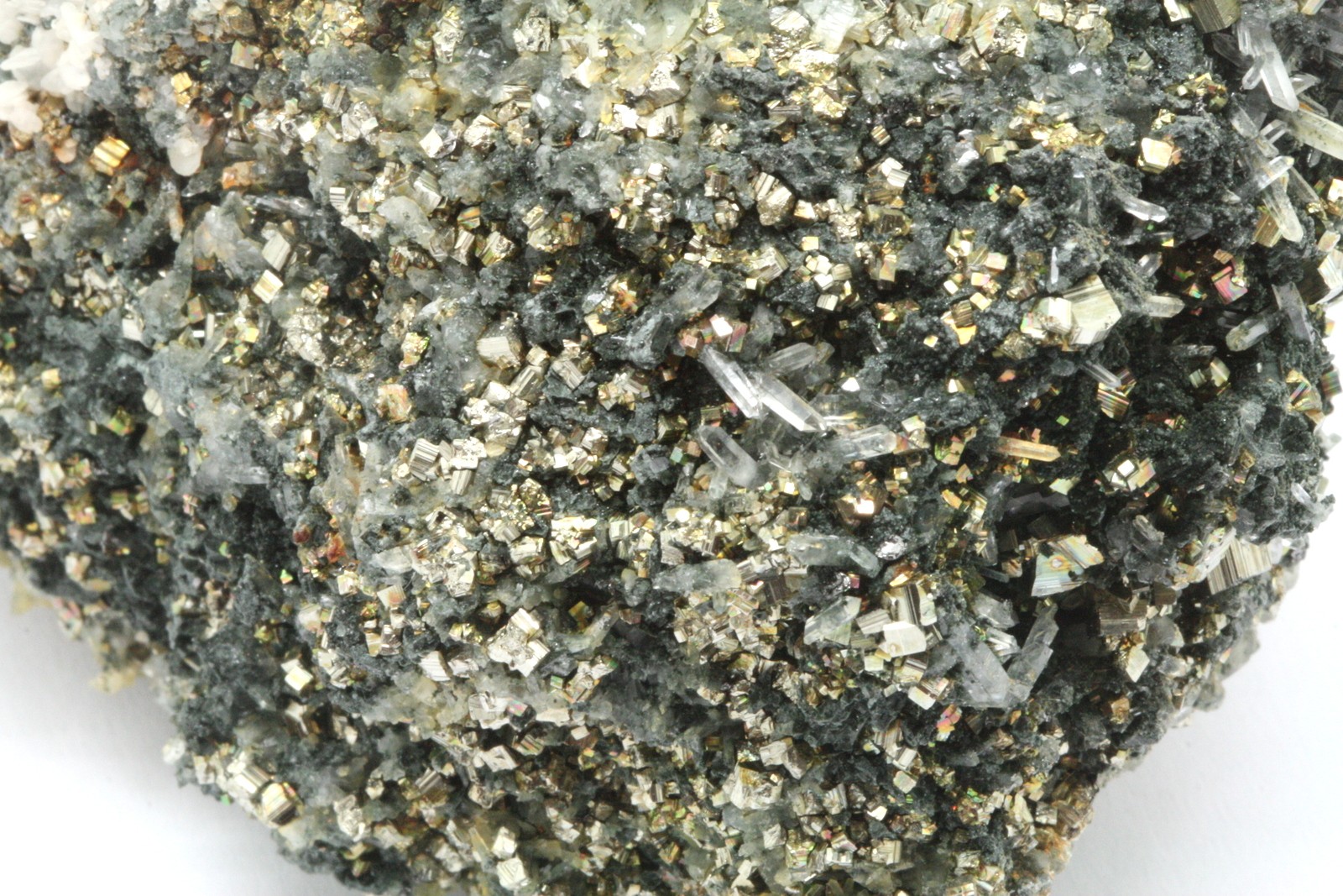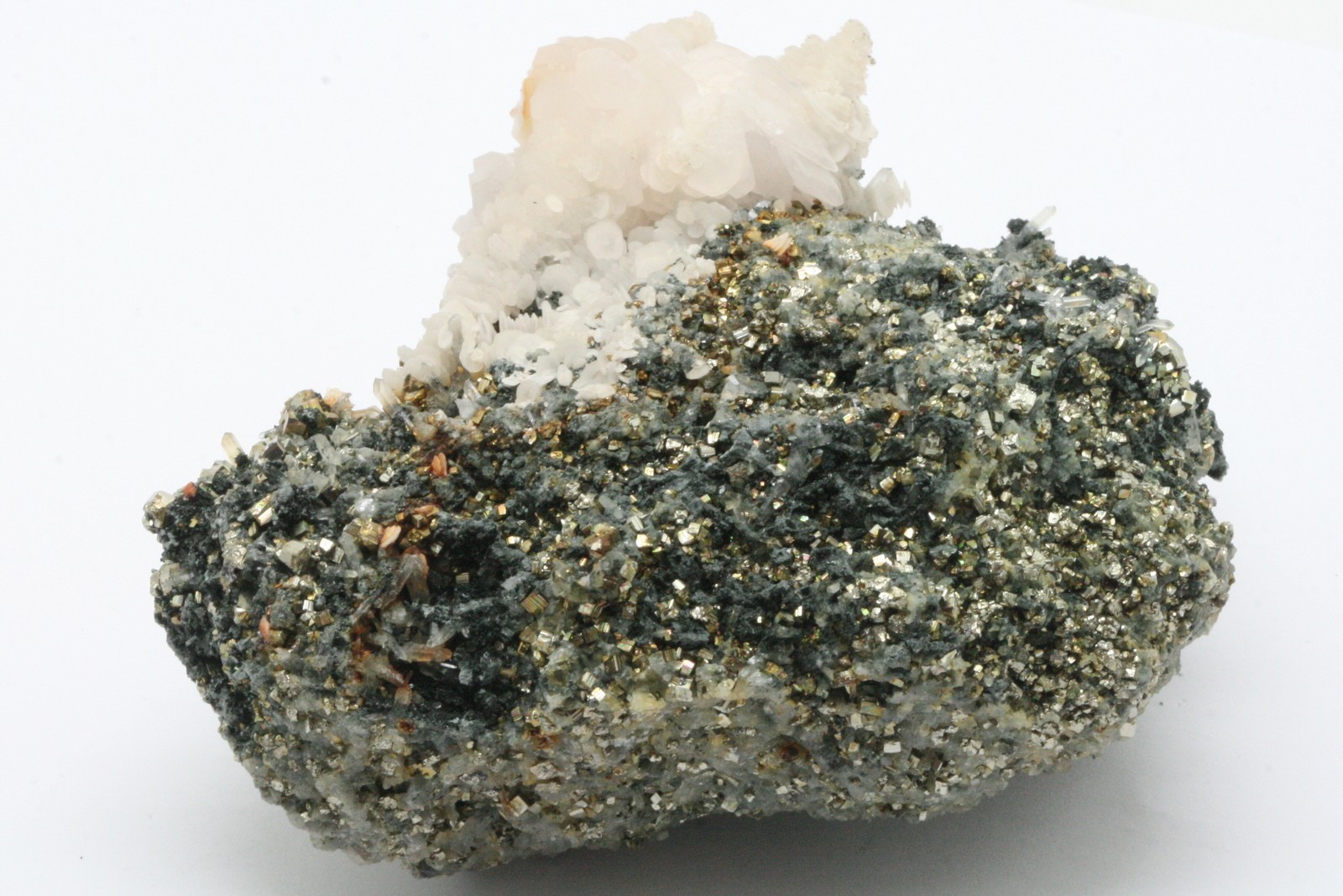 Probe bedeckt mit kleinen Pyritkristallen und einem Cluster von vielen kleinen Nagelkopfkristallen des Calcits