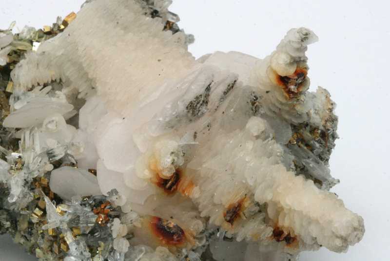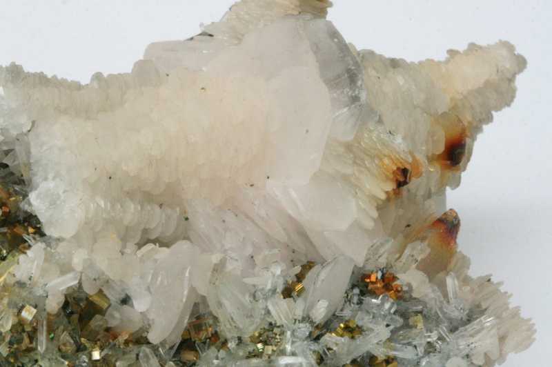 Interessantes Kalcit-Exemplar aus dem bulgarischen Madan. Probe bedeckt mit kleinen Pyritkristallen und einem Cluster vieler kleiner Nagelkopf-Kalcitkristalle .