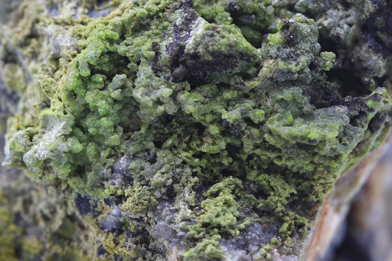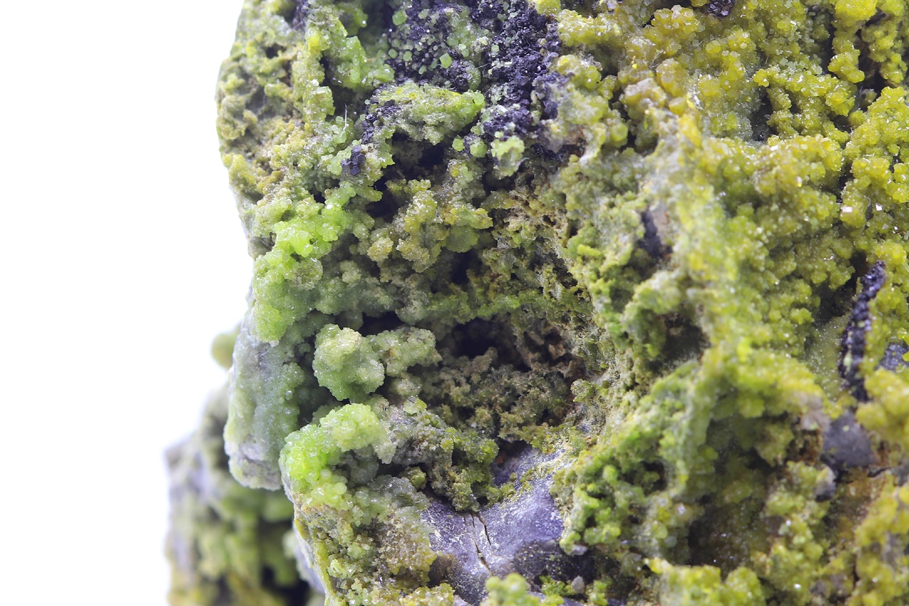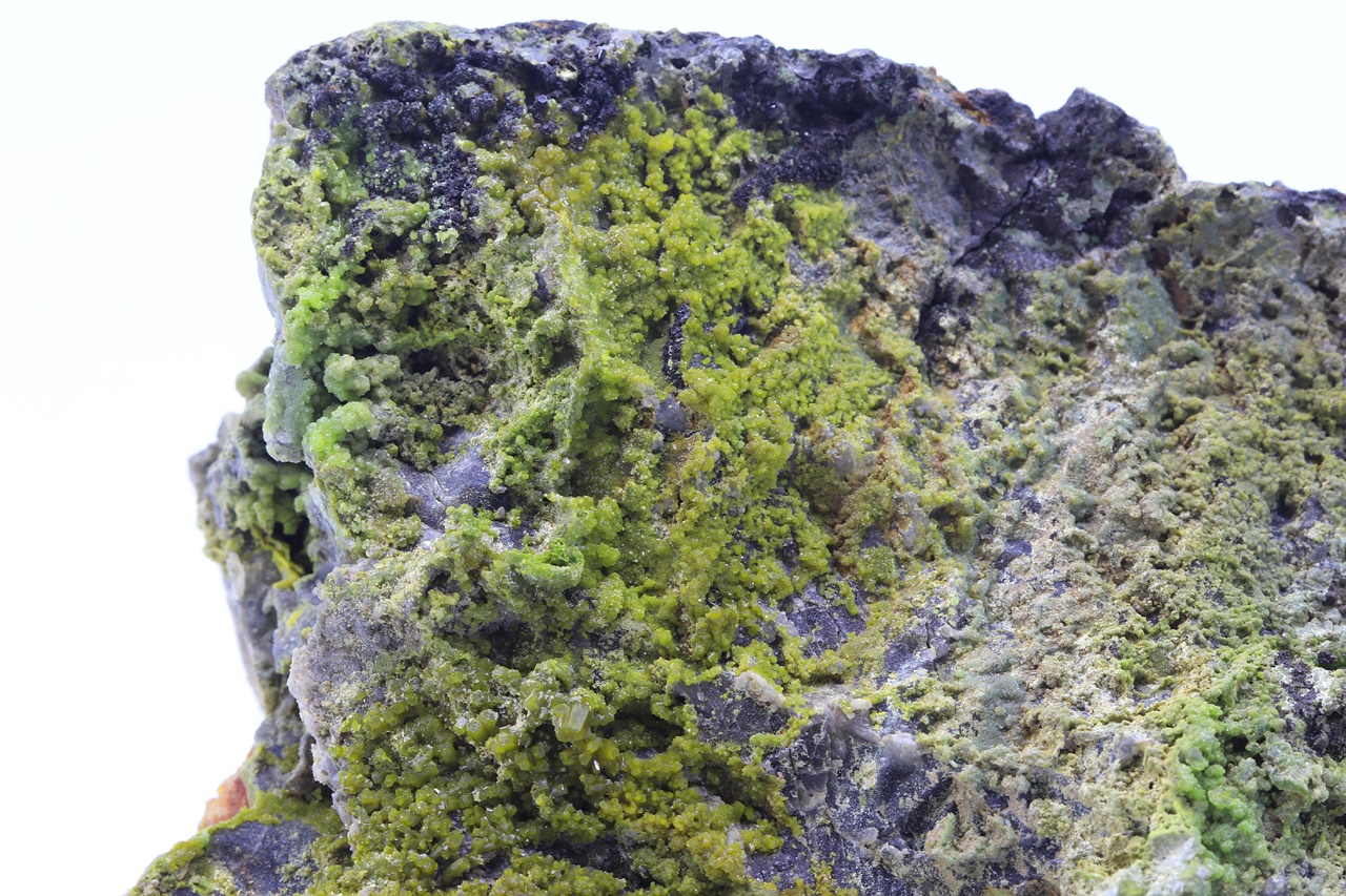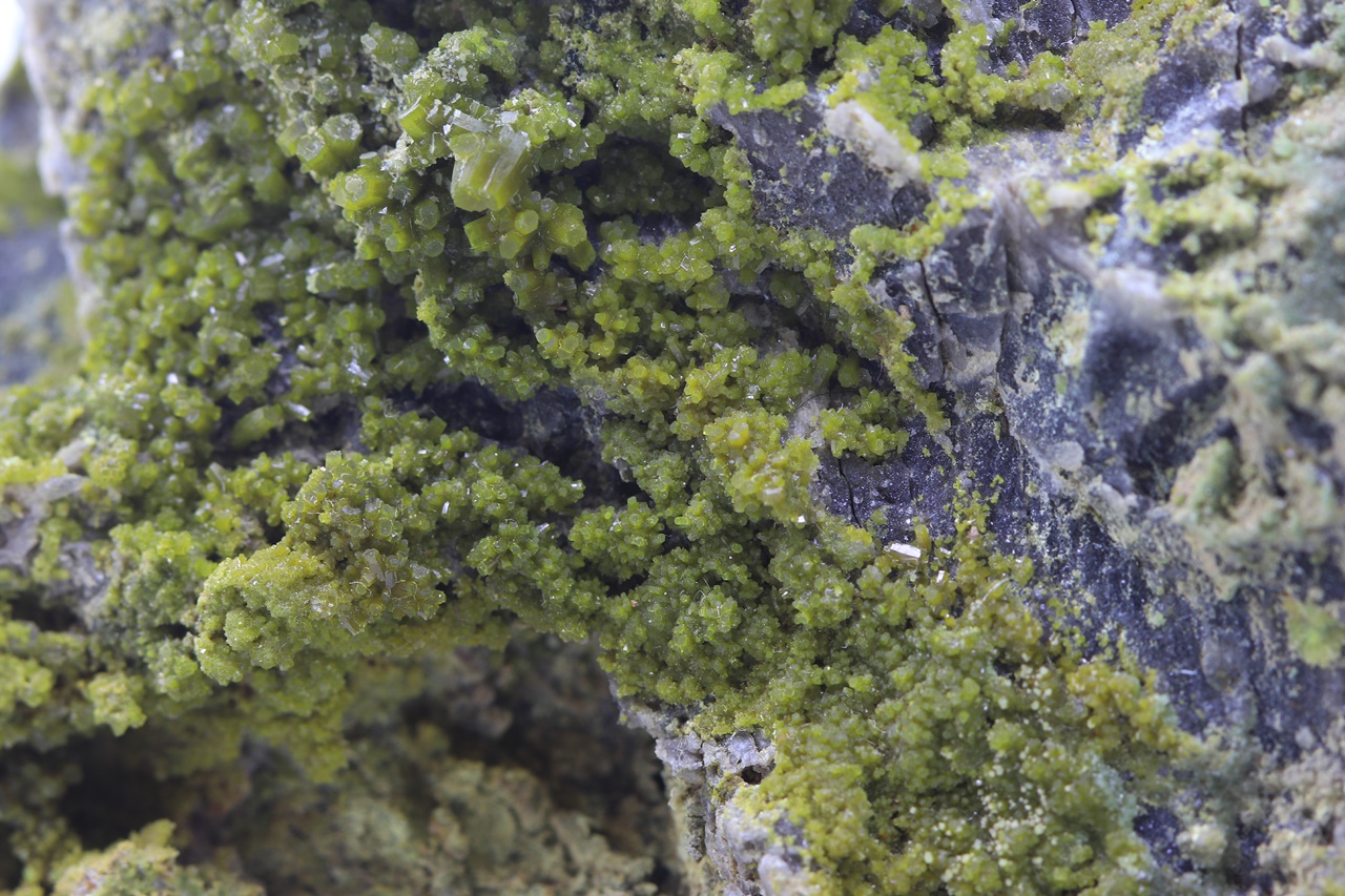 Reiche Probe von Aggregaten und Kristallen des sattgrünen Pyromorphits. Der größte Kristall ist 4 mm groß.
