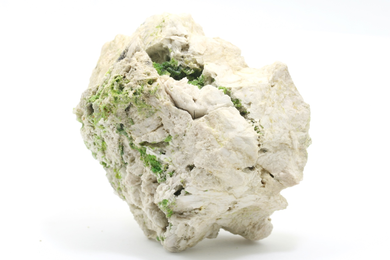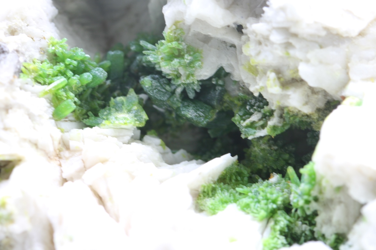 Sattgrüne Kristalle von Bleiphosphat auf weißem Baryt. Die Pyromorphit-Kristalle sind bis zu 2 mm groß.