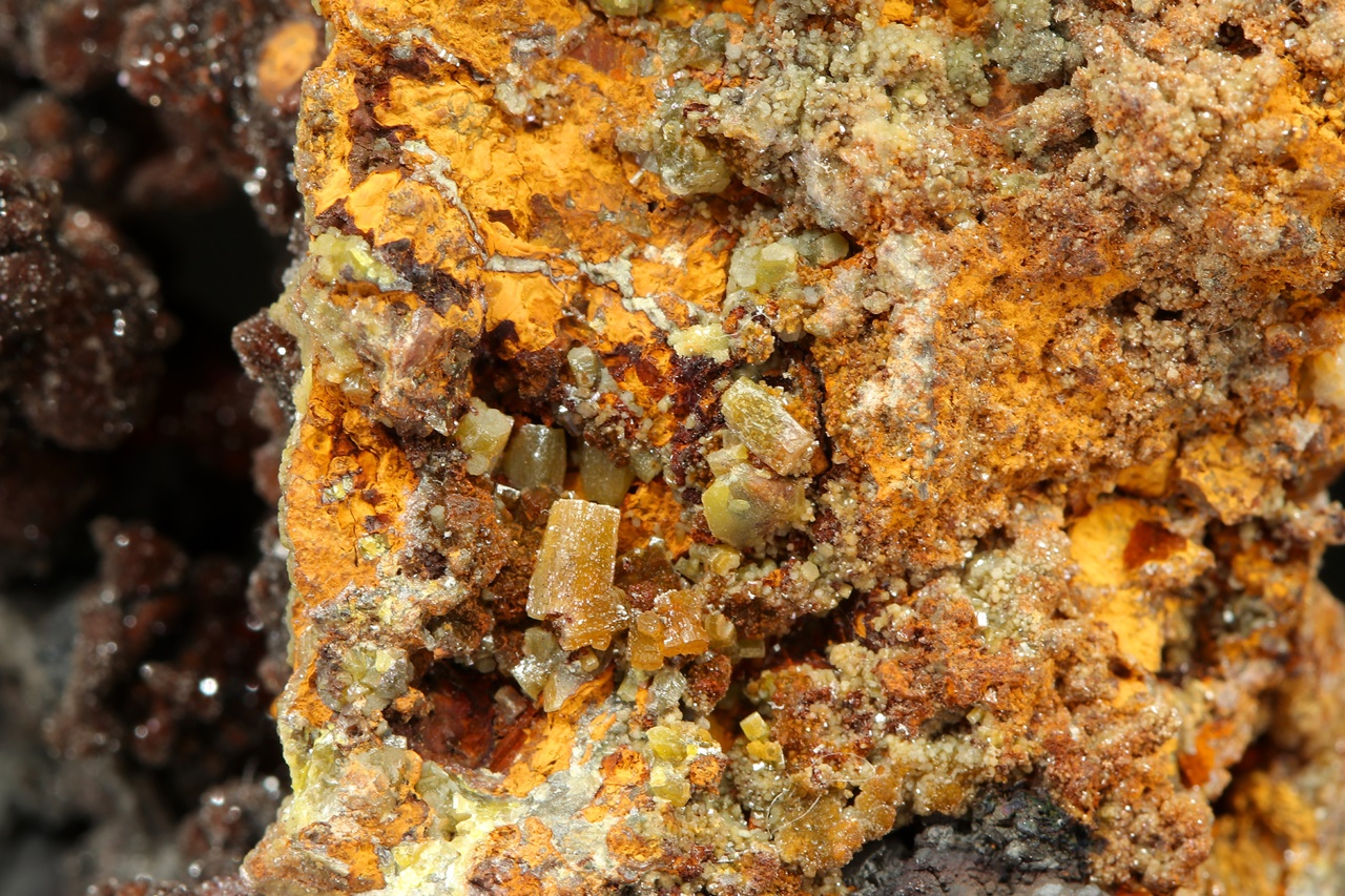 Interessante Stufe aus der subaerischen Verwitterungszone besteht auf der einen Seite aus Stalaktiten von Manganoxyden, bewachsen mit kleinen, glänzenden Bergkristall. Auf der anderen Seite wachsen auf Limonit bis zu 3 mm große Pyromorphit-Kristalle. Die Stufe stammt aus dem Bergwerk Prokop.