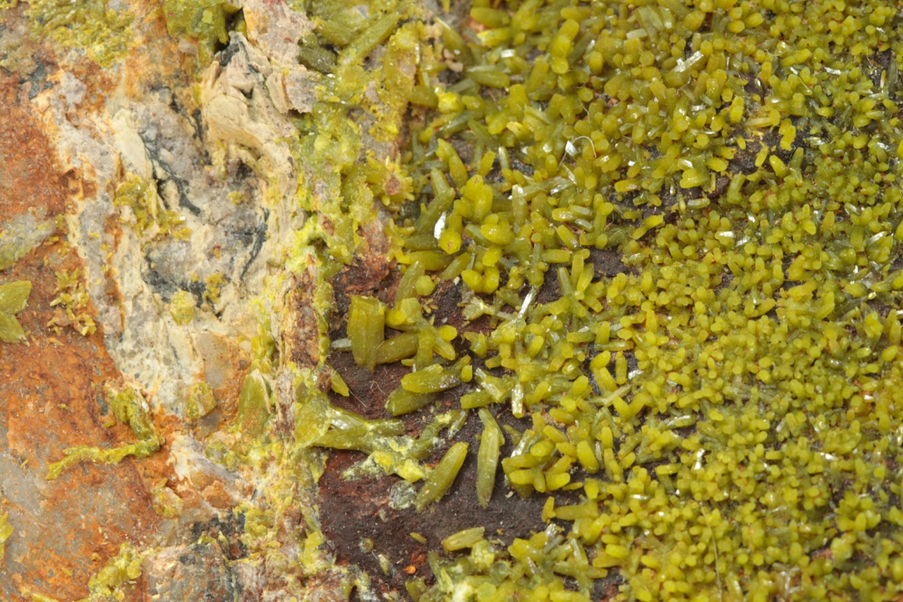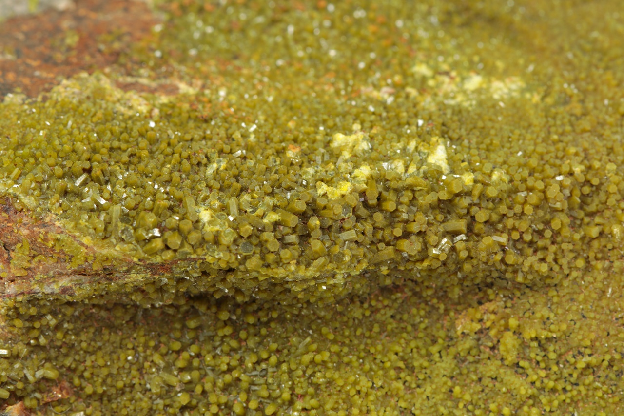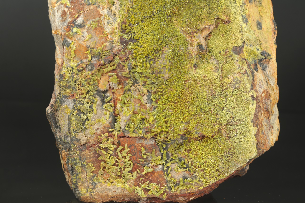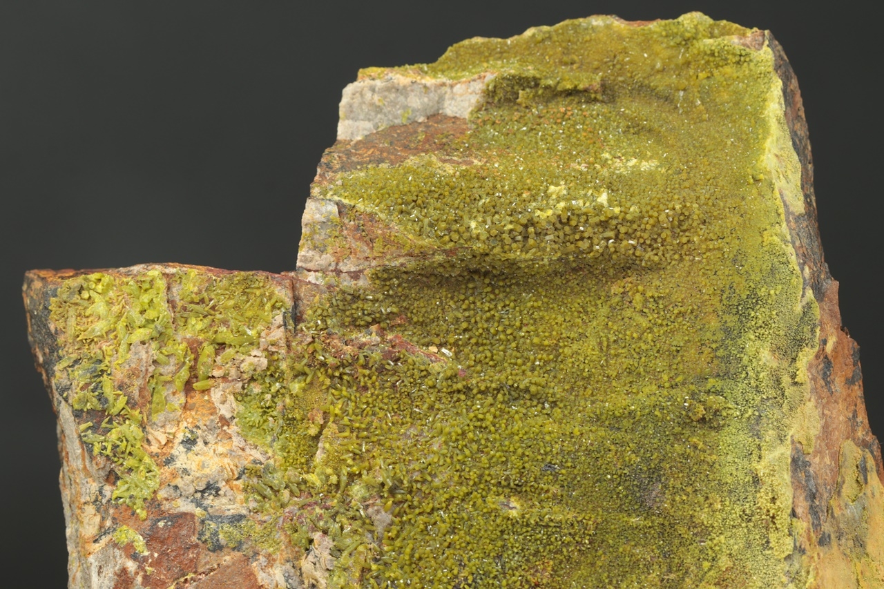 Außergewöhnlich großer Muster aus klar grünem Pyromorphit aus dem Prokop-Schacht im zentralen Teil des Březohorský-Reviers. Auf einer Seite der Probe bildet der Pyromorphit dicht gewachsene säulenförmige Kristalle bis zu 2 mm groß, auf der anderen Seite geht er in längliche zugespitzte Kristalle über, die bis zu 5 mm groß sind.