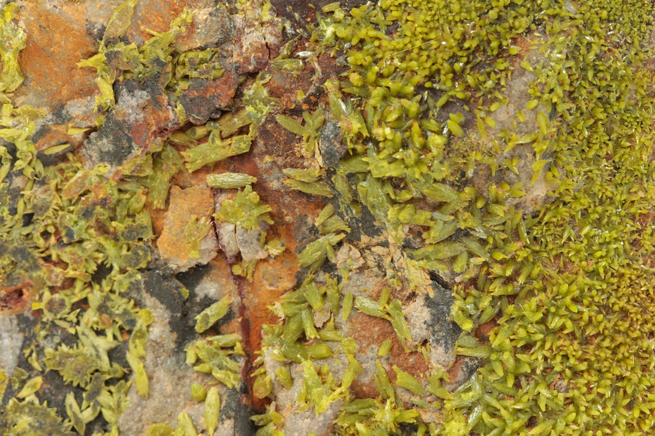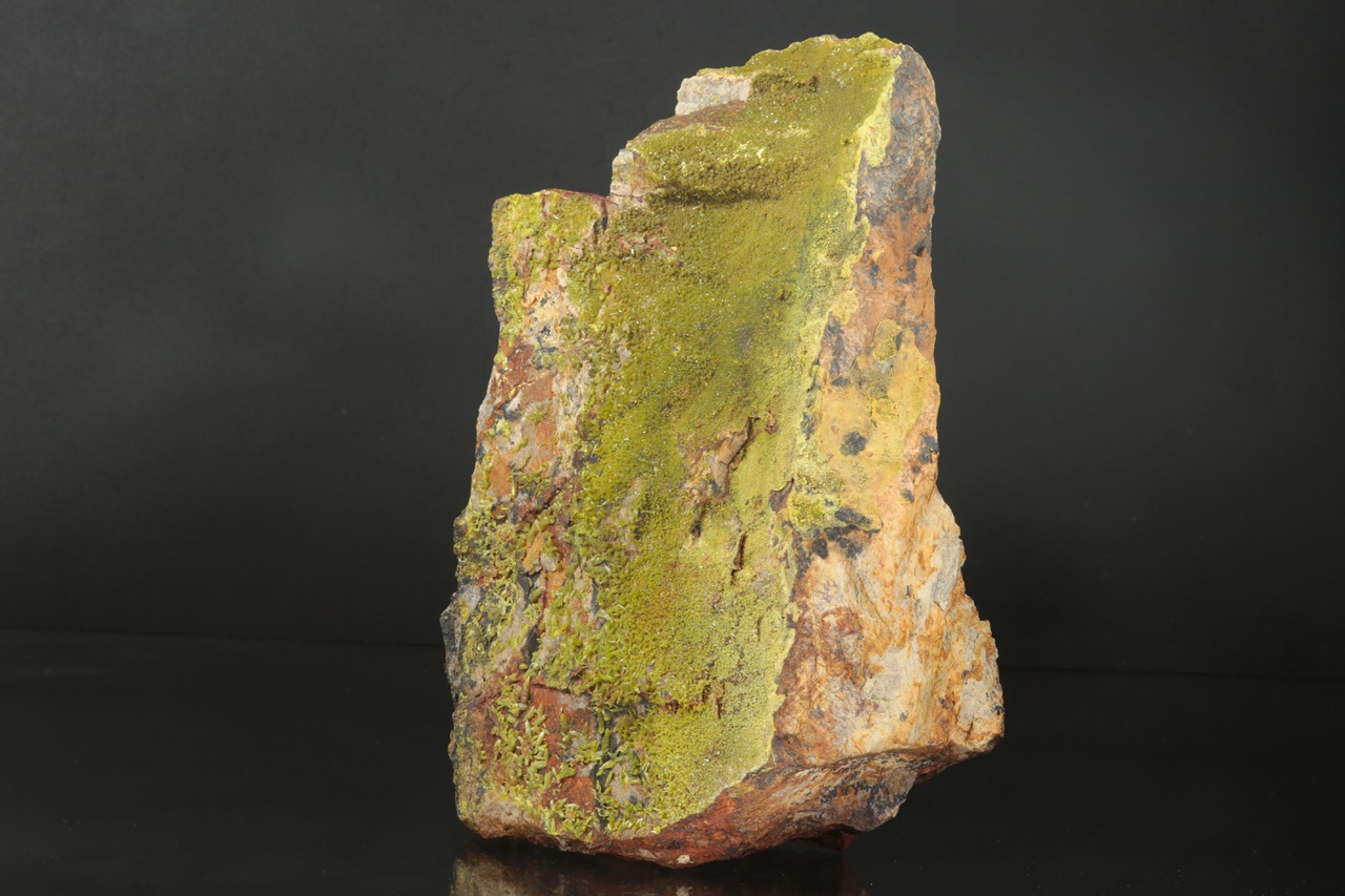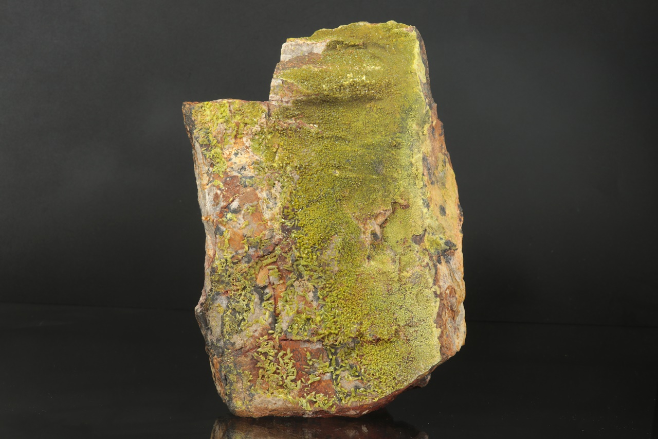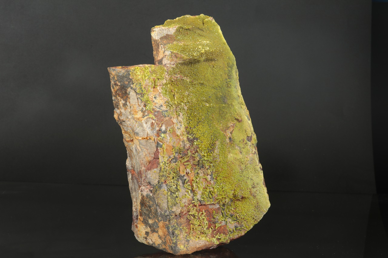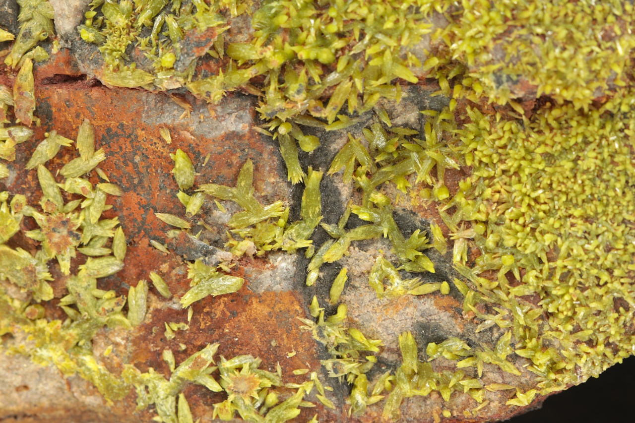 Außergewöhnlich großer Muster aus klar grünem Pyromorphit aus dem Prokop-Schacht im zentralen Teil des Březohorský-Reviers. Auf einer Seite der Probe bildet der Pyromorphit dicht gewachsene säulenförmige Kristalle bis zu 2 mm groß, auf der anderen Seite geht er in längliche zugespitzte Kristalle über, die bis zu 5 mm groß sind.
