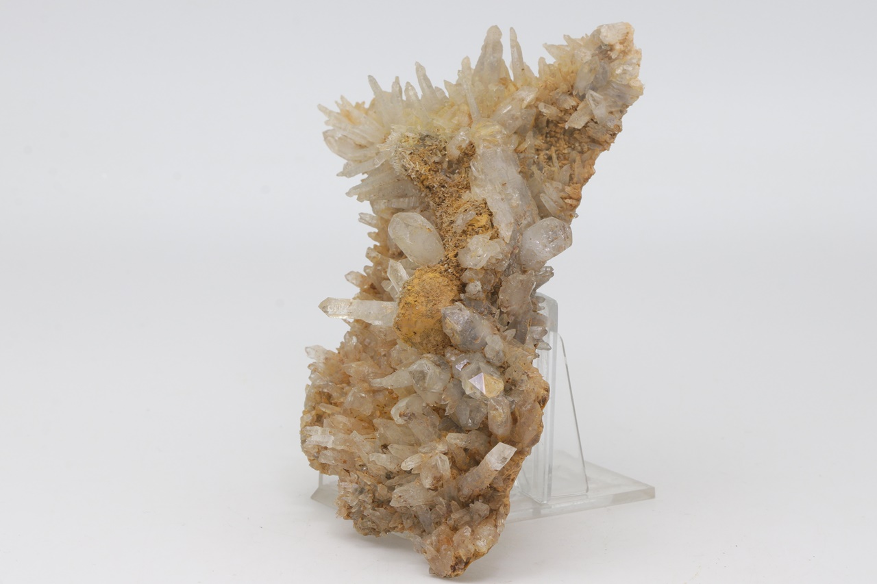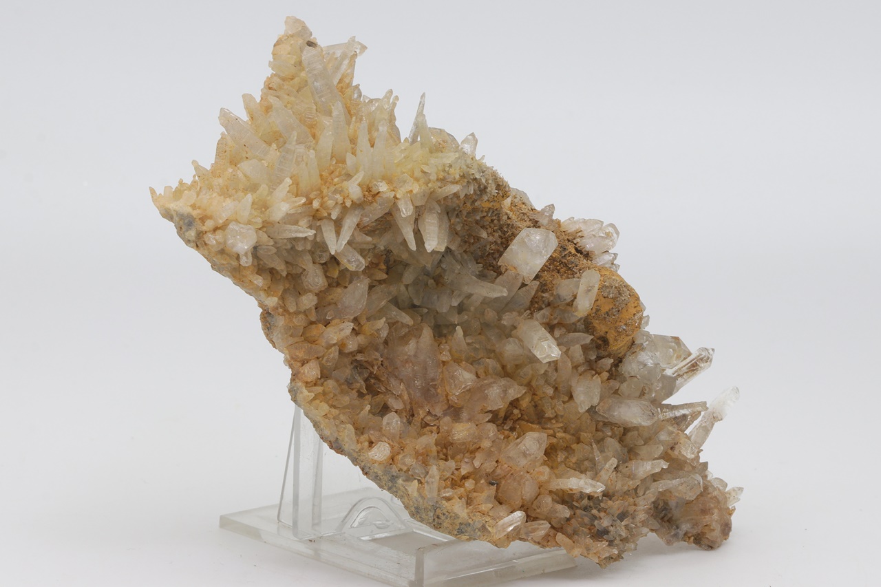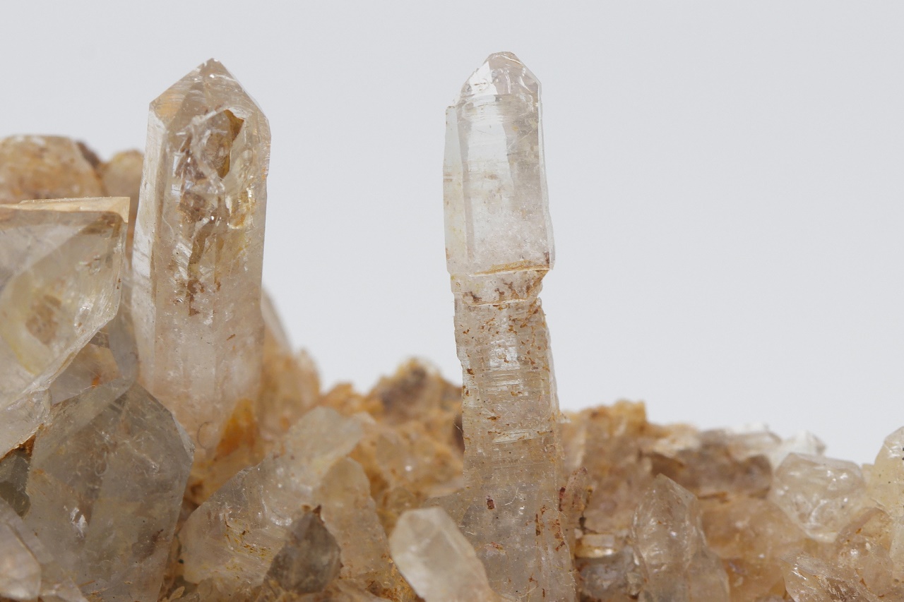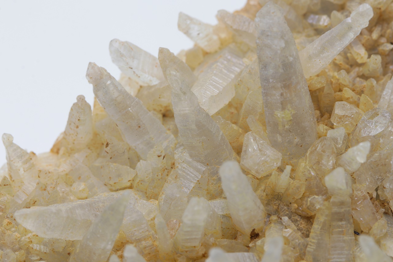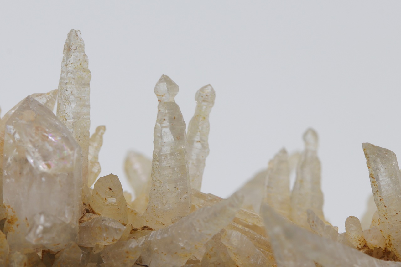 Eine in den Raum gewachsene Druse aus langen Quarzkristallen, von denen einige die sogenannte Taubenschwanzform haben.