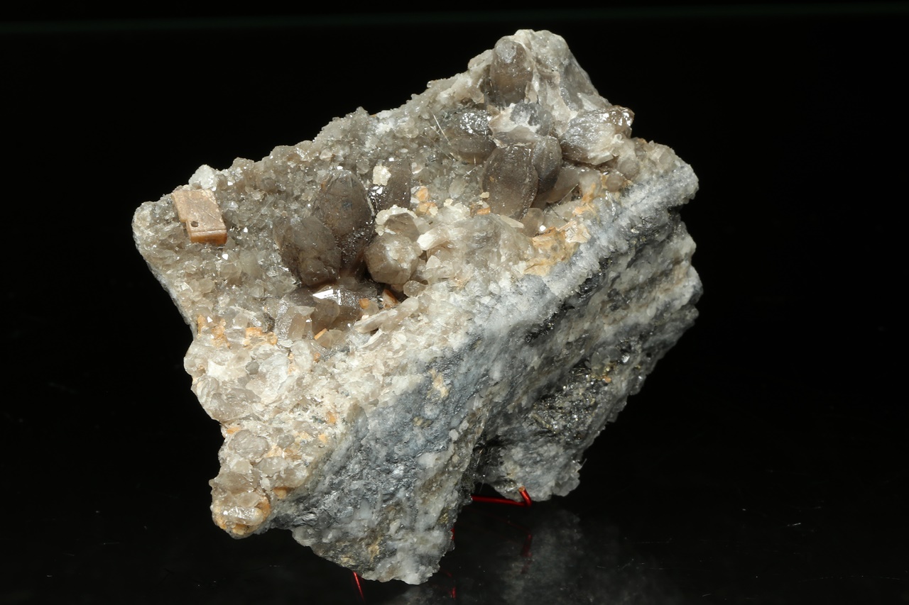 Zweiseitiges Muster, auf einer Seite können 1 cm große Kristalle aus Quarz in untypischer brauner Farbe mit einem Siderit-Rhomboeder beobachtet werden, auf der anderen Seite dann Nadeln aus Boulangerit und Kristalle aus schwarzem Tetraedrit.