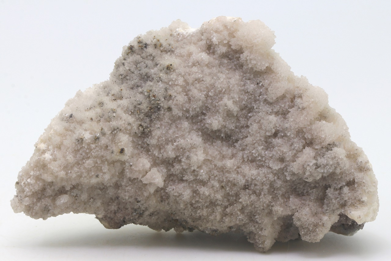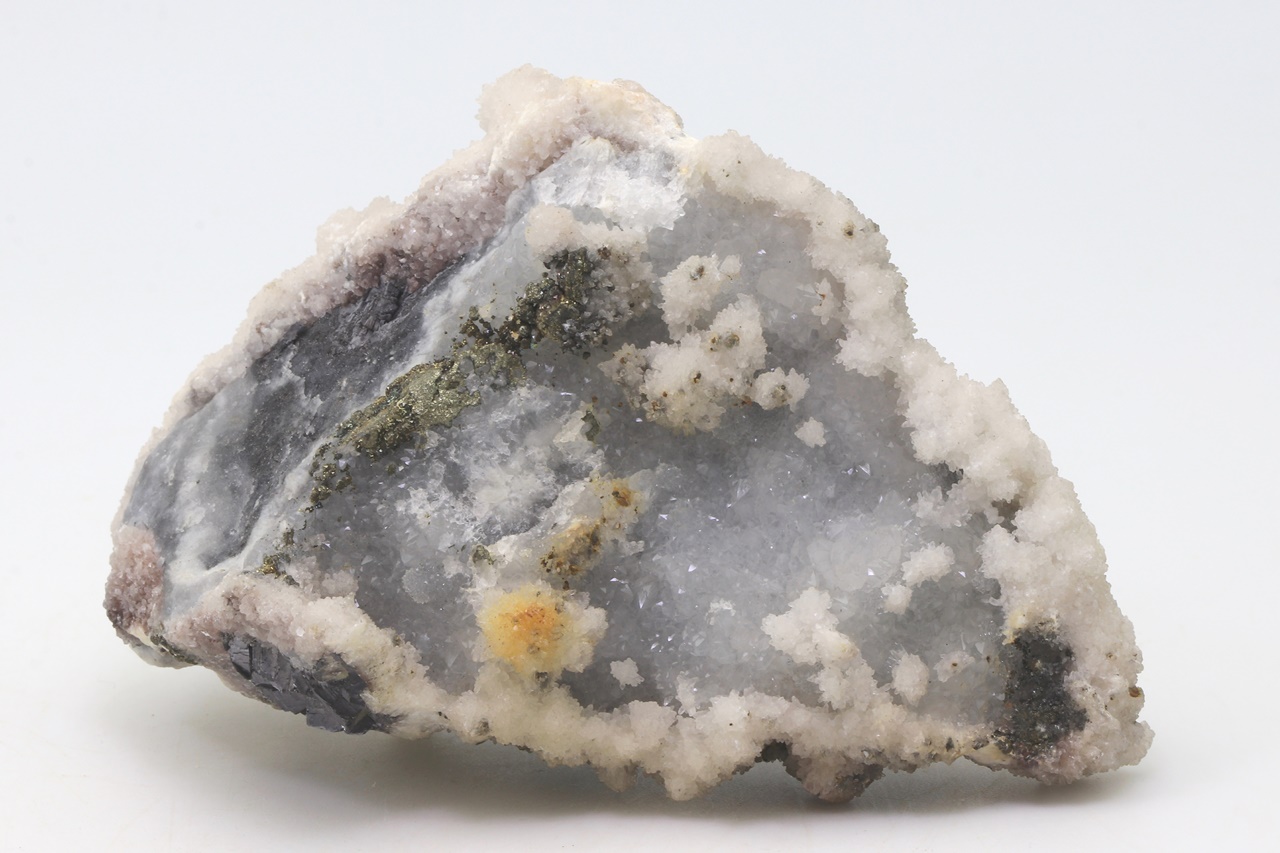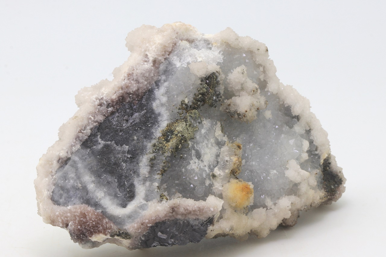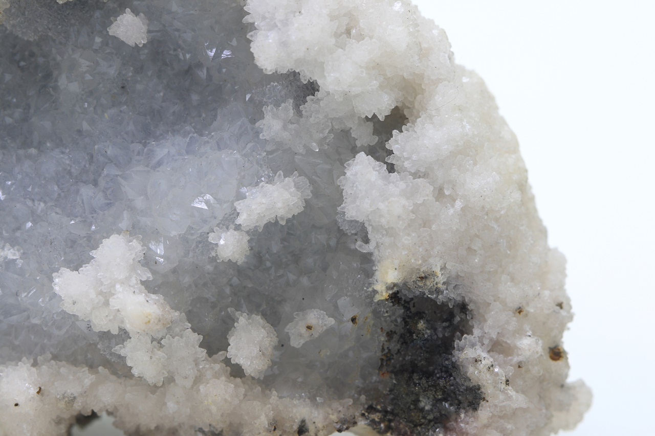 Druse aus klarem Quarz, überwachsen mit kleinen Calcit-Kristallen.