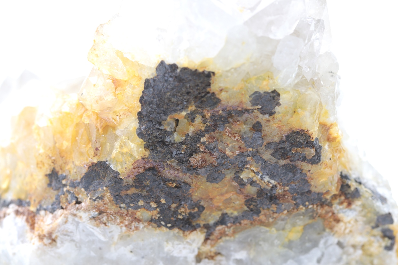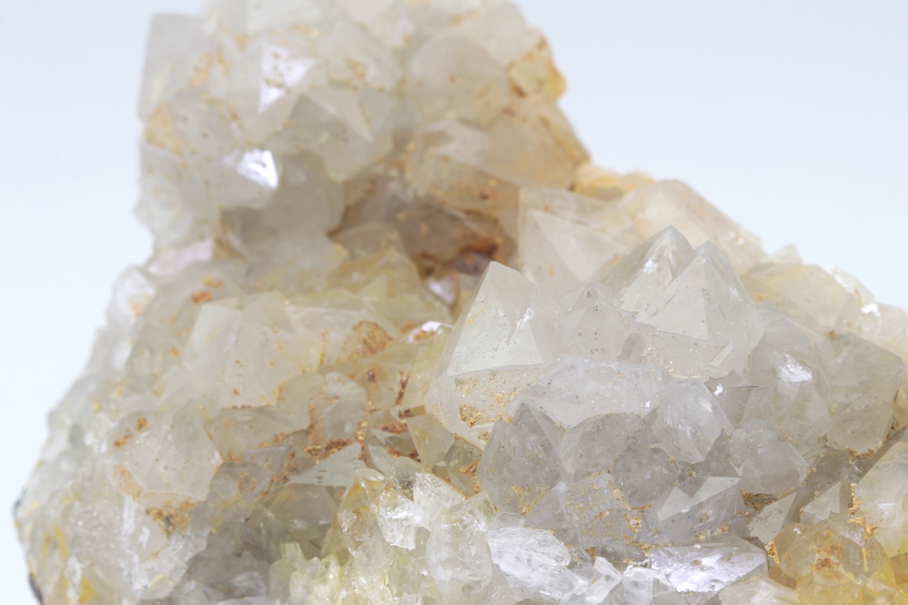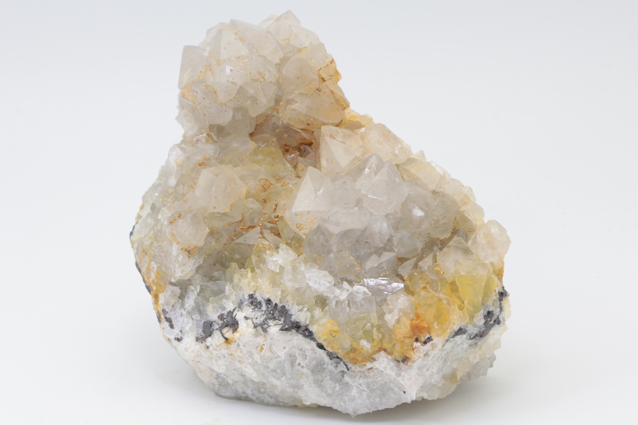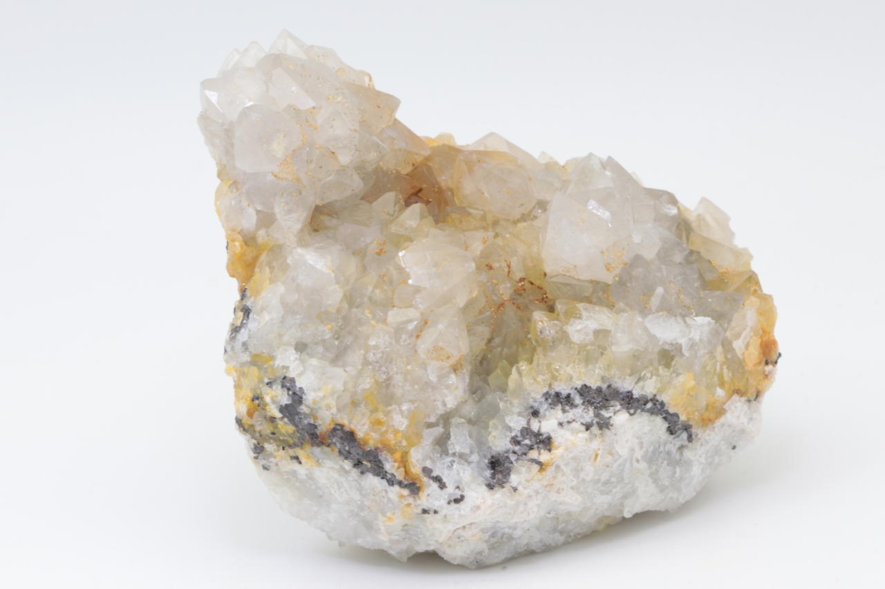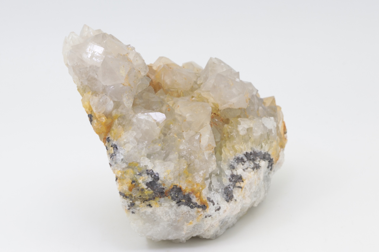 Schönes und ästhetisches Beispiel von durchsichtigen, glasglänzenden Quarzkristallen. Die einzelnen Kristalle erreichen eine Größe von bis zu 3 cm. Im unteren Teil der Probe befinden sich auch unregelmäßige, diamantglänzende, metallisch graue Aggregate und Körner von Sfalerit. Es handelt sich um ein schönes Beispiel von Quarz aus der tschechischen Lokalität Stříbro.