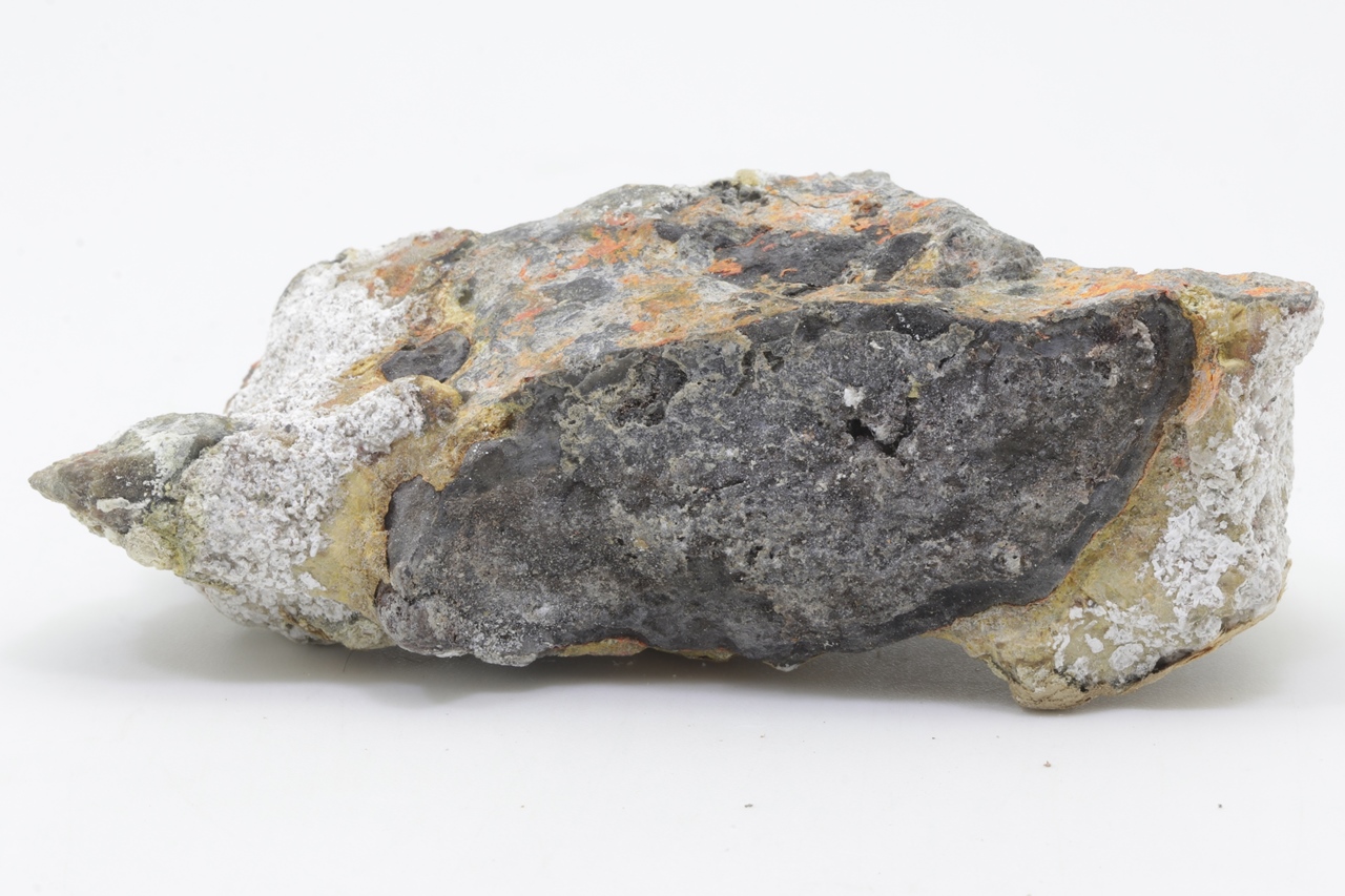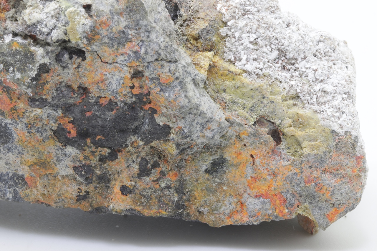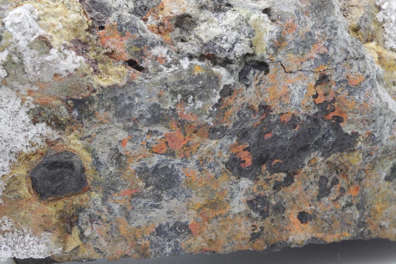 Orange Realgar-Wachstum auf schwarzem Arsen.