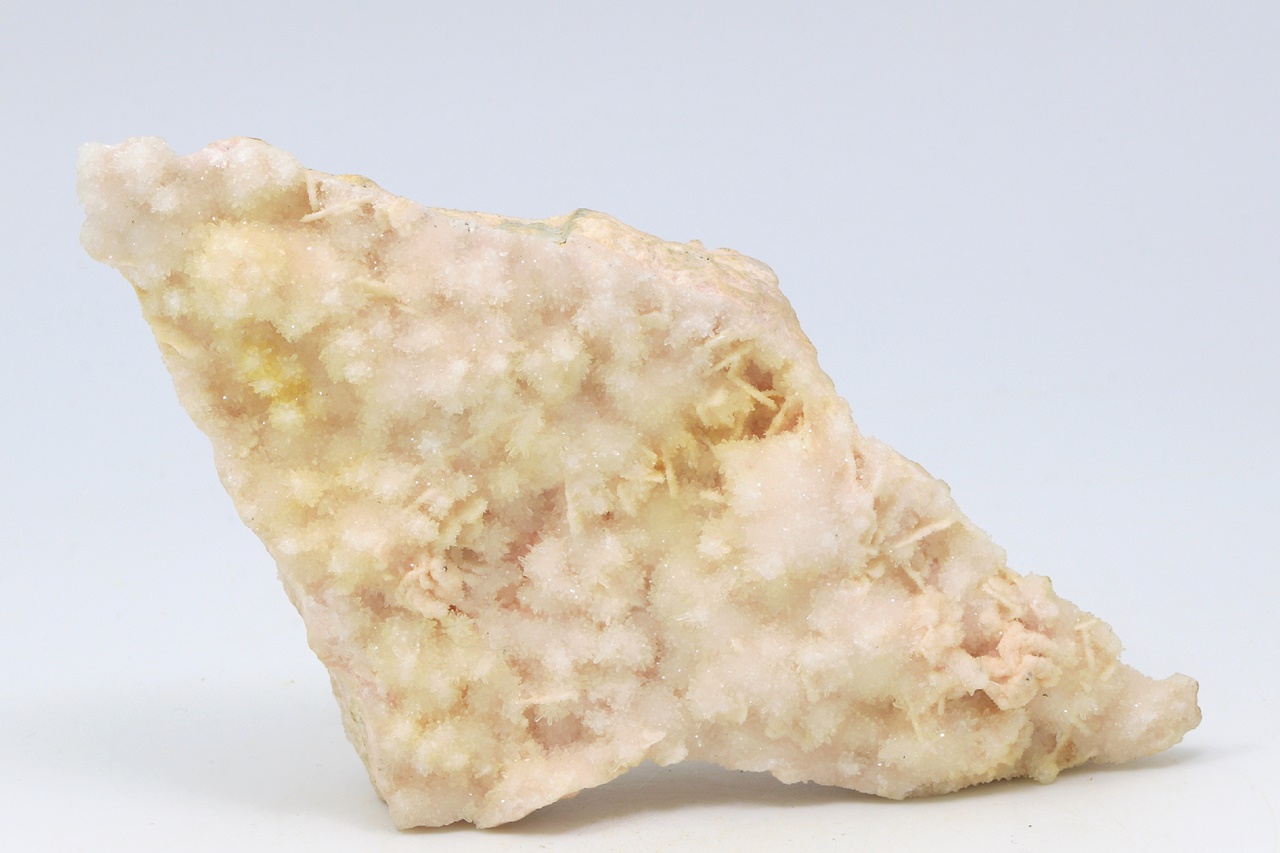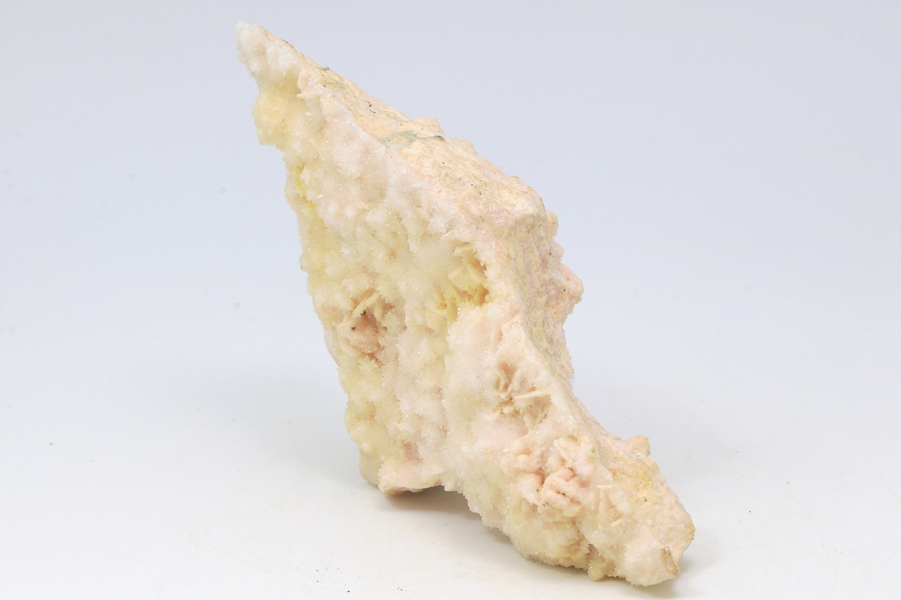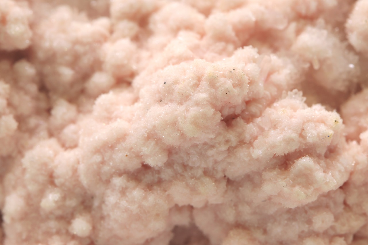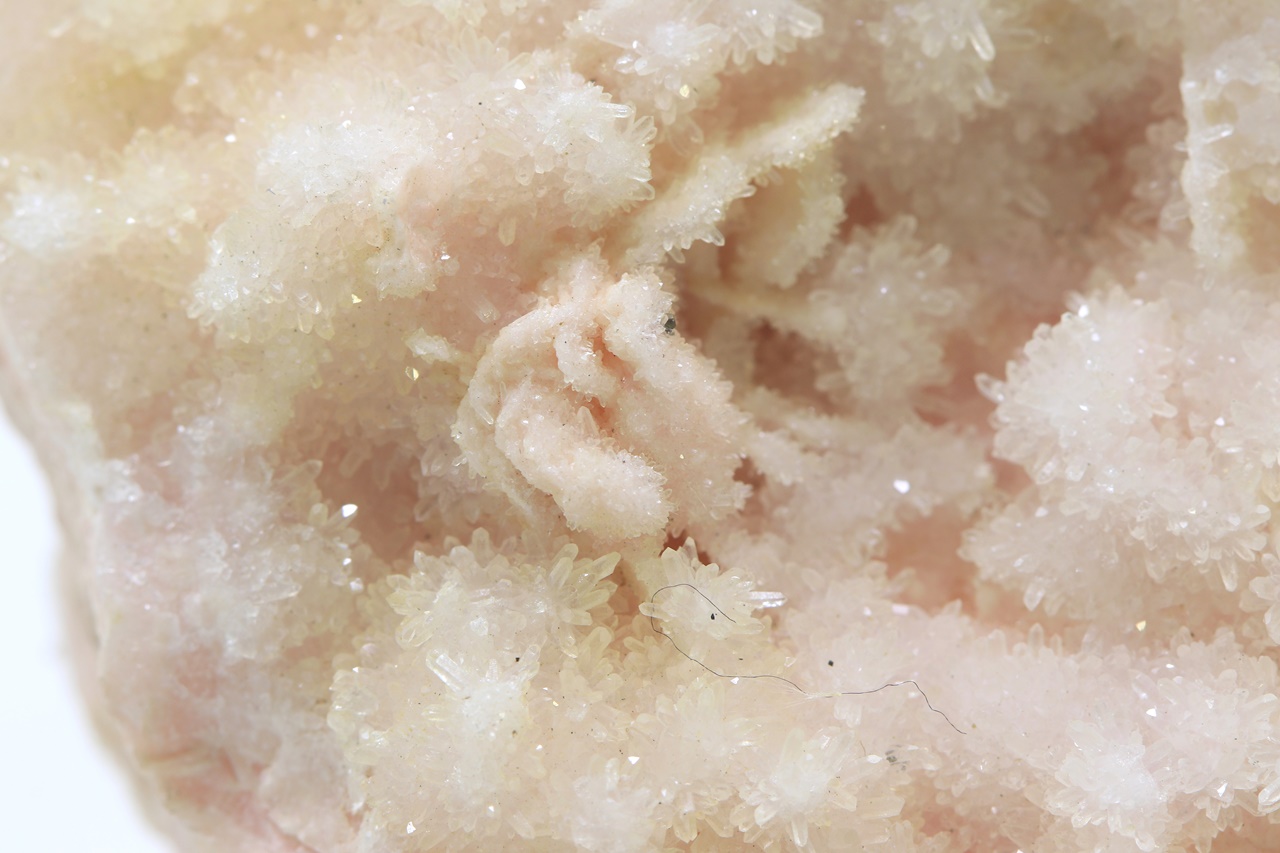 Zweiseitiges Muster des Rhodochrosit, auf der einen Seite gebildet aus kugelförmigen Aggregaten und auf der anderen Seite überwuchert von feinem Quarz und tafelförmigen Rhodochrosit-Kristallen.