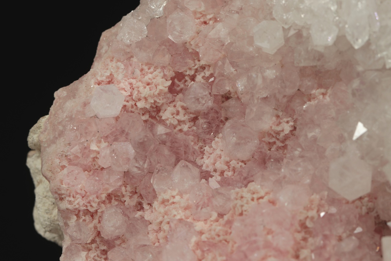 Ästhetische Druse des rosa Rodochrosits, durchwachsende Kristalle aus klarem Quarz .