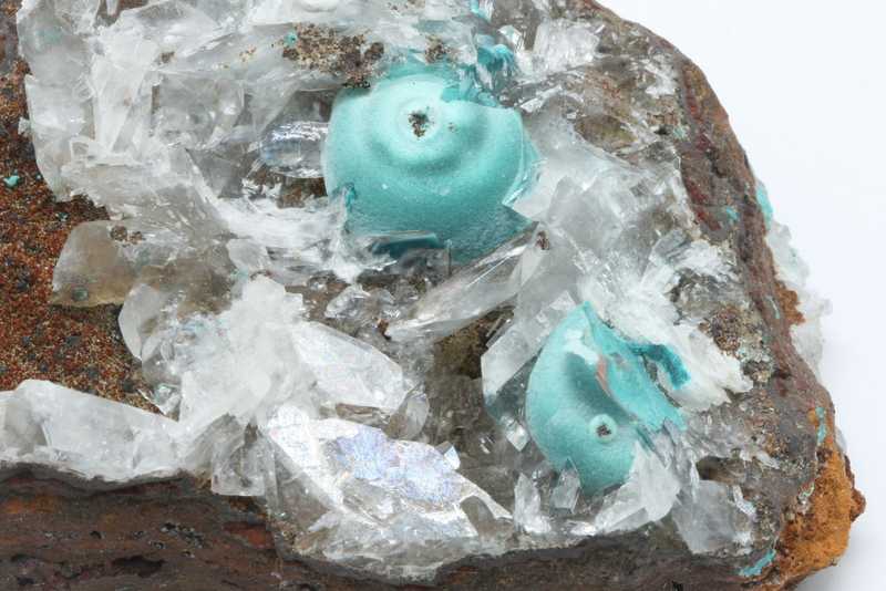 Probe mit samtigem, nierenförmigem Aggregat aus Kupfer- und Zinkcarbonat aus der bekanntesten aktiven mexikanischen Erzmine. Probe mit türkisfarbenen, nierenförmigen Aggregaten von Rosasit bis zu 16 mm Größe in Begleitung von klaren Calcitkristallen.