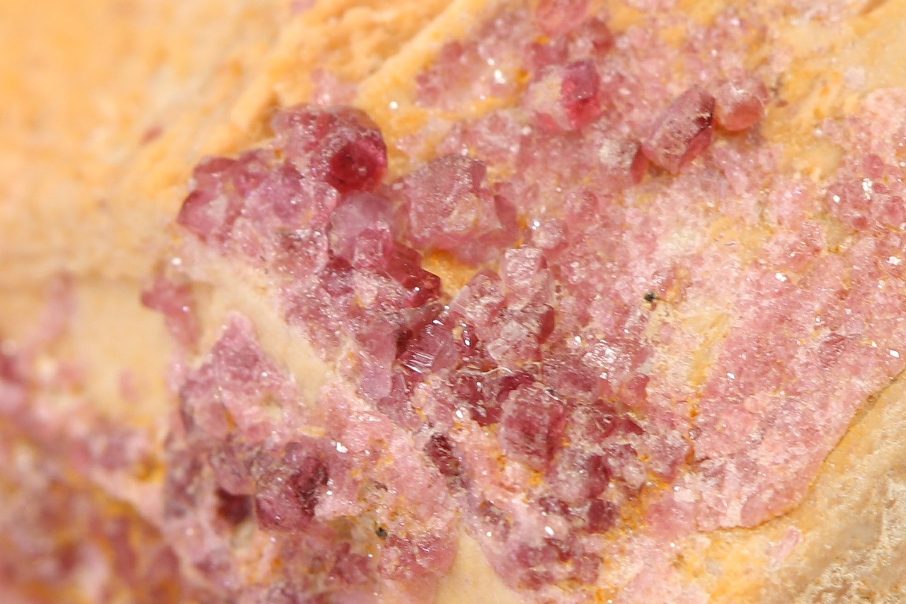 Glänzende Kristalle von rosafarbenem Turmalin, gewachsen auf einem beigen Kristall von Feldspat. Der größte Kristall von Rubellit ist 2 mm groß.