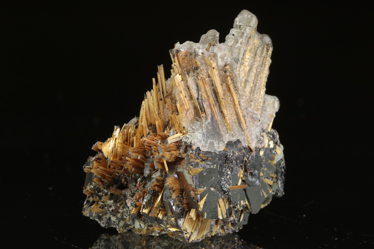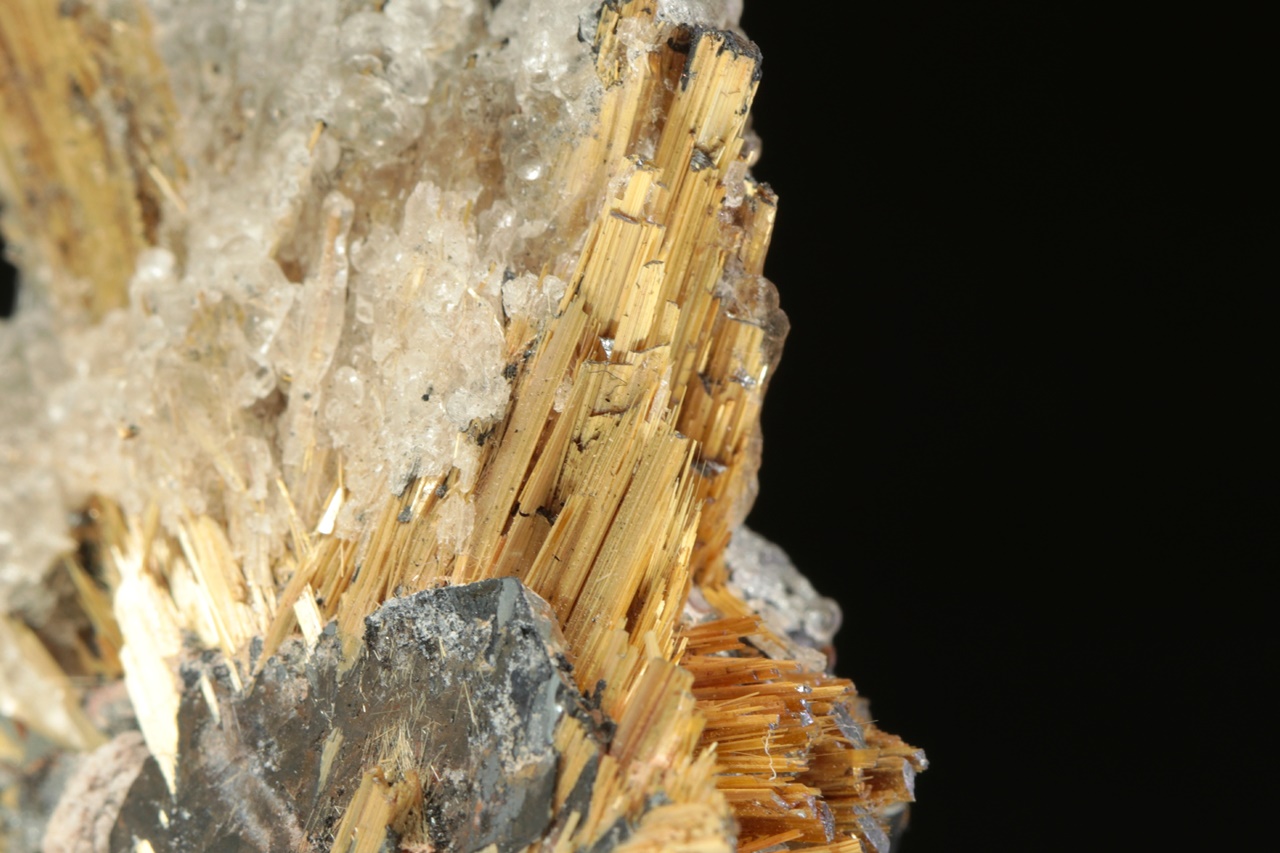 Wunderschönes Exemplar goldener Rutilstängel, die aus schwarzem glänzendem Hematit herauswachsen, teilweise überwachsen mit unter UV-Licht leuchtendem Hyalit. Die längsten Rutilstängel sind 2 cm groß.