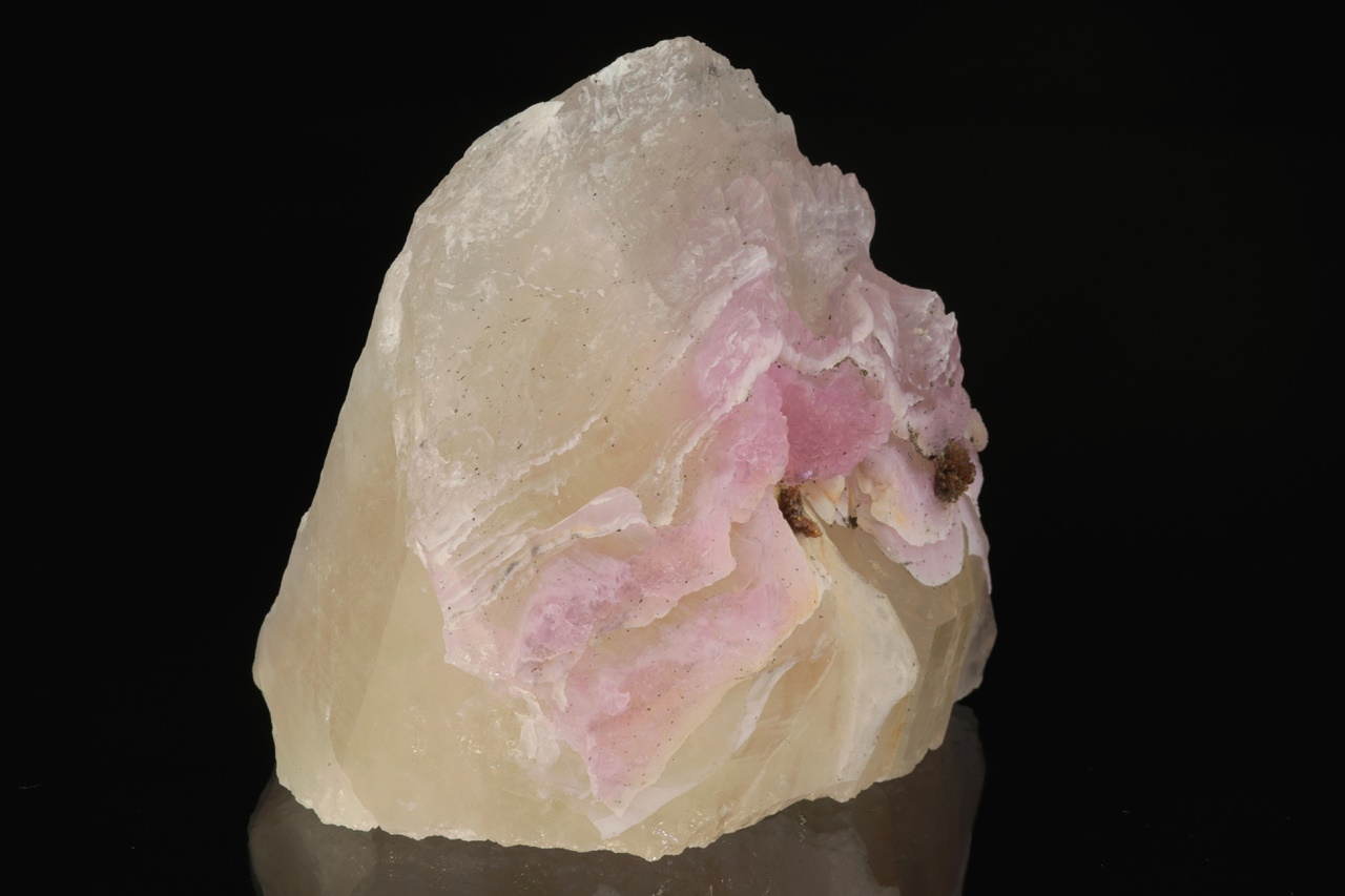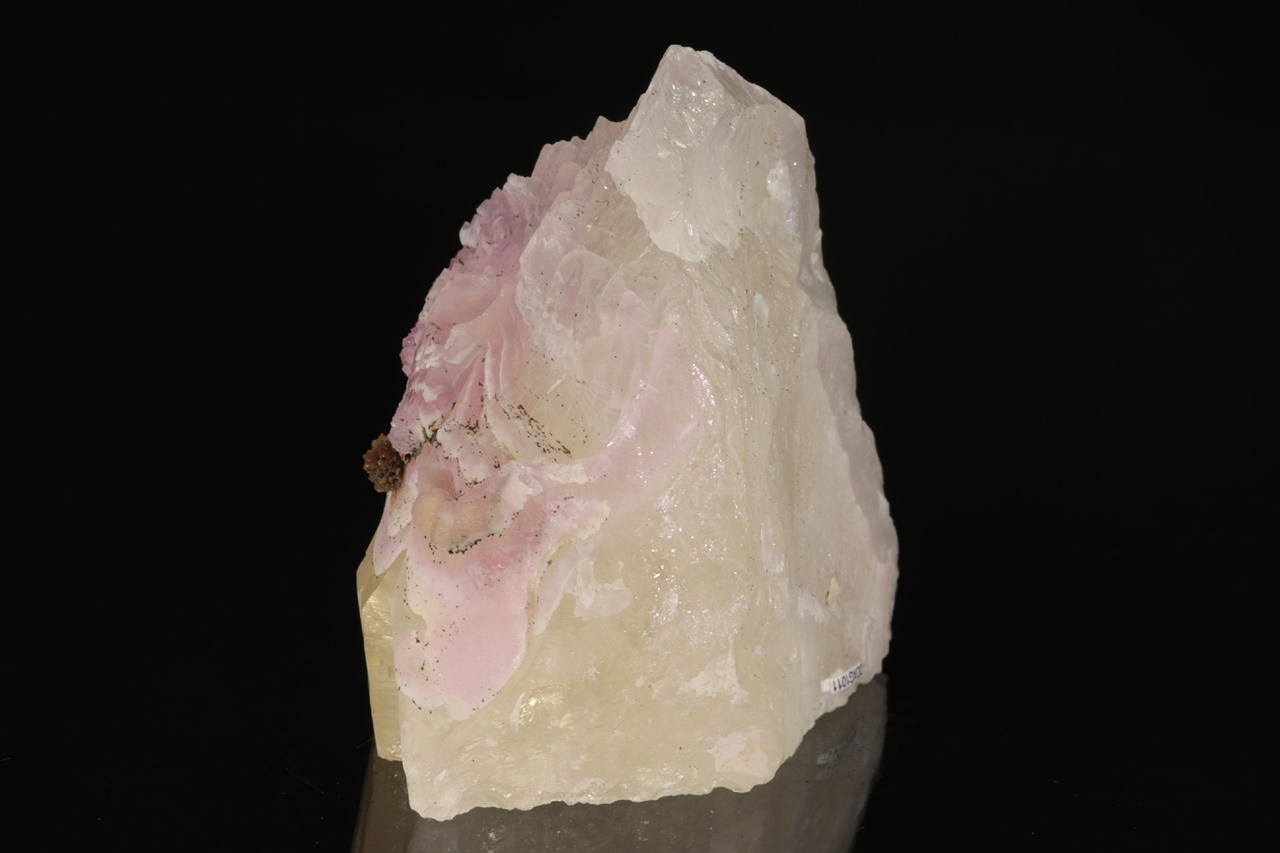 Velmi vzácný krystalovaný růženín narůstající na starší kříšťál s radiálními agregáty eosforitu. Větší agregát je 8 mm velký.