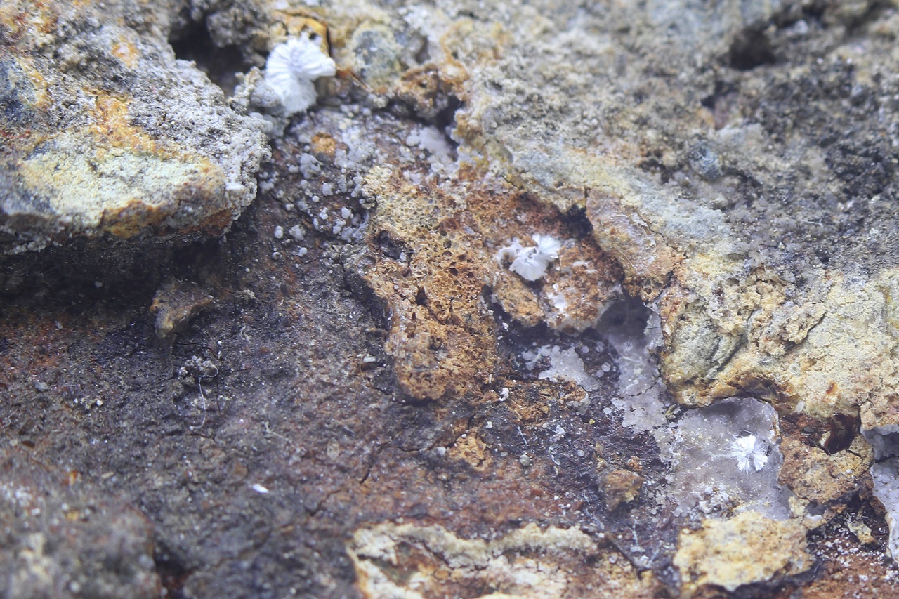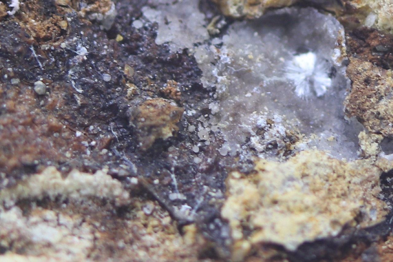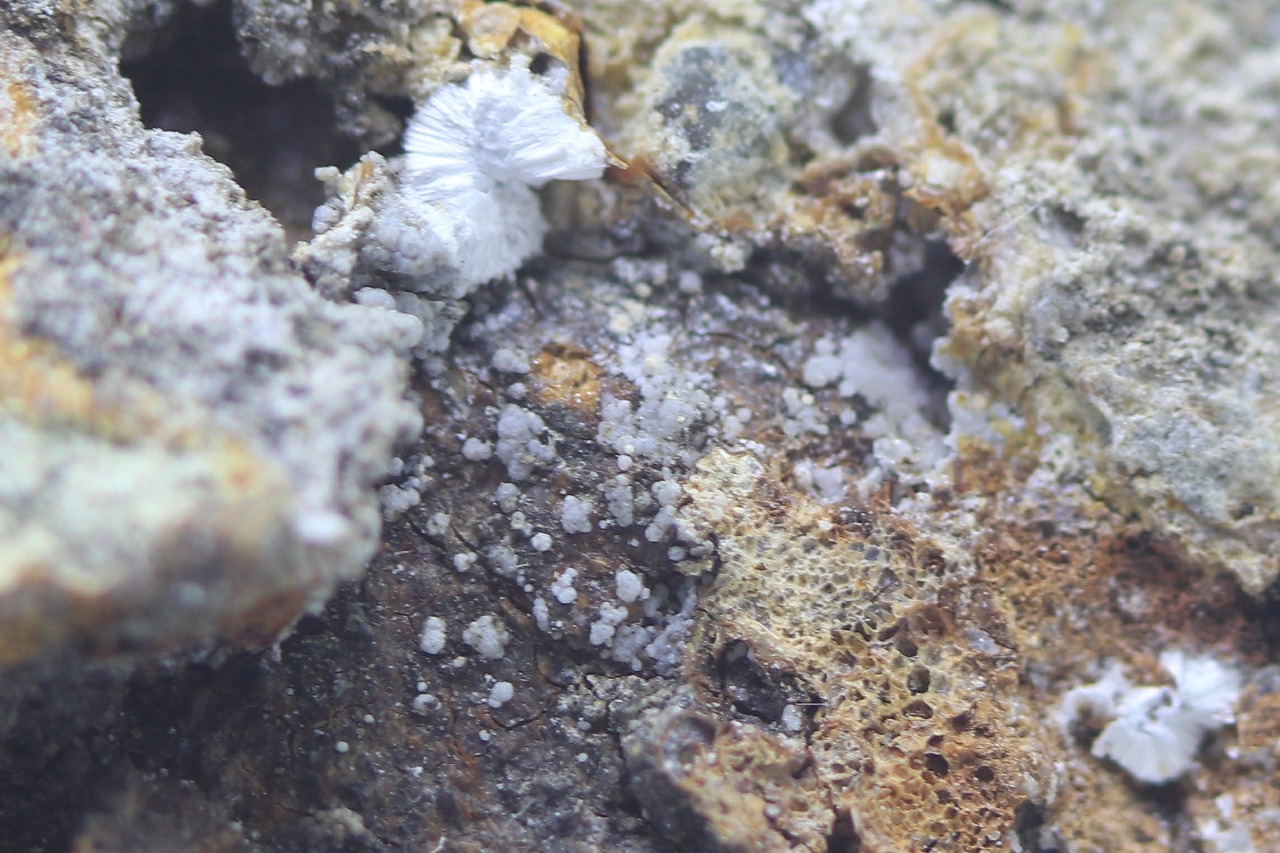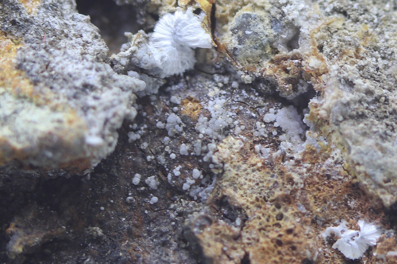 Durchscheinende kugelförmige Aggregate eines seltenen Sulfats gewachsen in einer Höhle von ungefähr 3 cm Größe.