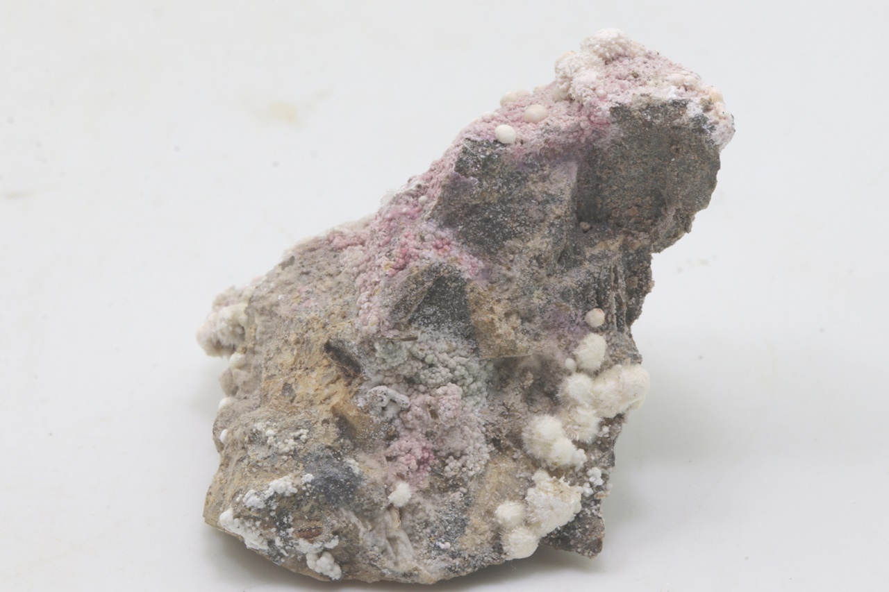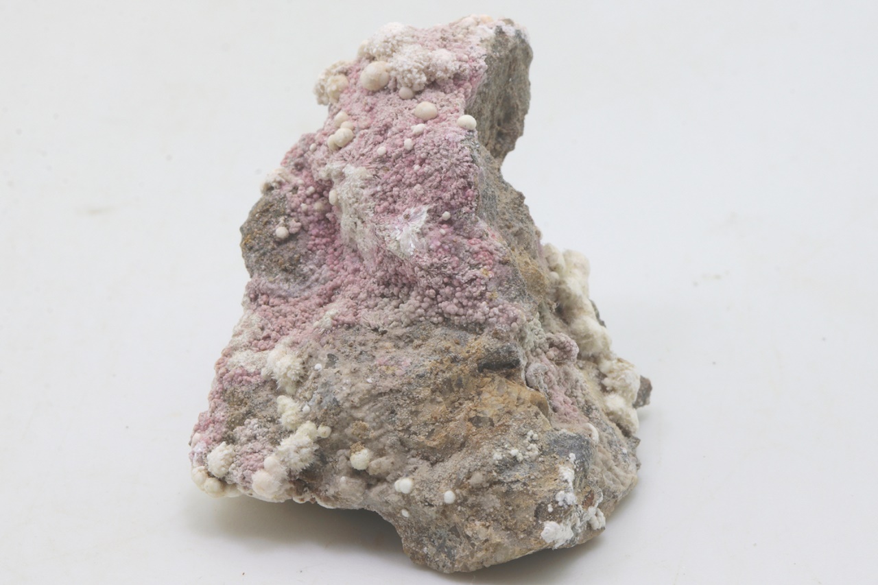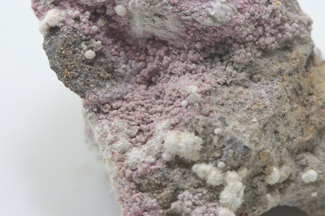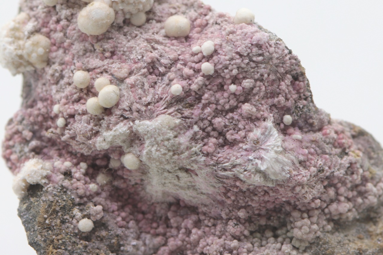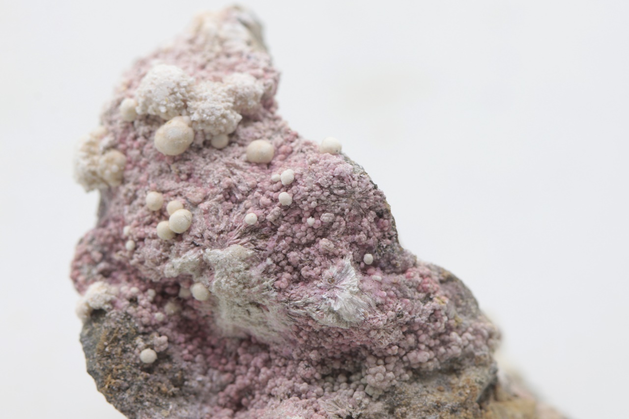 Außergewöhnlich reichhaltige Probe des seltenen Calciumarsenats, das rosa kugelförmige Aggregate bildet.