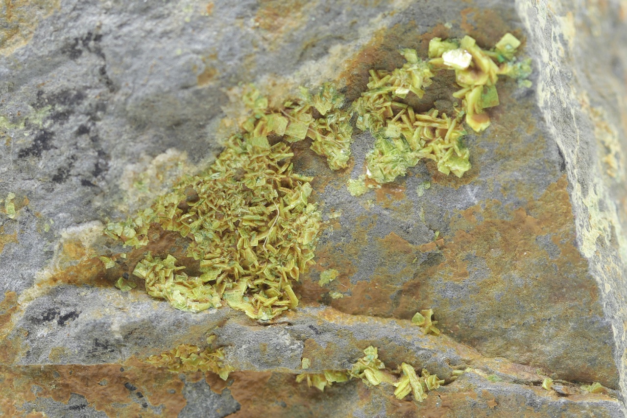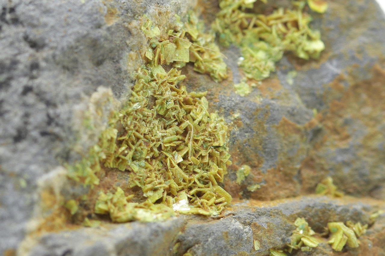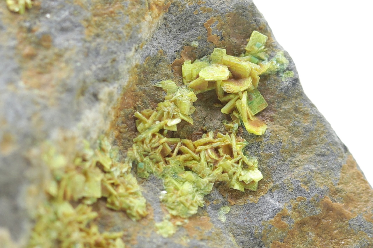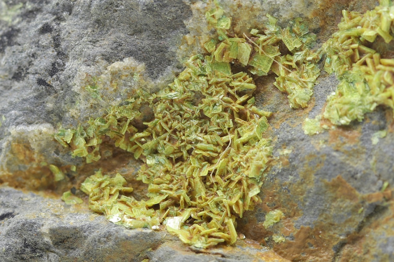 Bis zu 1,5 mm große Kristalle von gelbem Uranylphosphat.