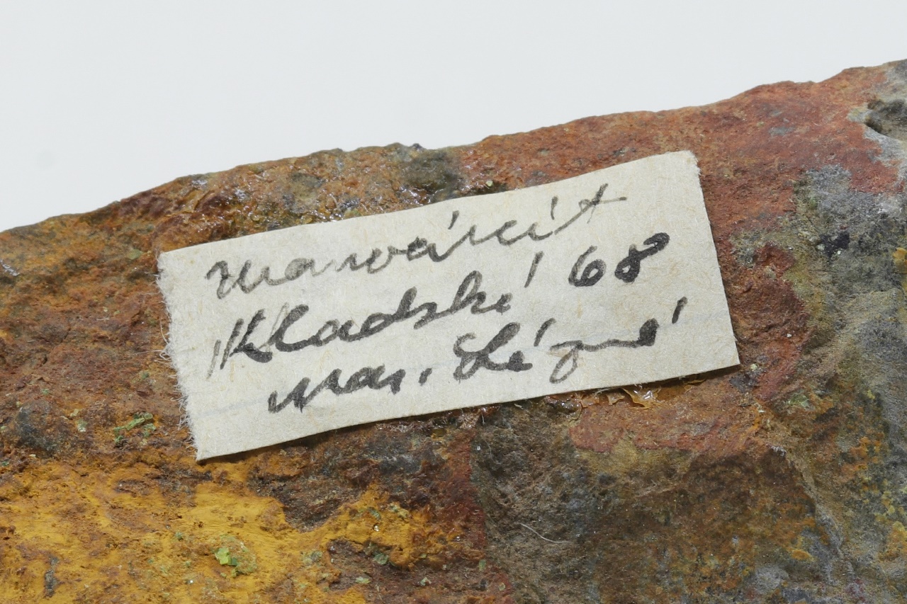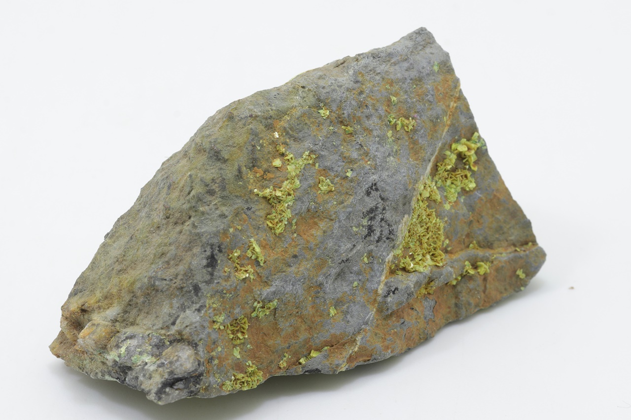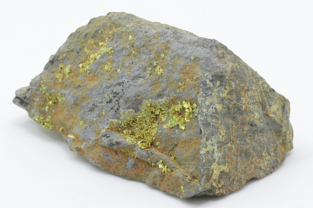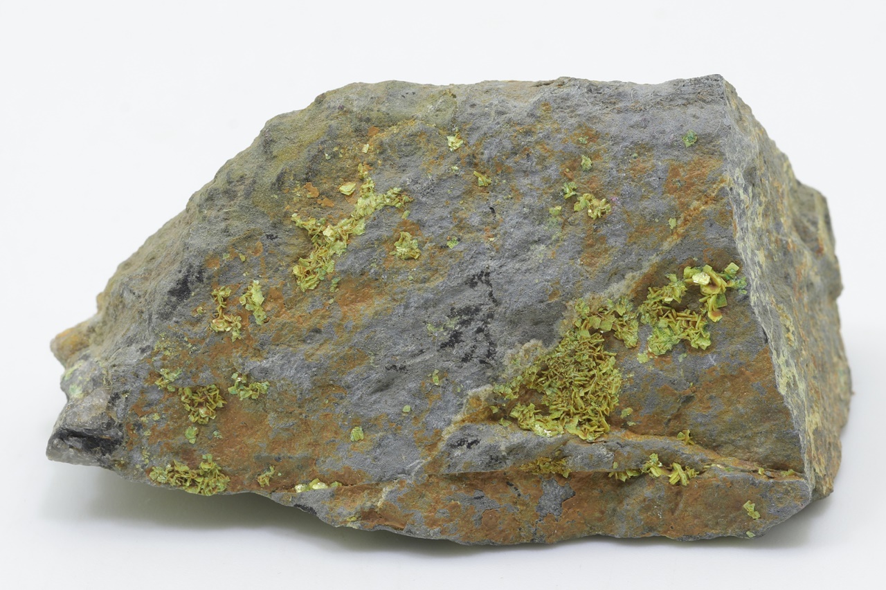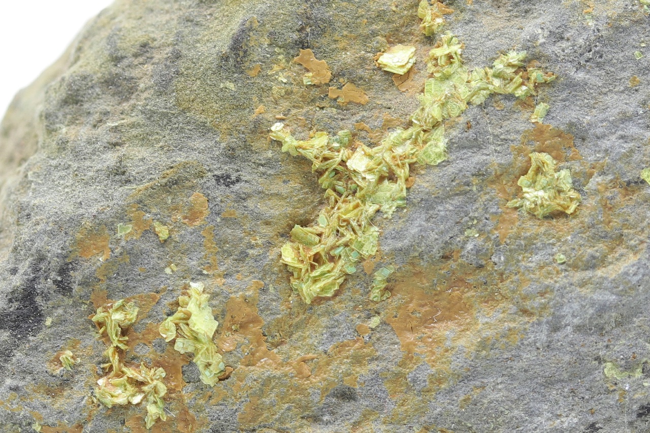Bis zu 1,5 mm große Kristalle von gelbem Uranylphosphat.
