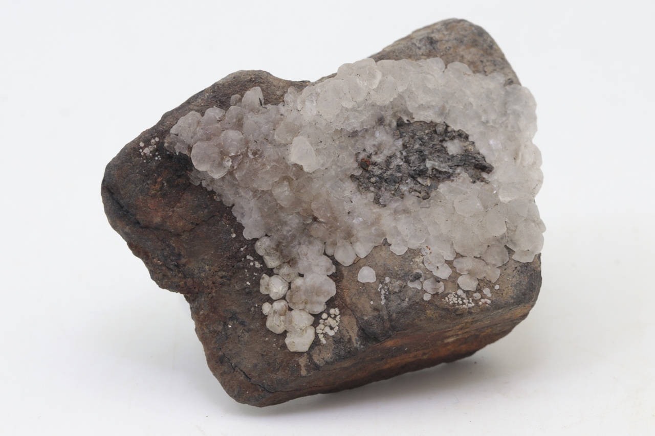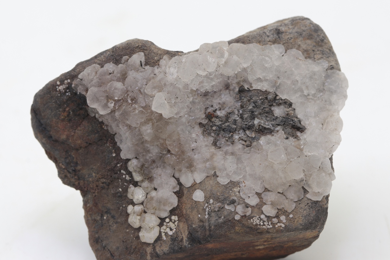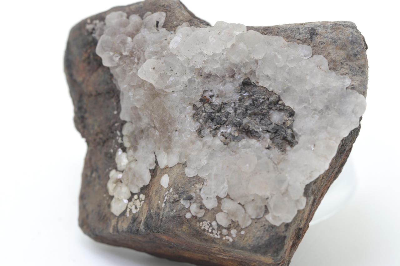 Salmiak bildet farblose bis grauliche, durchscheinende, unregelmäßige Kristalle, die auf ein Substrat aufwachsen. Die einzelnen unregelmäßigen Kristalle wachsen aufeinander und durchdringen sich gegenseitig. Die Salmiakprobe stammt aus der tschechischen Lokalität Kladno.