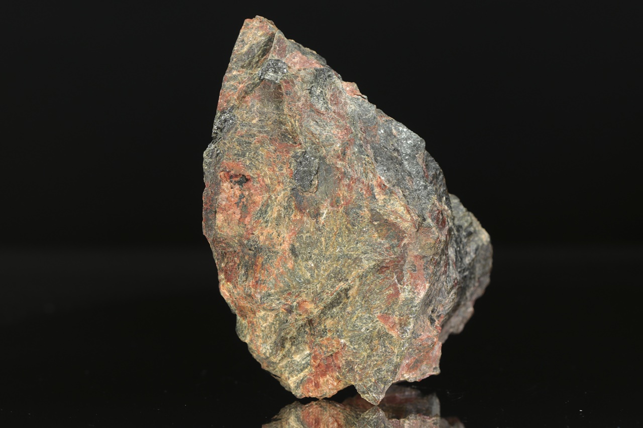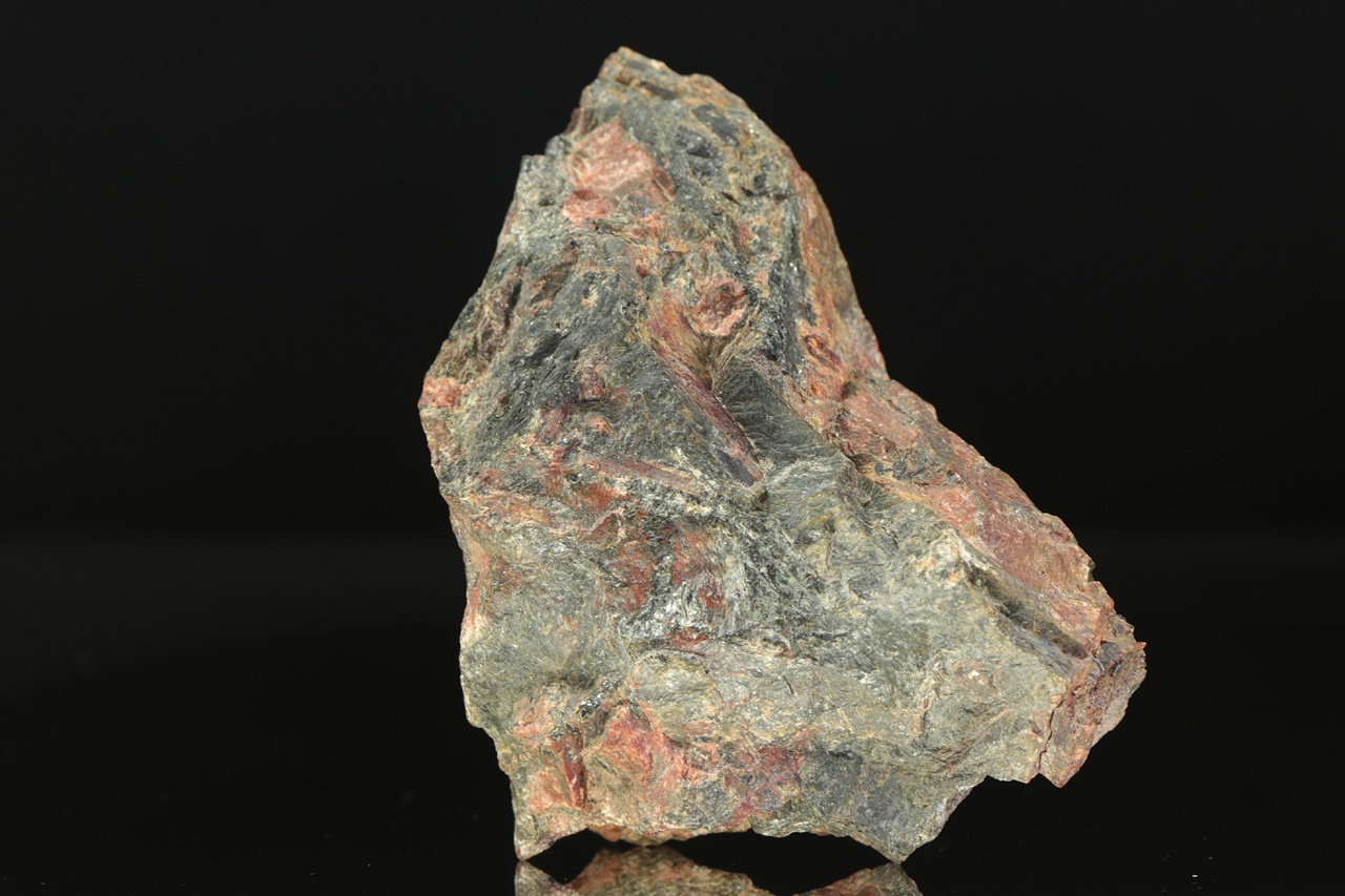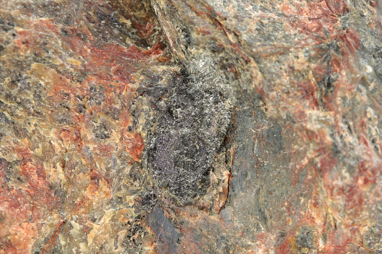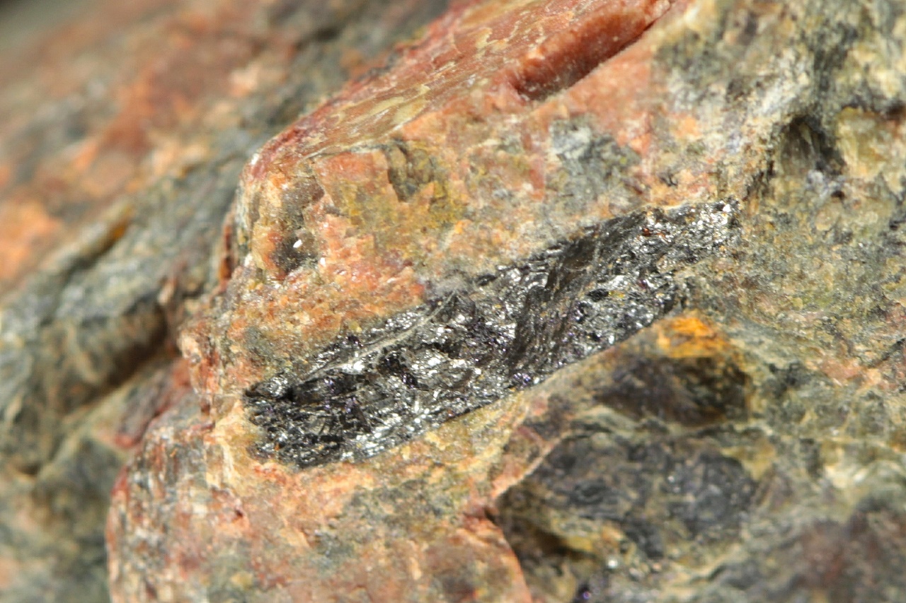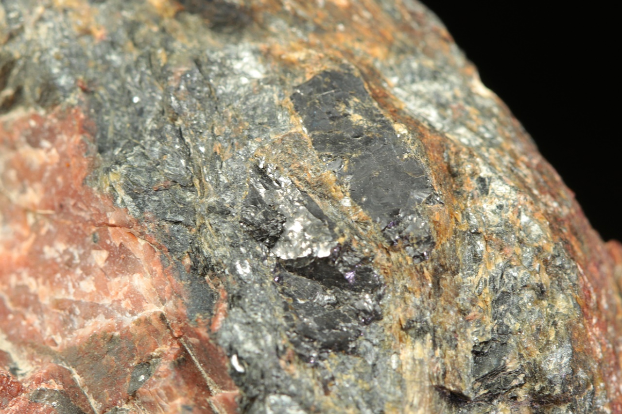 Schwarze, pechglänzende Leisten von Yttrium- und Nioboxid im Pegmatit. Der größte Samarskit ist 1 cm groß.