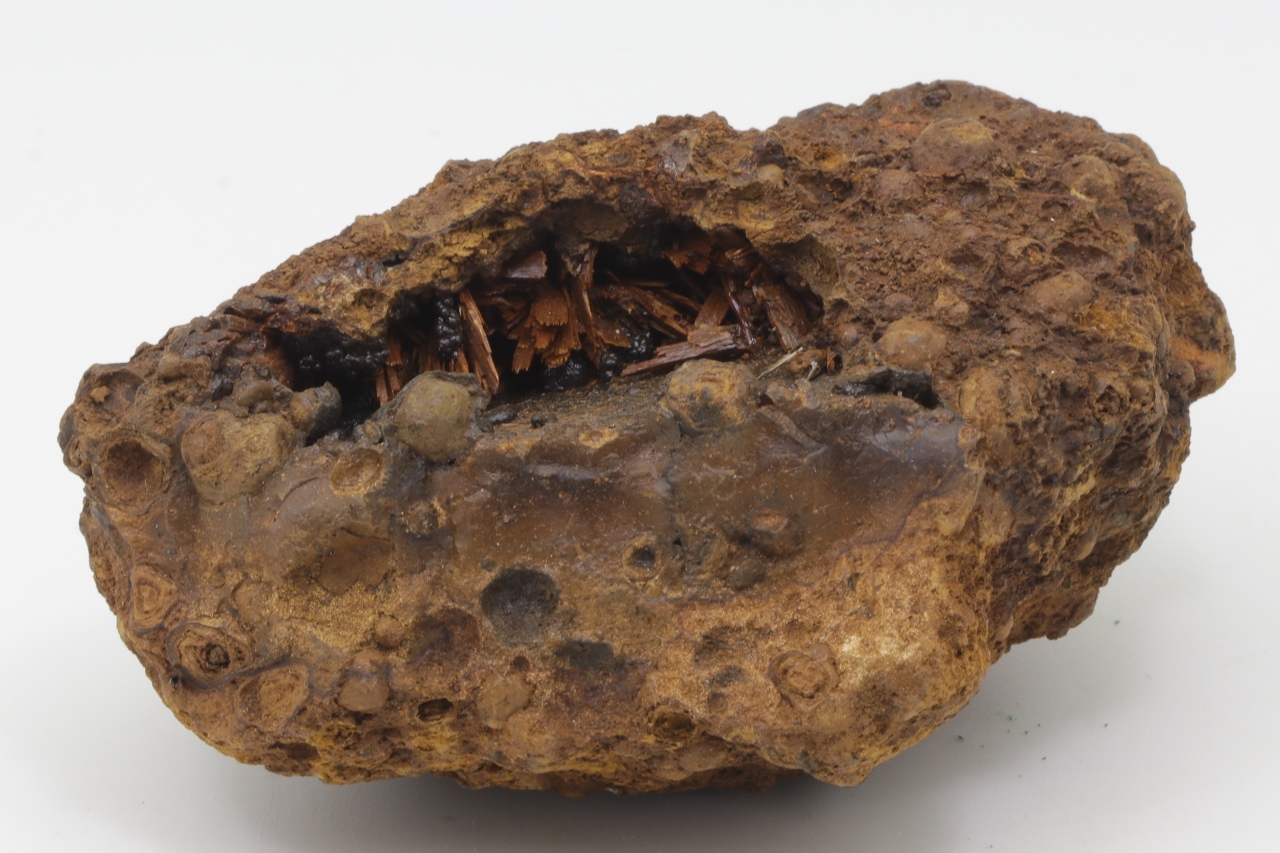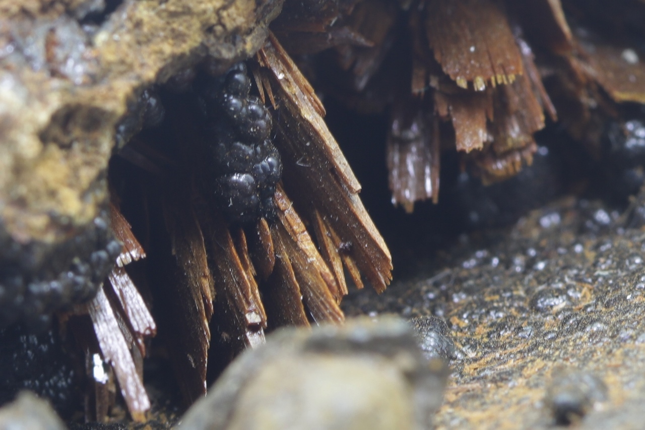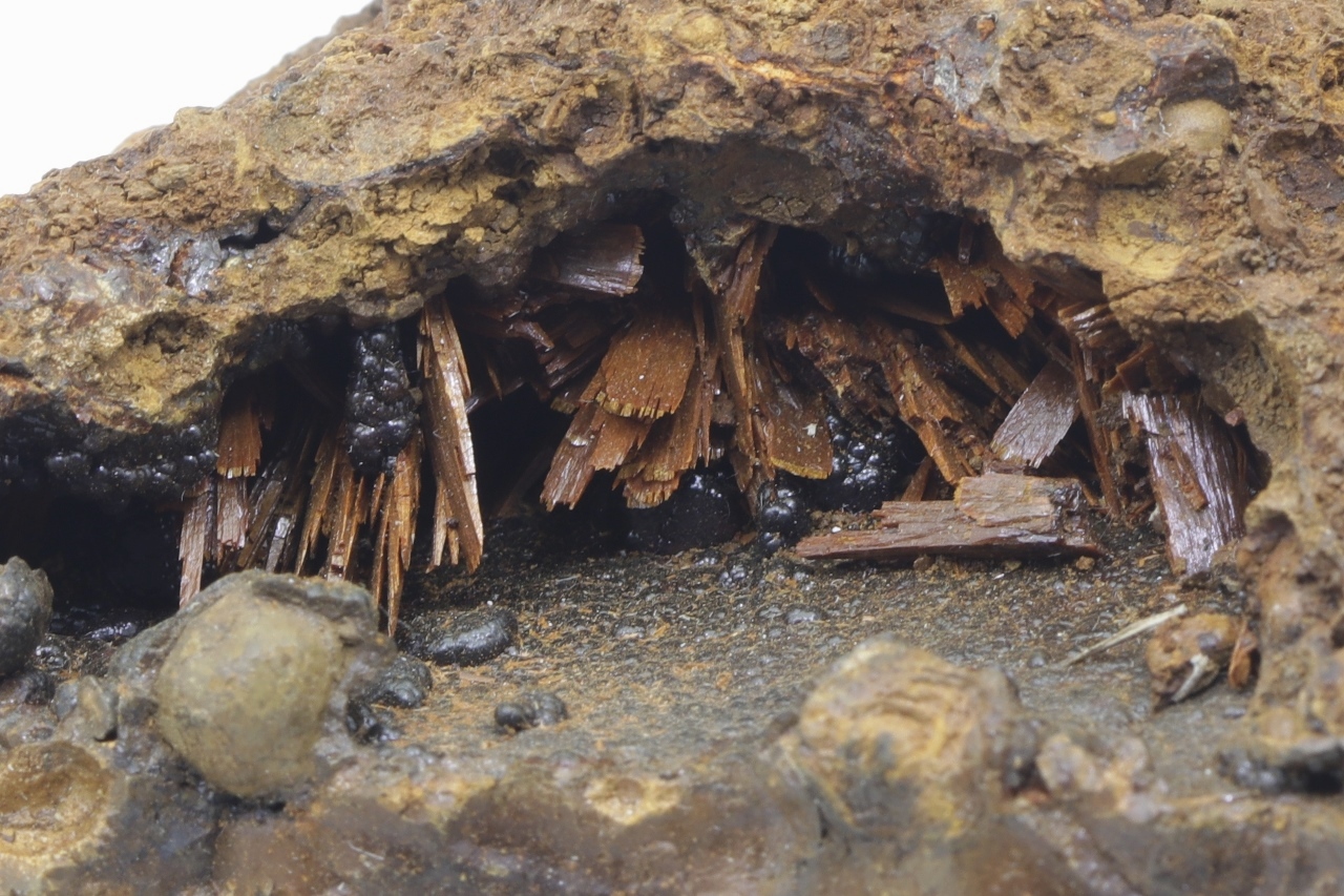 Ockerfarbene Kristalle eines seltenen Eisenphosphats gewachsen in einer Höhle mit den Maßen 4 × 2 cm. Der größte Kristall ist 8 mm groß.