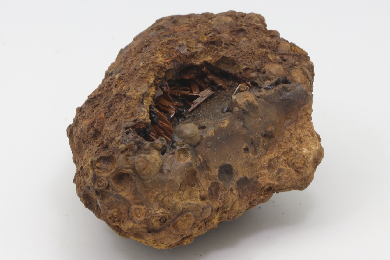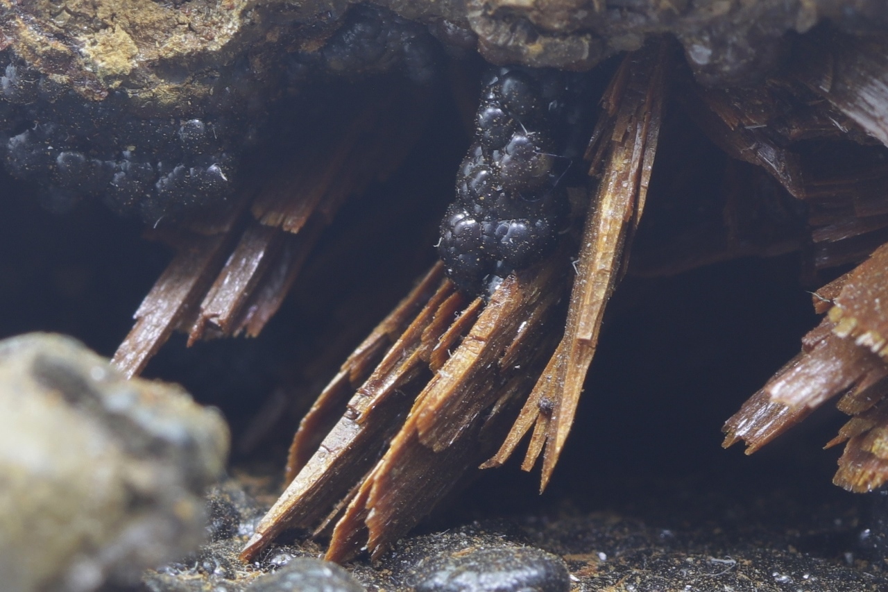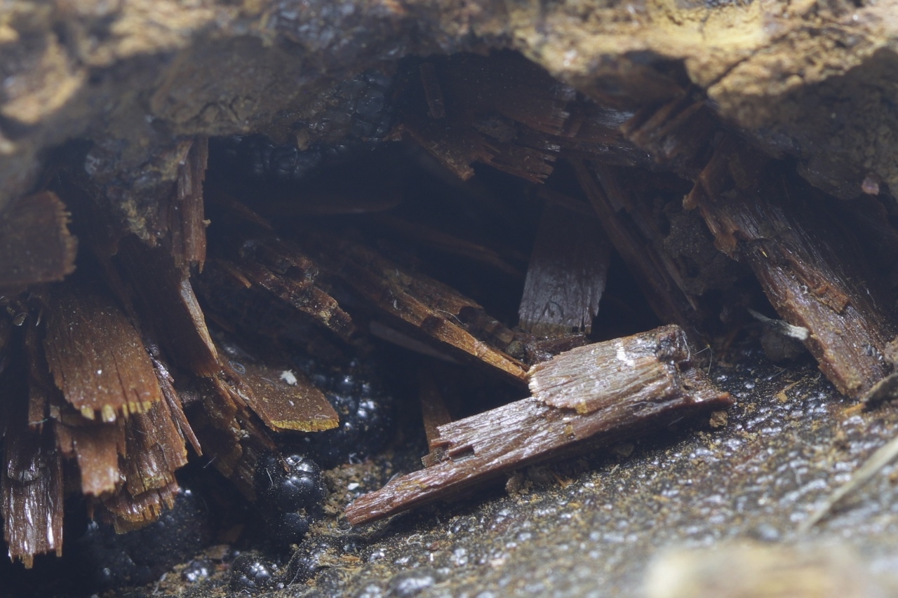 Ockerfarbene Kristalle eines seltenen Eisenphosphats gewachsen in einer Höhle mit den Maßen 4 × 2 cm. Der größte Kristall ist 8 mm groß.