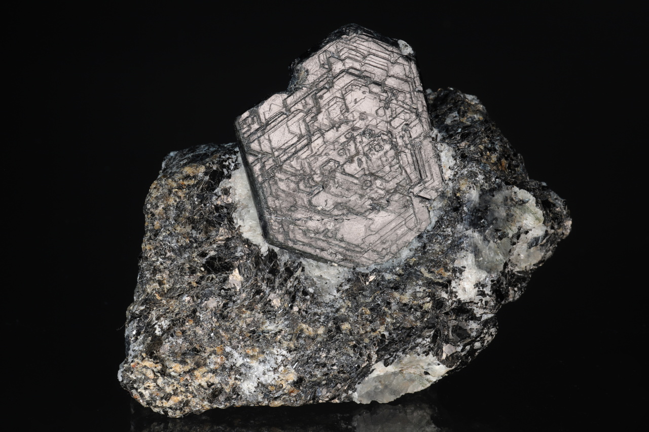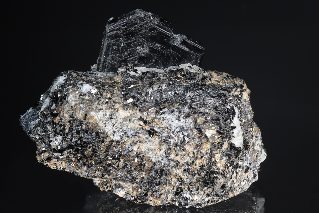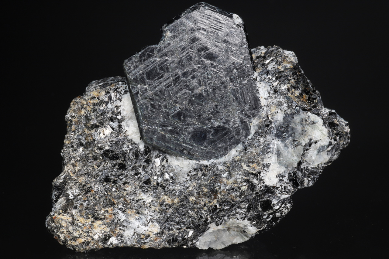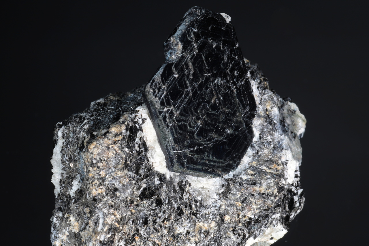 Ein perfektes Beispiel für seltenen Saphirin in Form von flachen, extrem großen Kristallen, die aus neuen Funden in Madagaskar stammen. Saphirin ist ein Silikat, das in den meisten Lagerstätten weltweit nur in Form von kleinen Körnern vorkommt. Er wurde nach der Ähnlichkeit zum Saphir benannt, nicht nur in seiner kristallinen Form, sondern auch in der blauen Farbe, die für einige Saphirine charakteristisch ist. Die angebotene Probe ist ein flacher, dunkler Kristall, der aus biotitischem Gestein präpariert wurde. Die Größe des Kristalls beträgt 4 cm, an der oberen Seite gibt es eine kleine Kontaktstelle mit einem anderen fehlenden Kristall, sonst ist der Kristall vollständig. Der Kristall wurde für die Präparation schonend stabilisiert, war aber nie abgebrochen oder herausgefallen. Die Saphirinkristalle aus der Fundstätte Morafeto sind definitiv die besten und bei weitem größten Kristalle dieses sonst systematischen Minerals weltweit. Es handelt sich um eine perfekte Sammlerprobe.