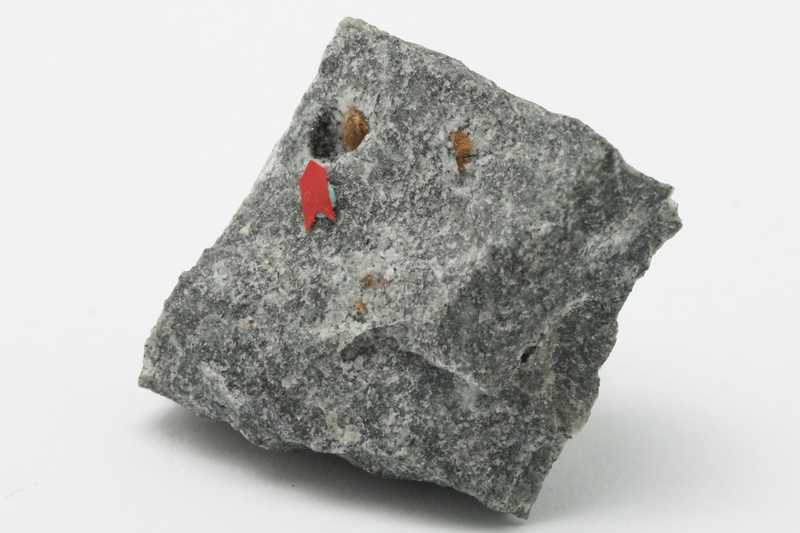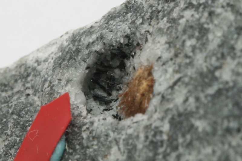 Kleine weiße Kristalle des Seltenen Erden Silikats Sazhinit von einer der vier Lokalitäten weltweit mit einem Busch nadelförmiger Kristalle Tuperssuatsiait. Die Größe der Hohlform ist ca. 0,5 cm.