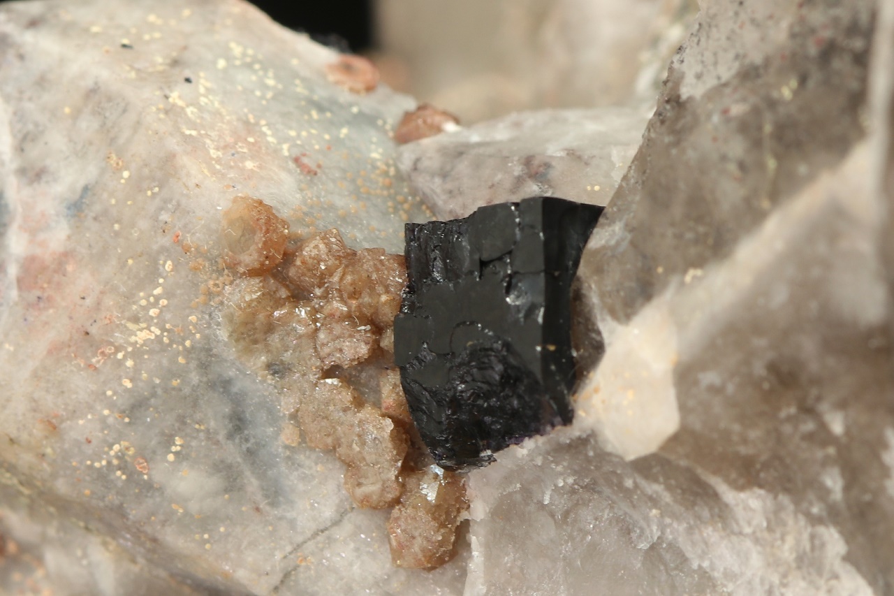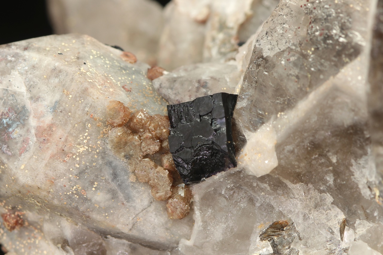Kristall des dunkelvioletten Fluorits mit beige Scheelit, aufgewachsen auf Quarz. Die Größe des Fluorits beträgt 6 mm.