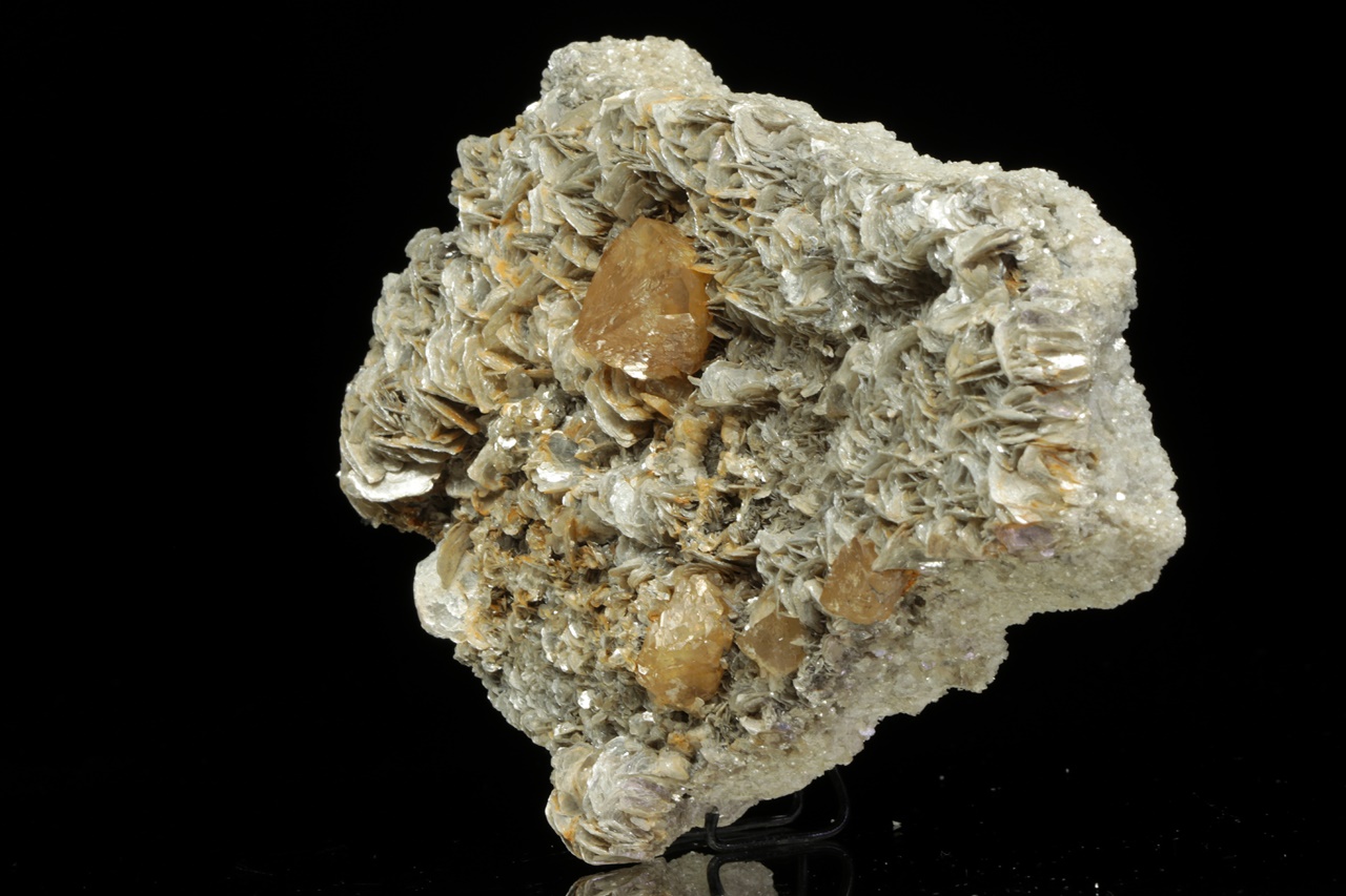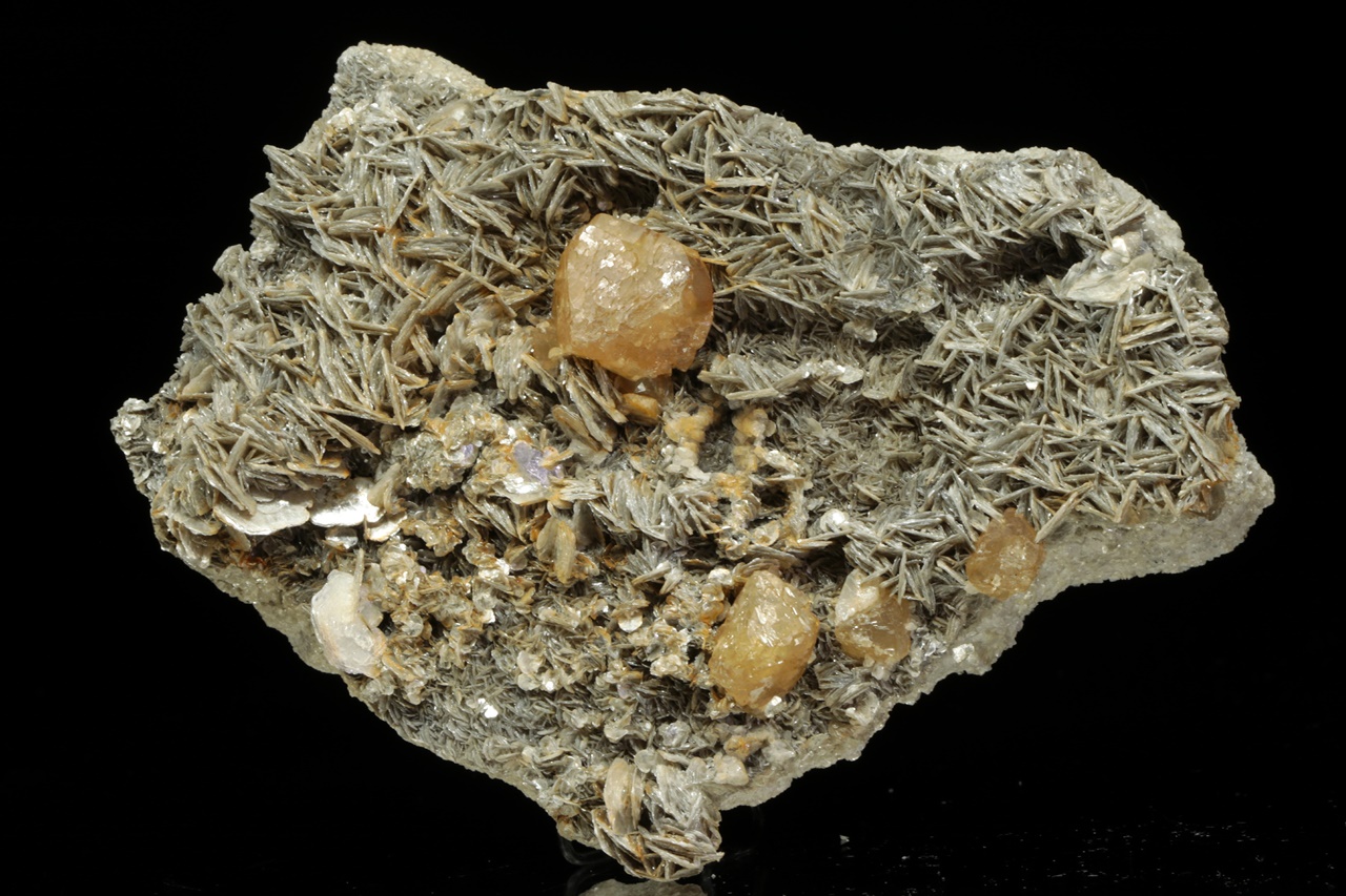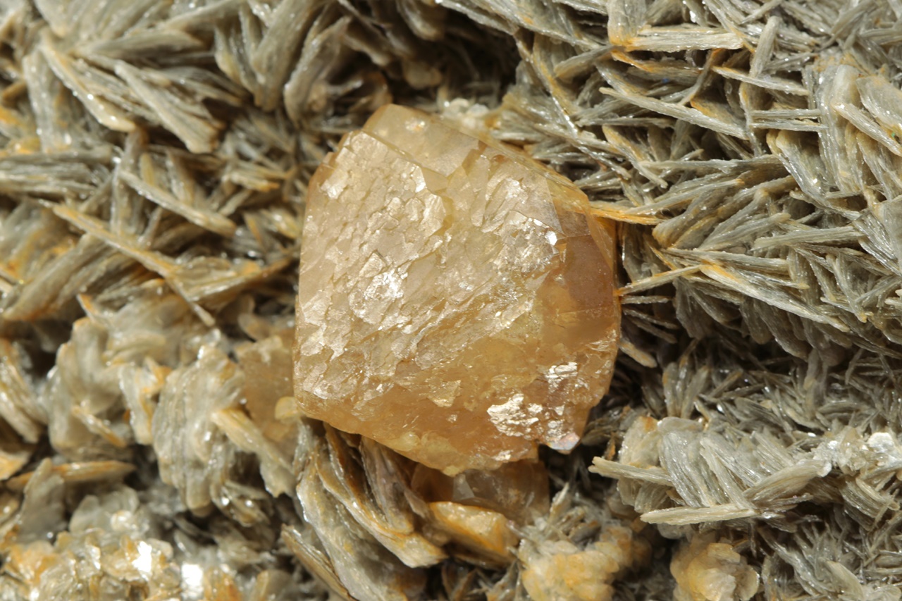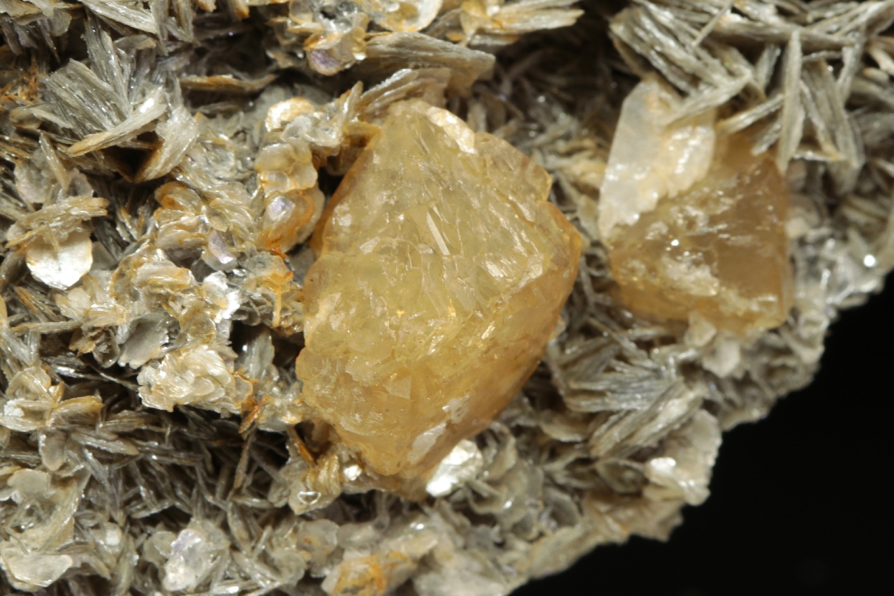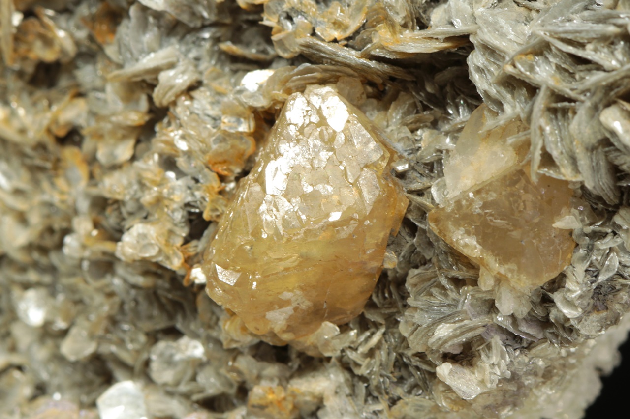 Kristalle von glänzendem honigfarbenem Scheelit bis zu 2 cm Größe, gewachsen auf hellem Muskovit.