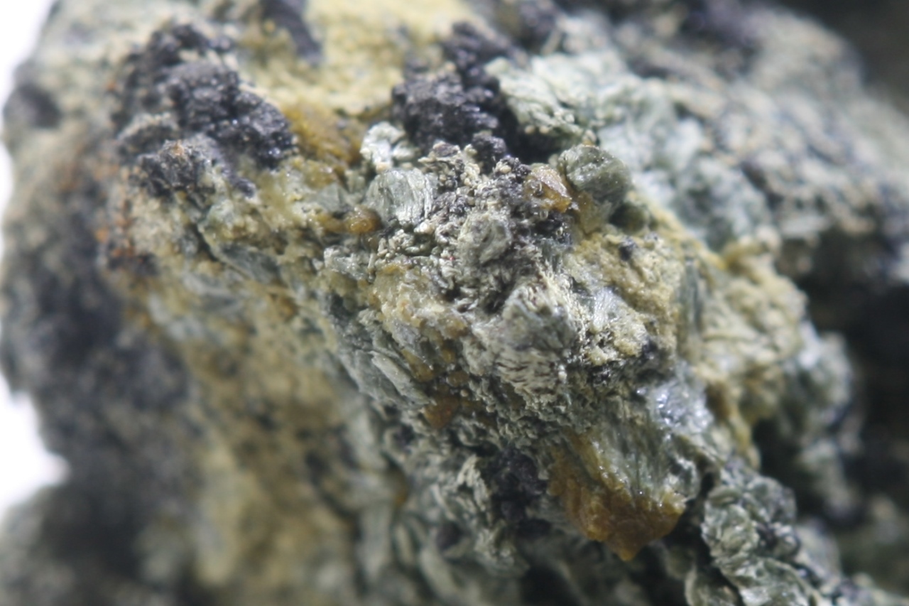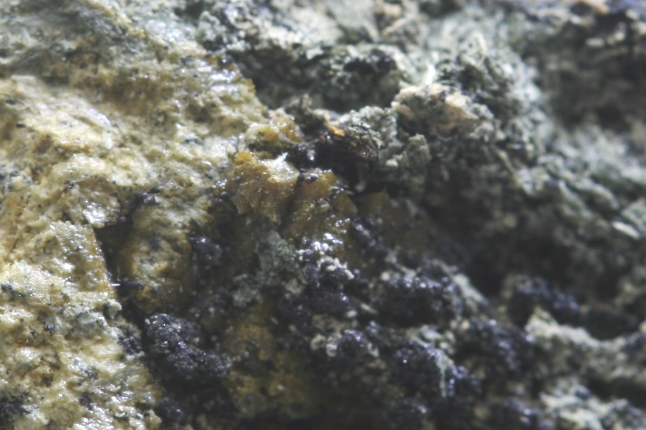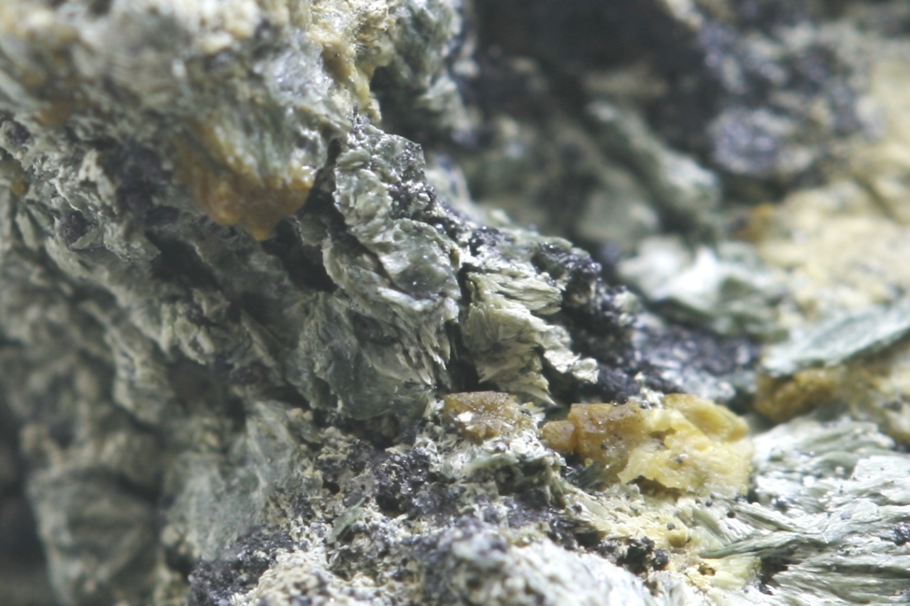 Körner und kleine Kriställchen von Schoenfliesit. Auf dem Gipfel der Stufe ragen einige gut definierte Kristalle von maximal 1 mm Größe heraus .
