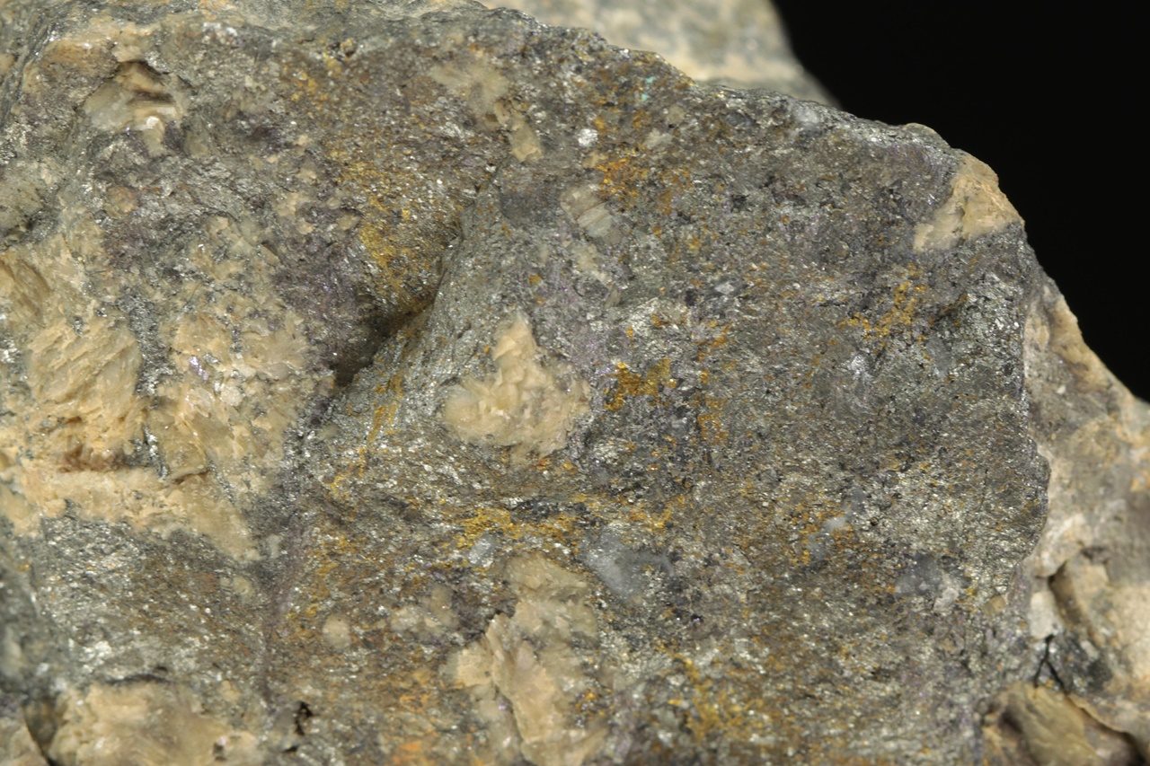 Großes Muster des massiven, metallisch glänzenden Schwazits – ein Quecksilber-reicher Tetraedrit mit beige Siderit und weißem Quarz aus dem Bergwerk Maria.