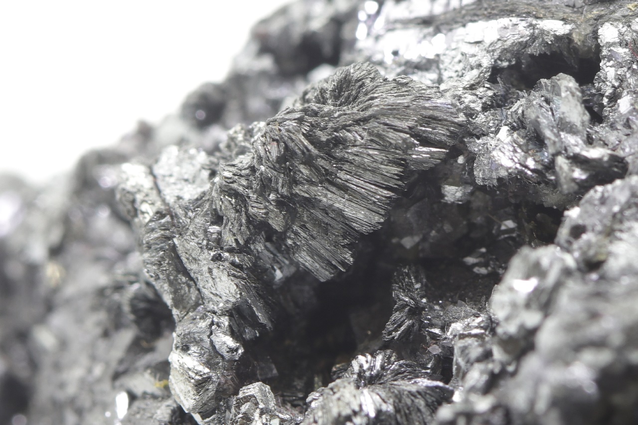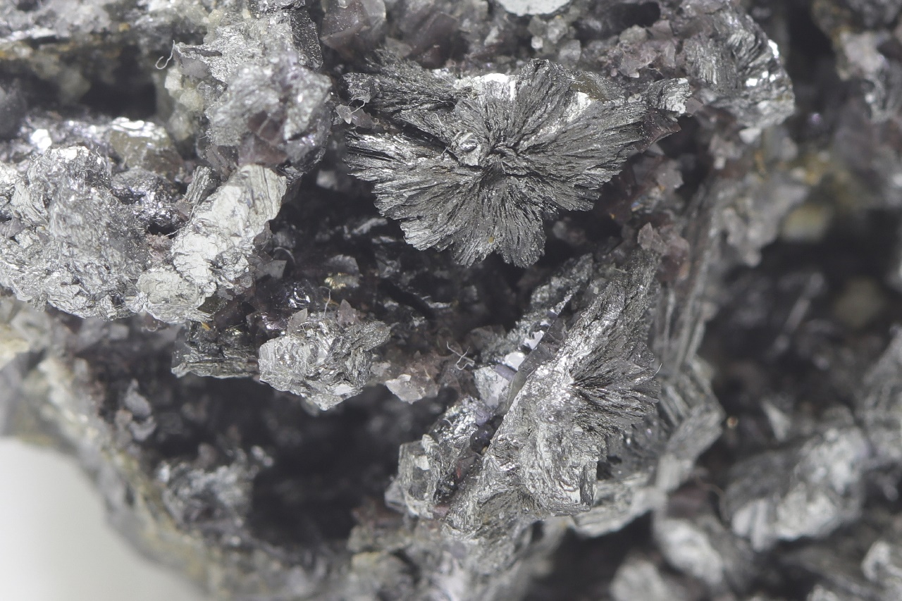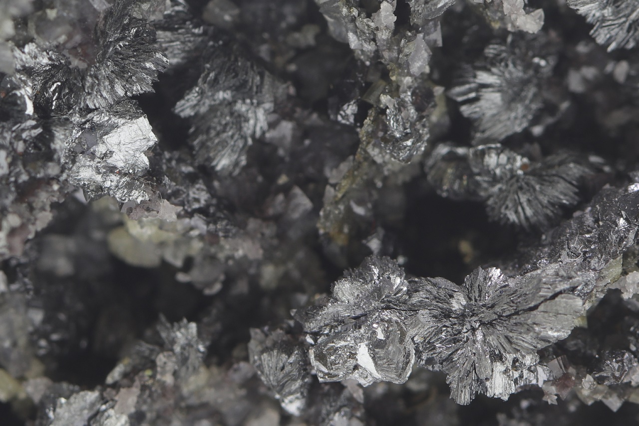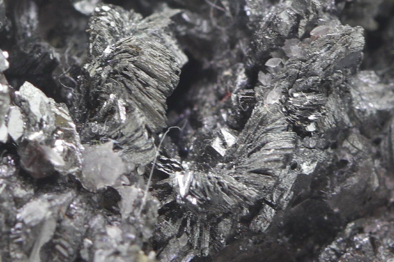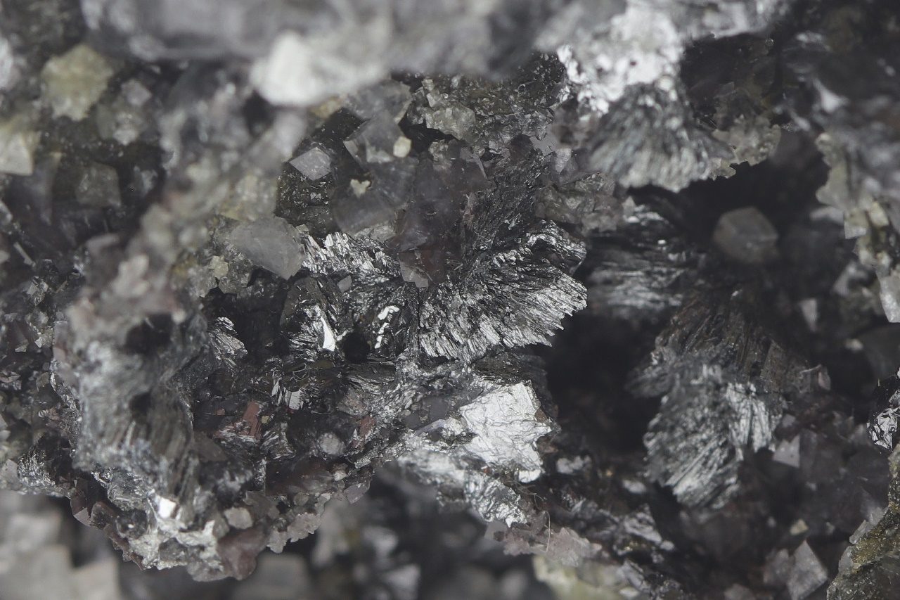 Sehr reicher Muster fächerförmiger Aggregate von tabularem Semseit, der auf schwarzem Sphalerit gewachsen ist.