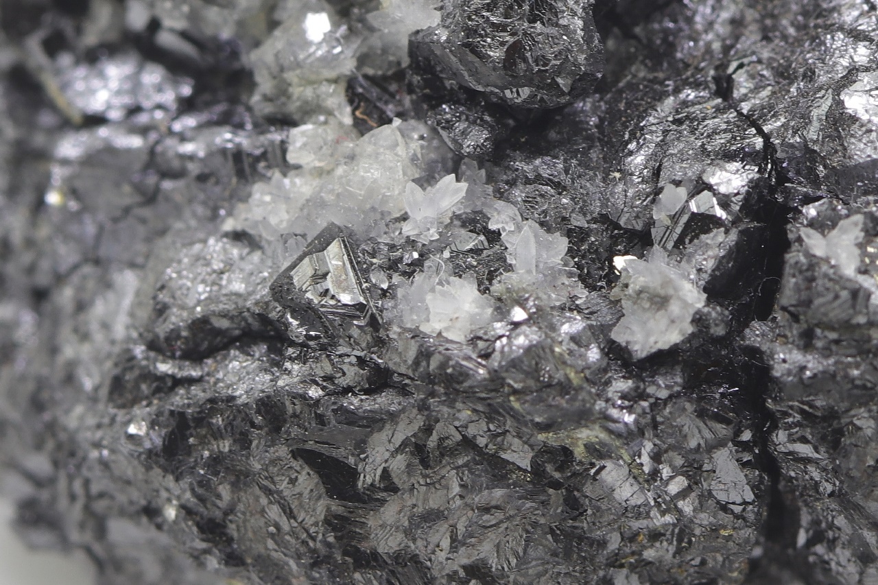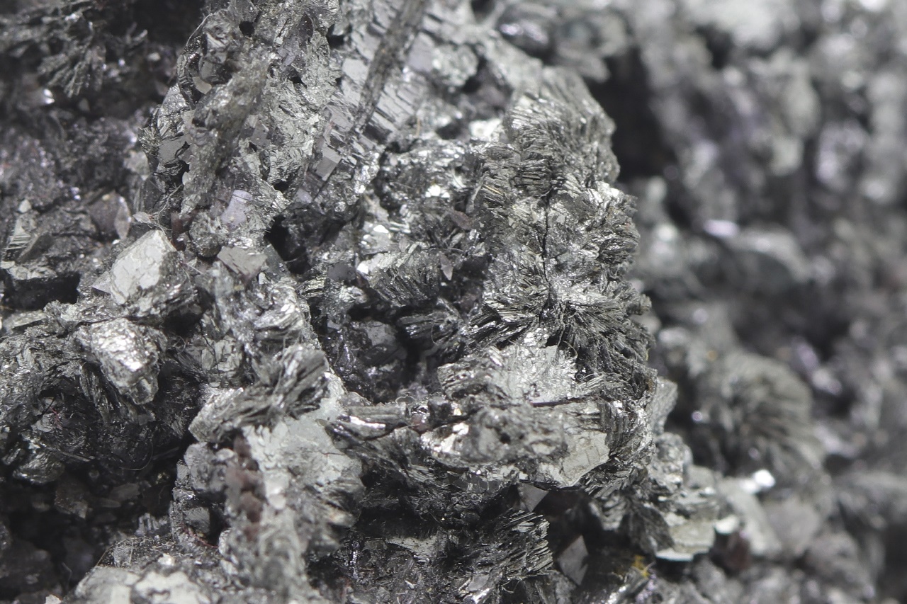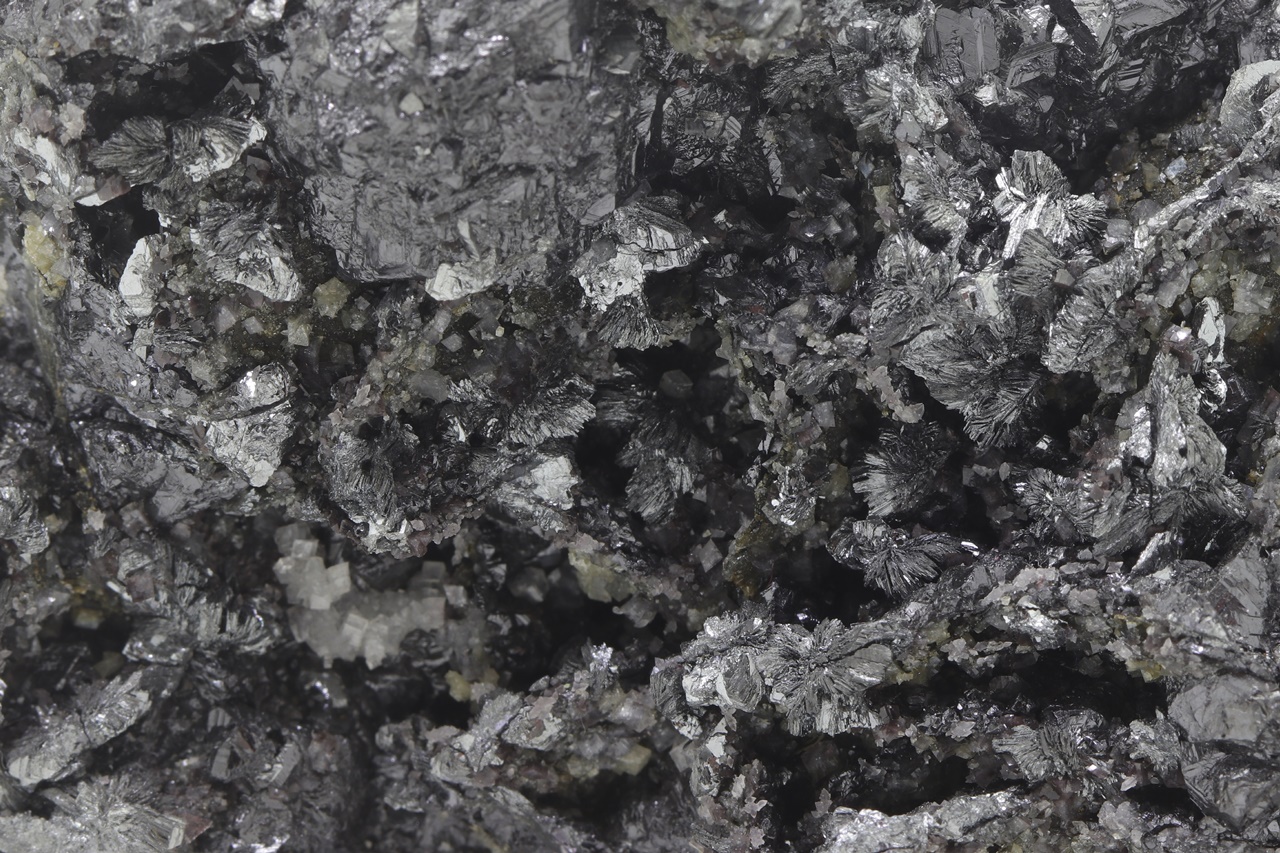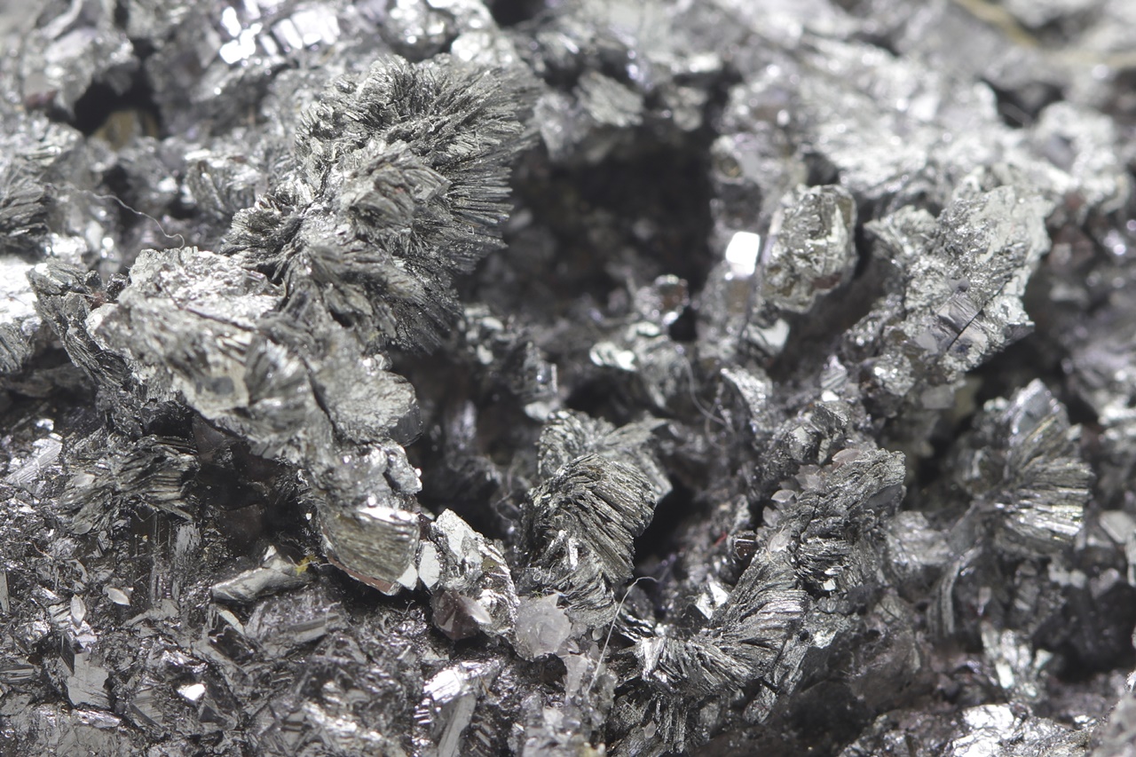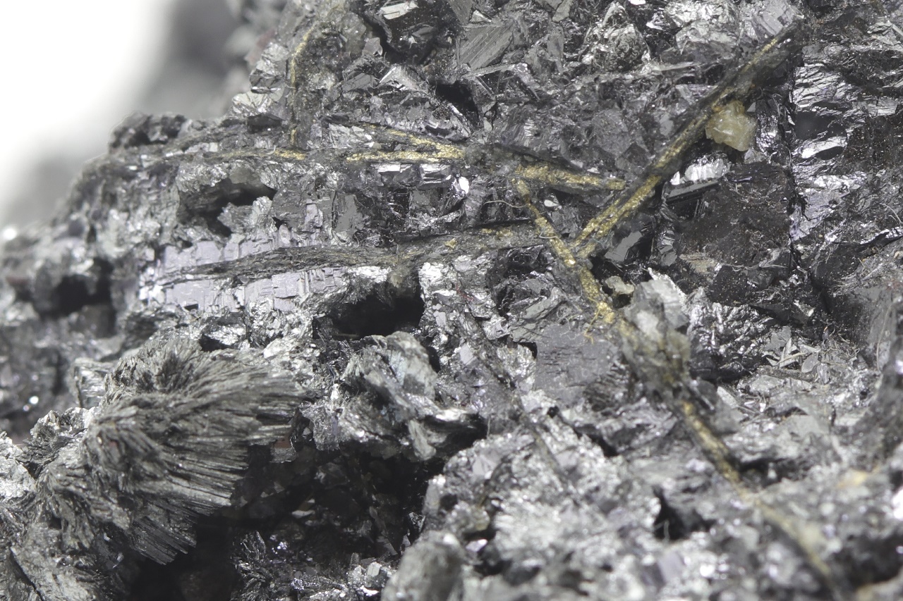 Sehr reicher Muster fächerförmiger Aggregate von tabularem Semseit, der auf schwarzem Sphalerit gewachsen ist.