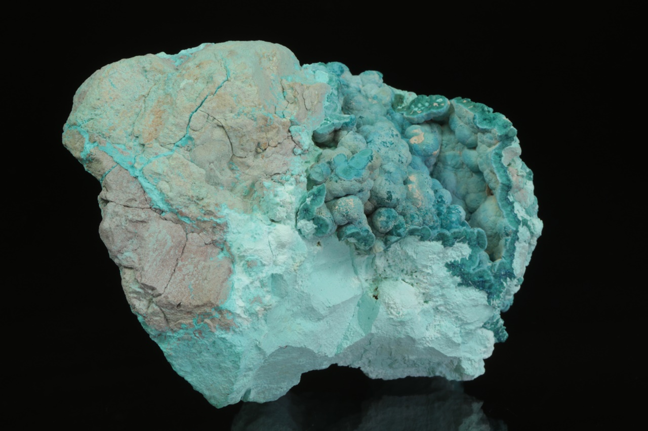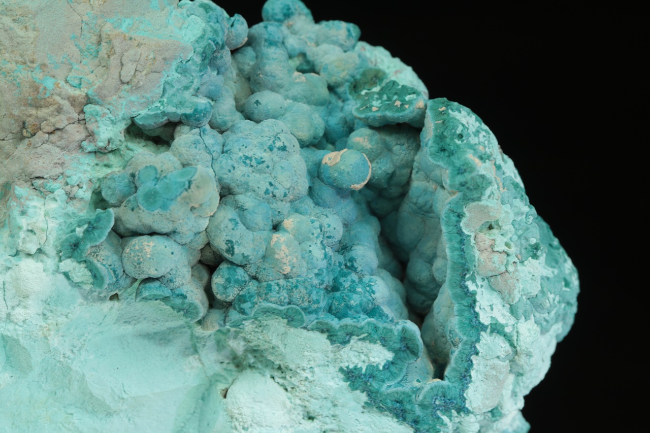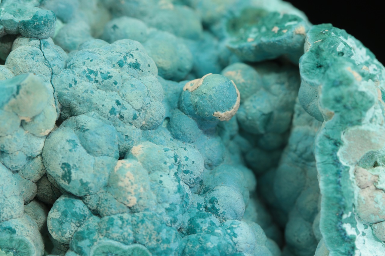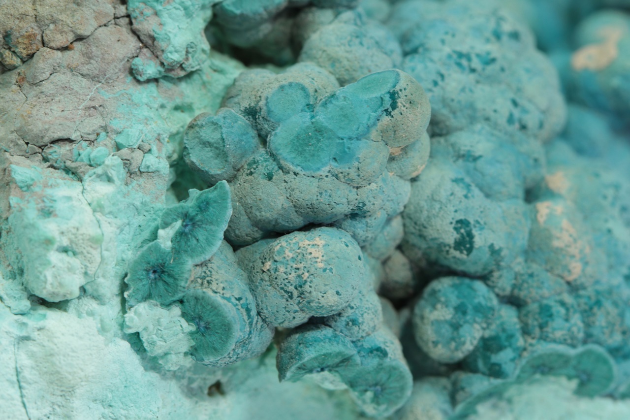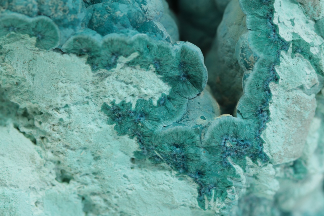 Dutina bohatě vyplněná radialními agregáty, ve kterých je původní tmavě modrý shattuckit od kraje pseudomorfován světle modrým chrysokolem. Rozměry dutiny jsou 4,5 × 4 cm.
